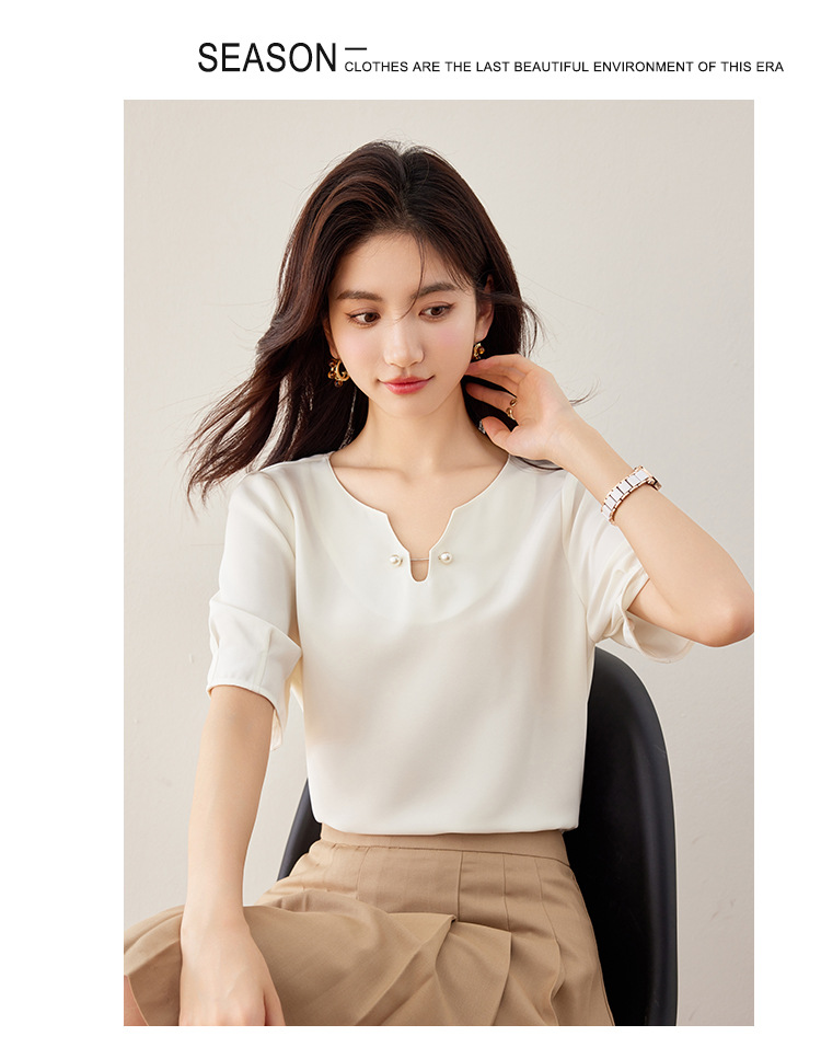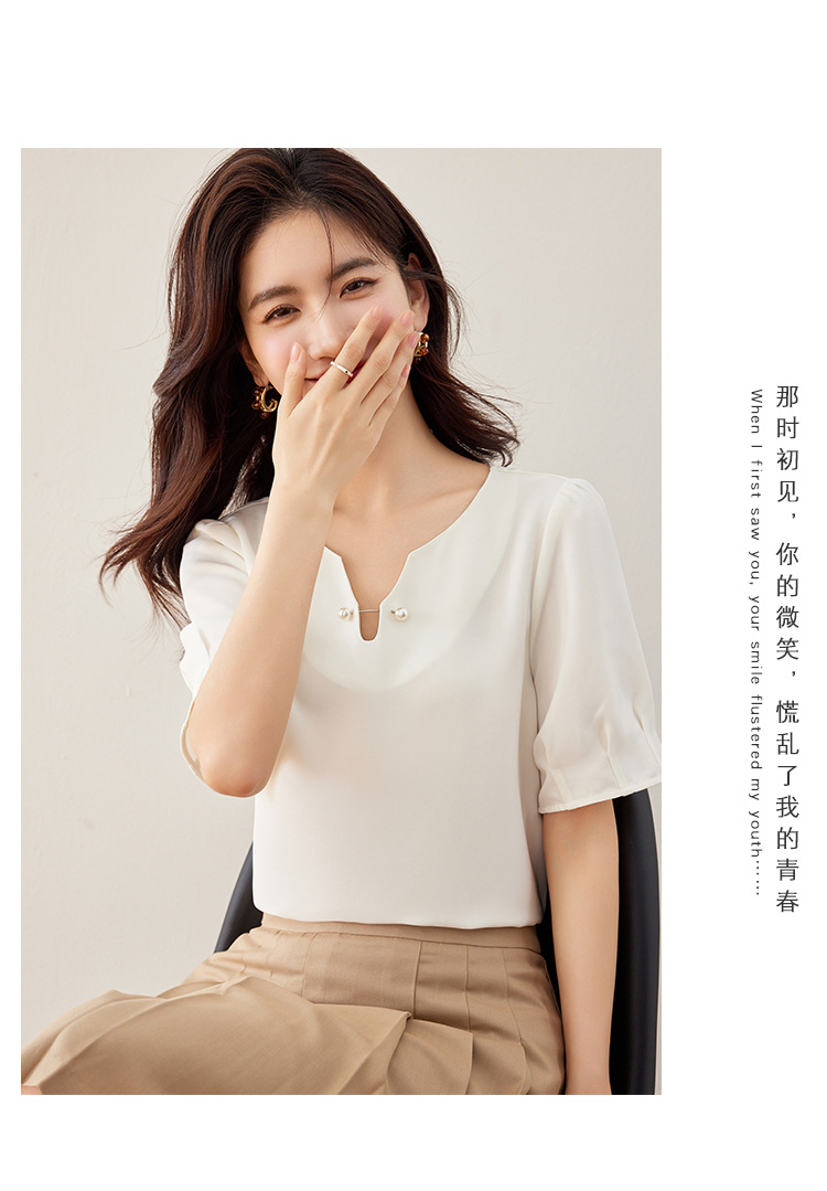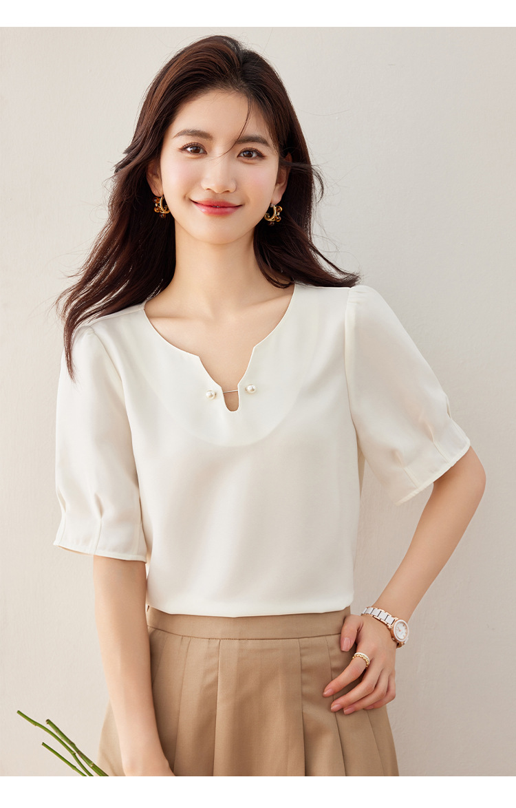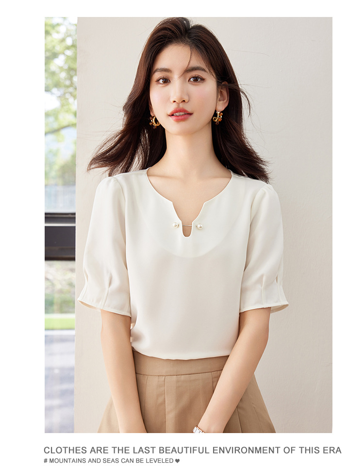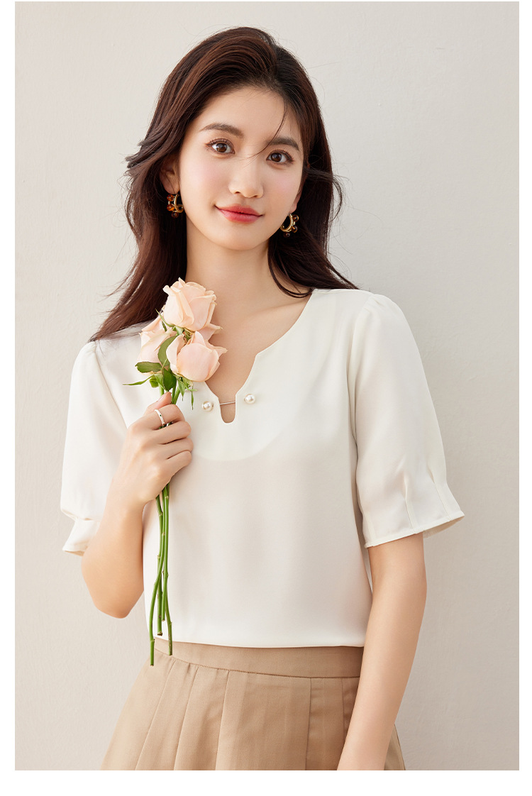 2024 여름 새로운 프랑스 스타일 우아한 V 넥 펄 버클 핀 아름다운 풀오버 버블 반팔 쉬폰 셔츠