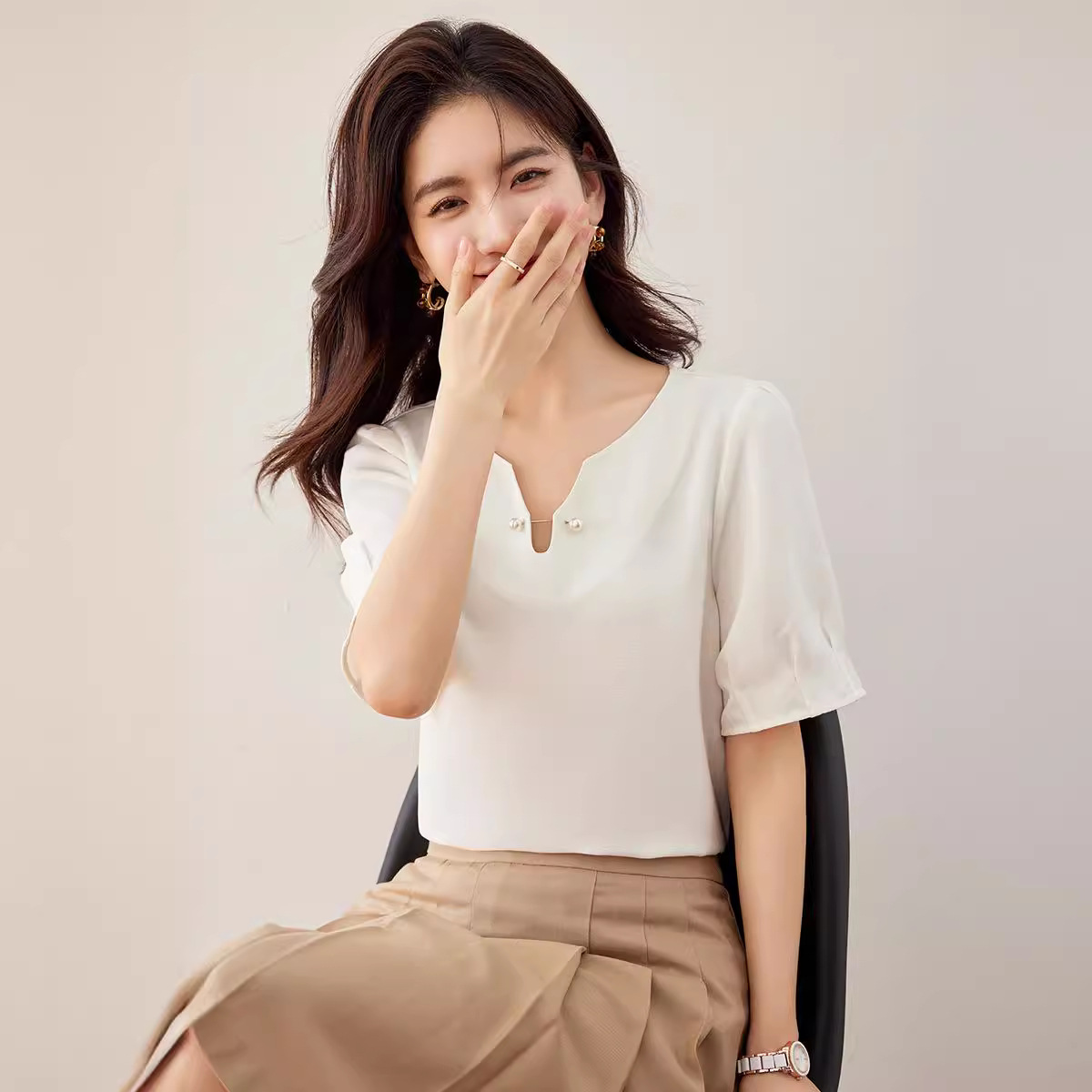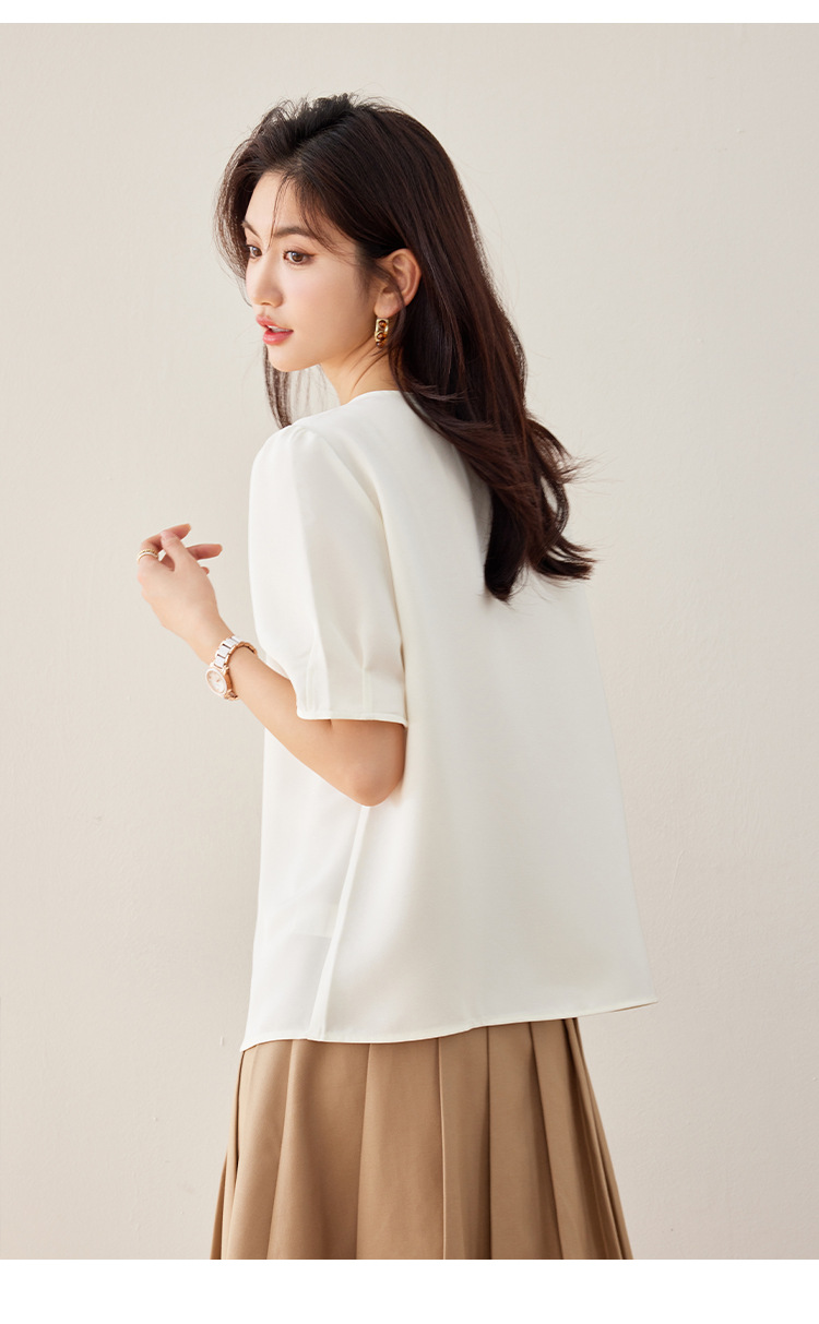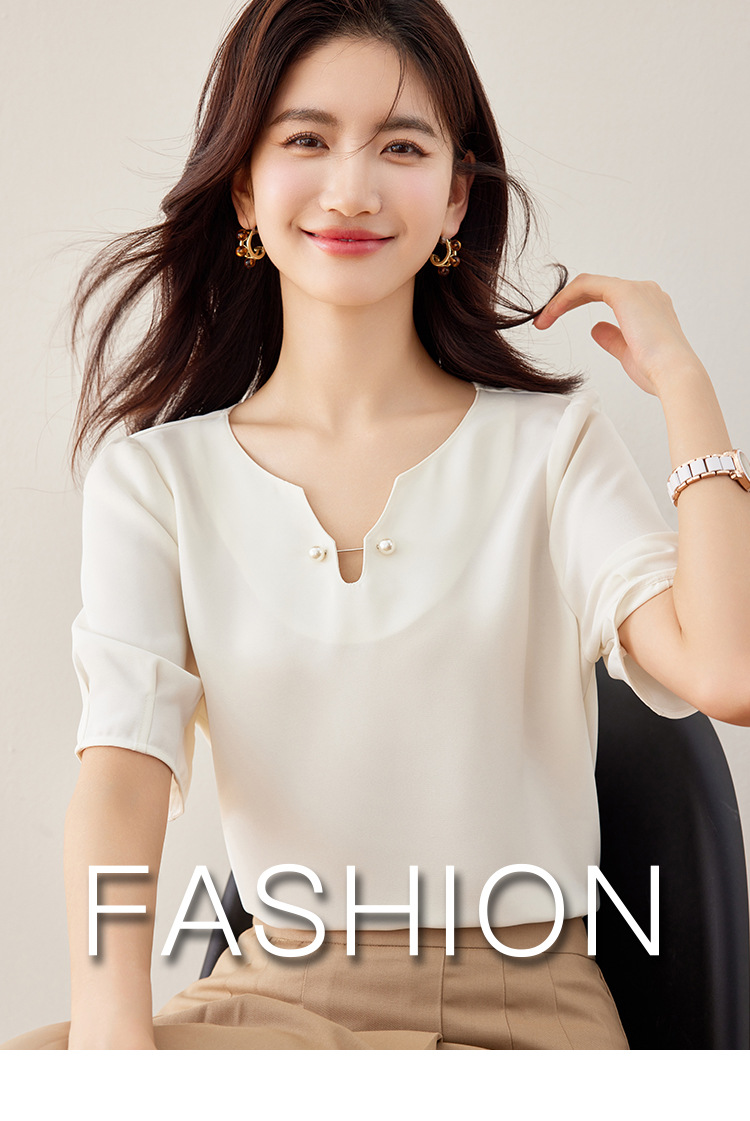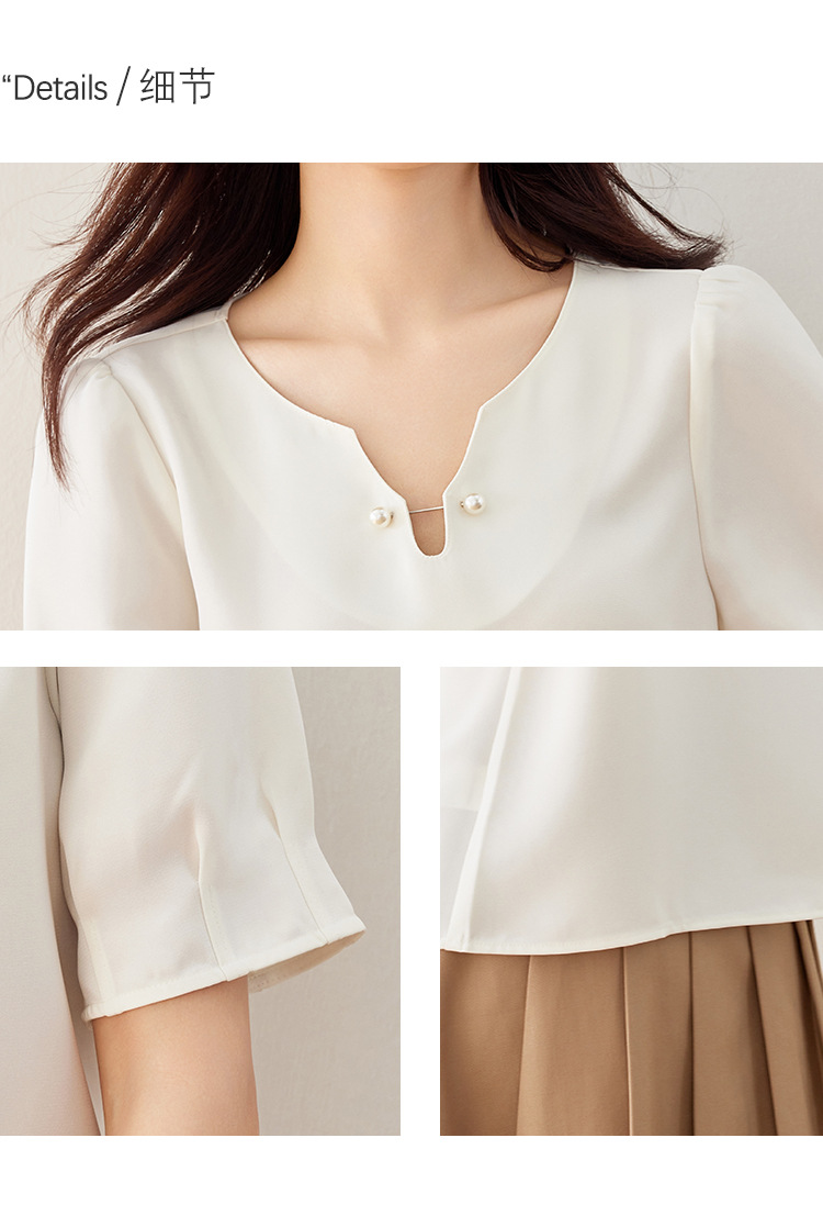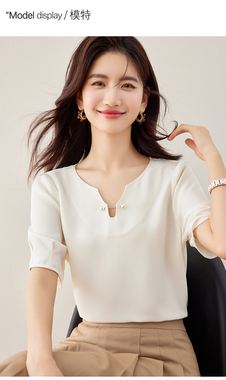 2024 여름 새로운 프랑스 스타일 우아한 V 넥 펄 버클 핀 아름다운 풀오버 버블 반팔 쉬폰 셔츠