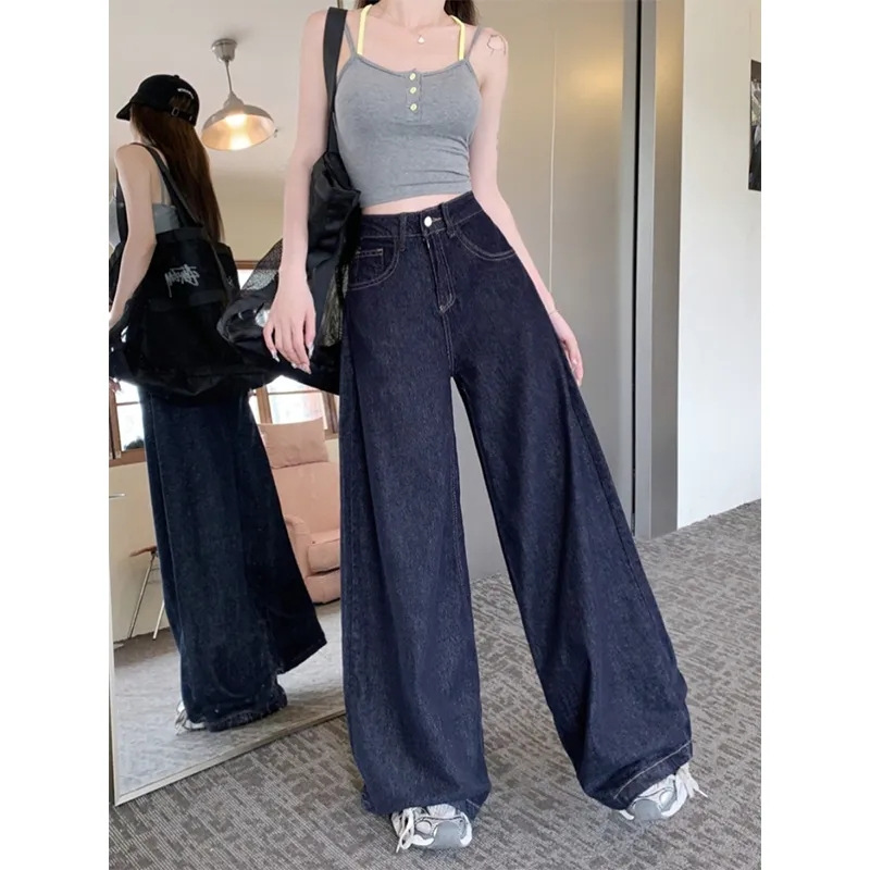 아메리칸 스타일 빈티지 다크 블루 청바지 여성용 스파이스 걸스 짧은 높은 허리 넓은 다리 바지 스트레이트 트렌디 바지스토어 가기