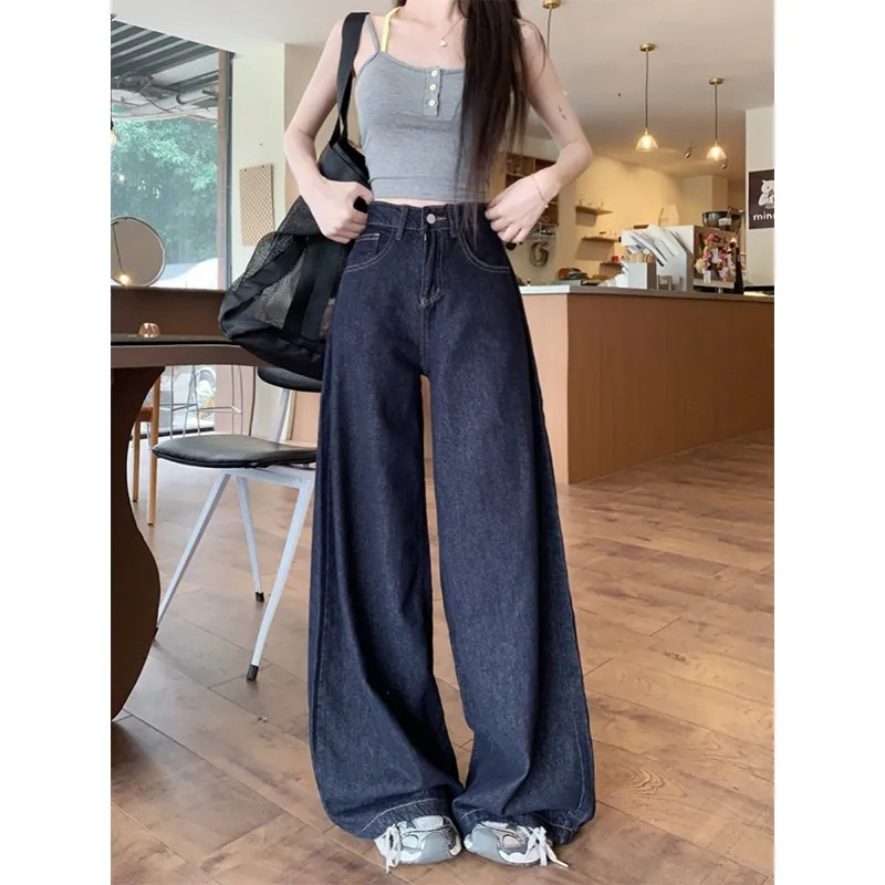 아메리칸 스타일 빈티지 다크 블루 청바지 여성용 스파이스 걸스 짧은 높은 허리 넓은 다리 바지 스트레이트 트렌디 바지