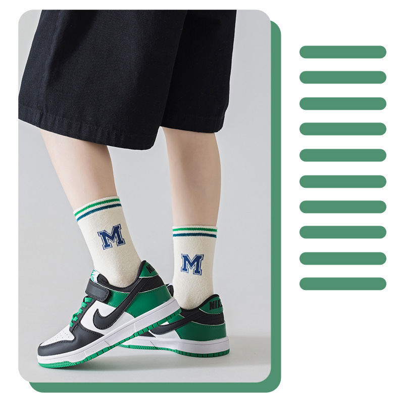 minliu儿童袜子绿色潮流运动袜男女童中筒袜少年字母潮袜秋季棉袜