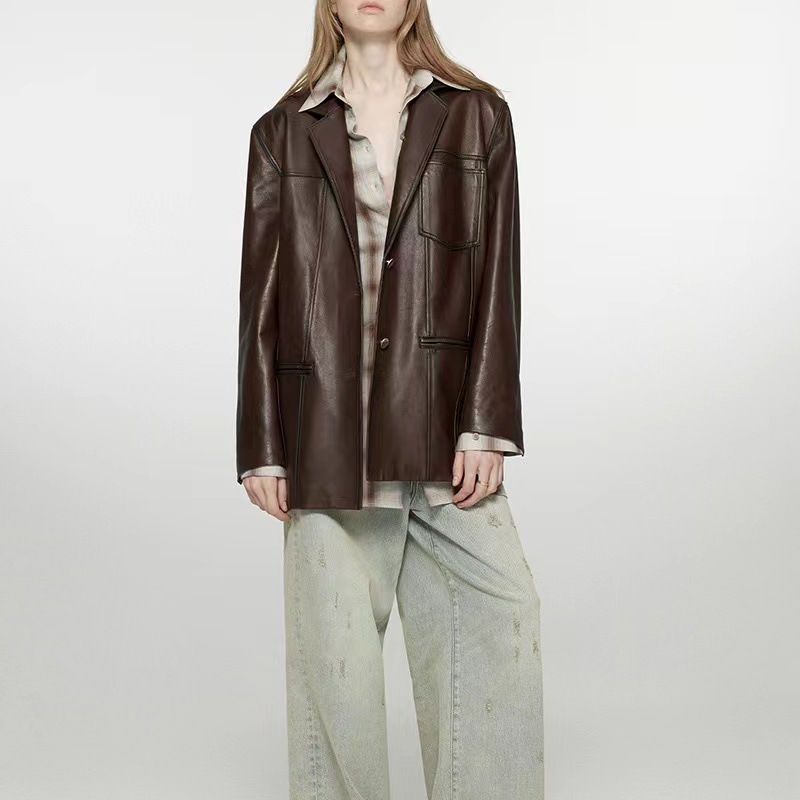 가죽 서쪽 야채 탄화 정품 가죽 세트 가죽 자켓 여성 골동품 검은 양가죽 자켓 봄과 가을 중간 길이