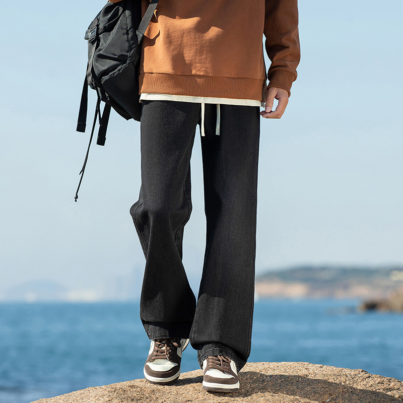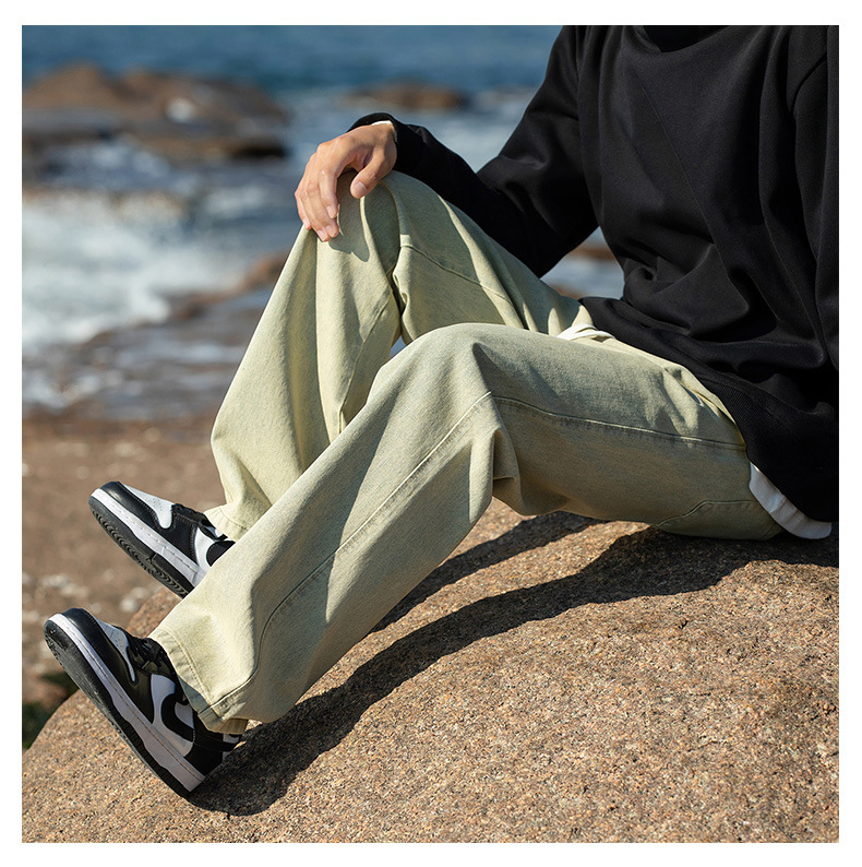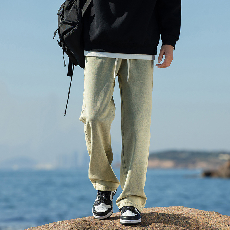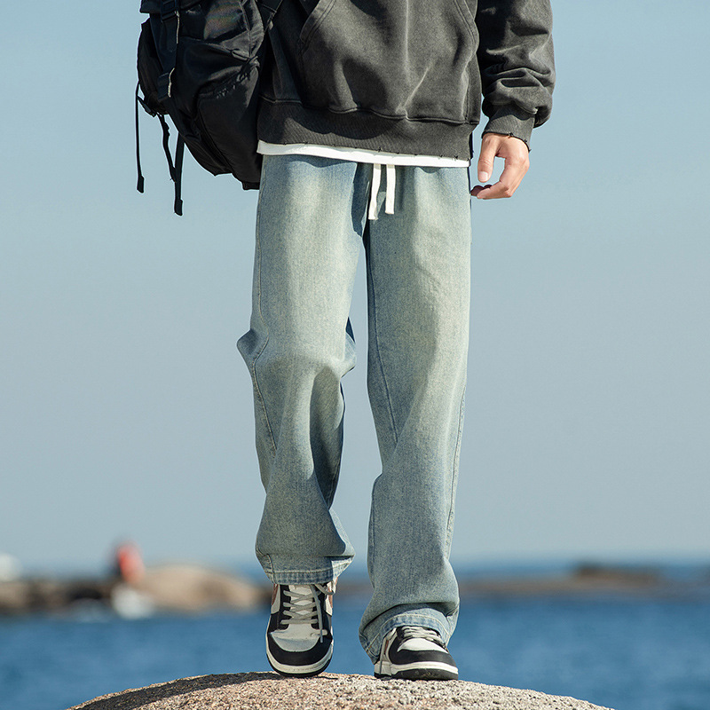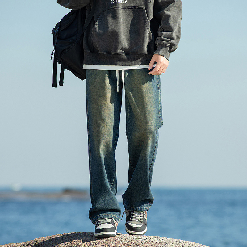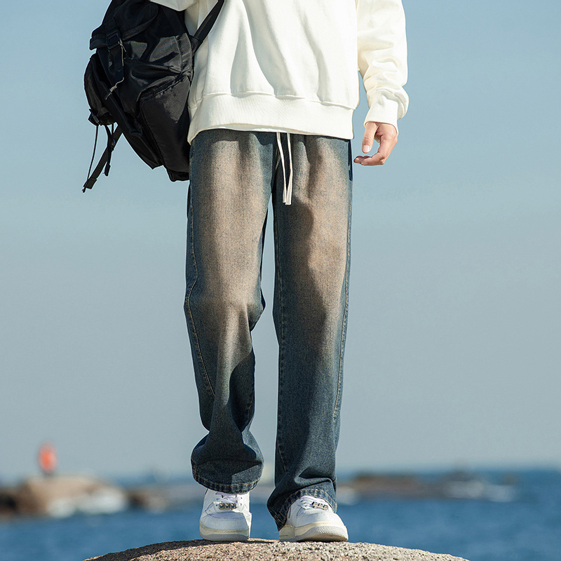 IZEXX 패션 브랜드 가을 세탁 된 툴링 청바지 남성용 느슨한 마이크로-라 하이 엔드 캐주얼 롱 바지