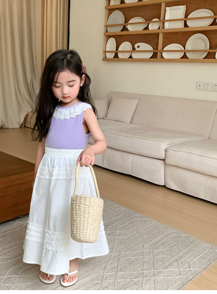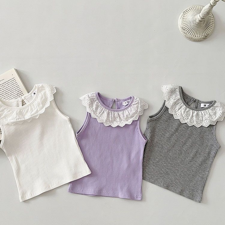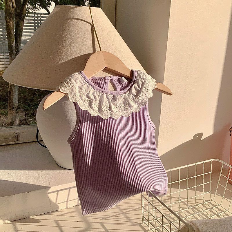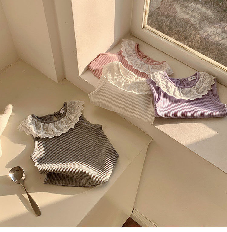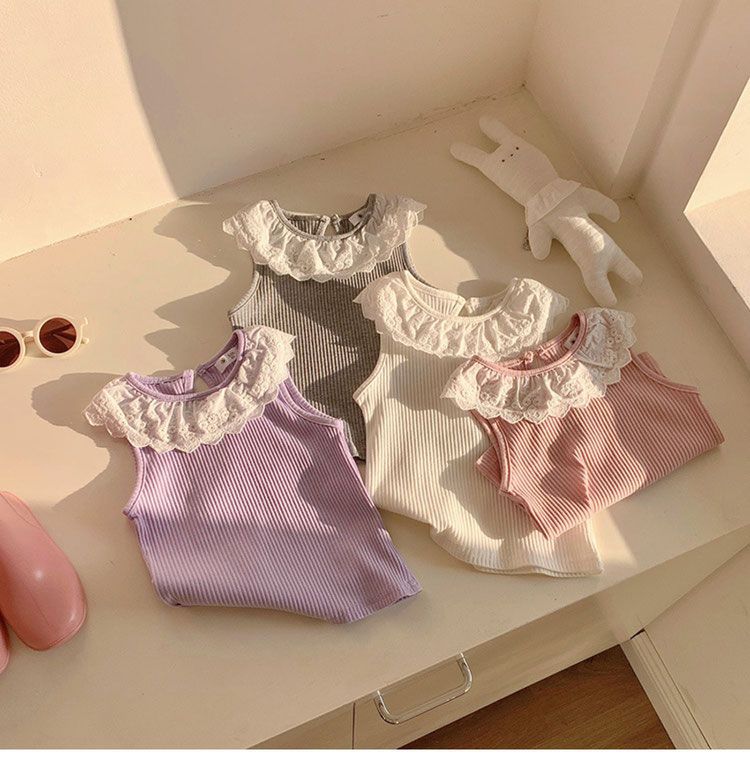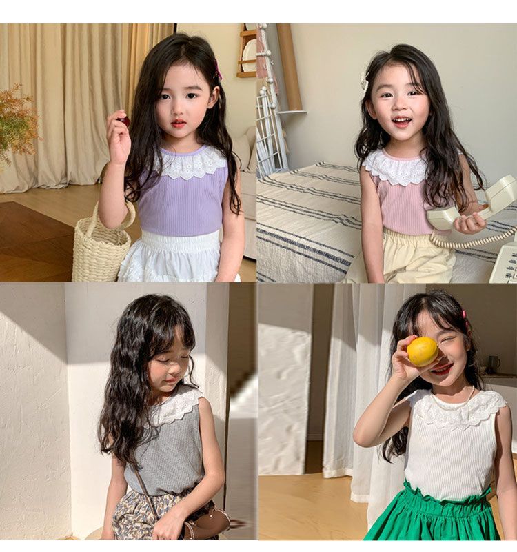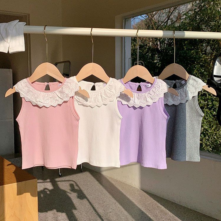 2024 년 새로운 여름 소녀 레이스 조끼 아기 소녀의 러플 솔리드 컬러 스타일리스트 모든 경기 캐주얼 트렌디 중소 규모 어린이스토어 가기