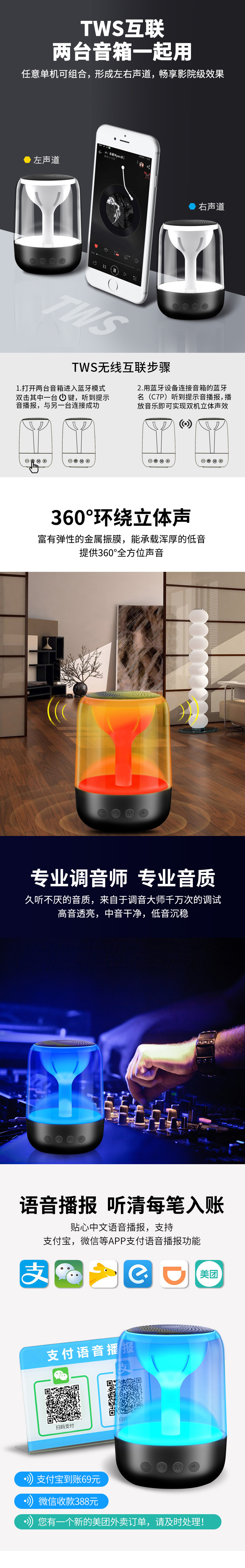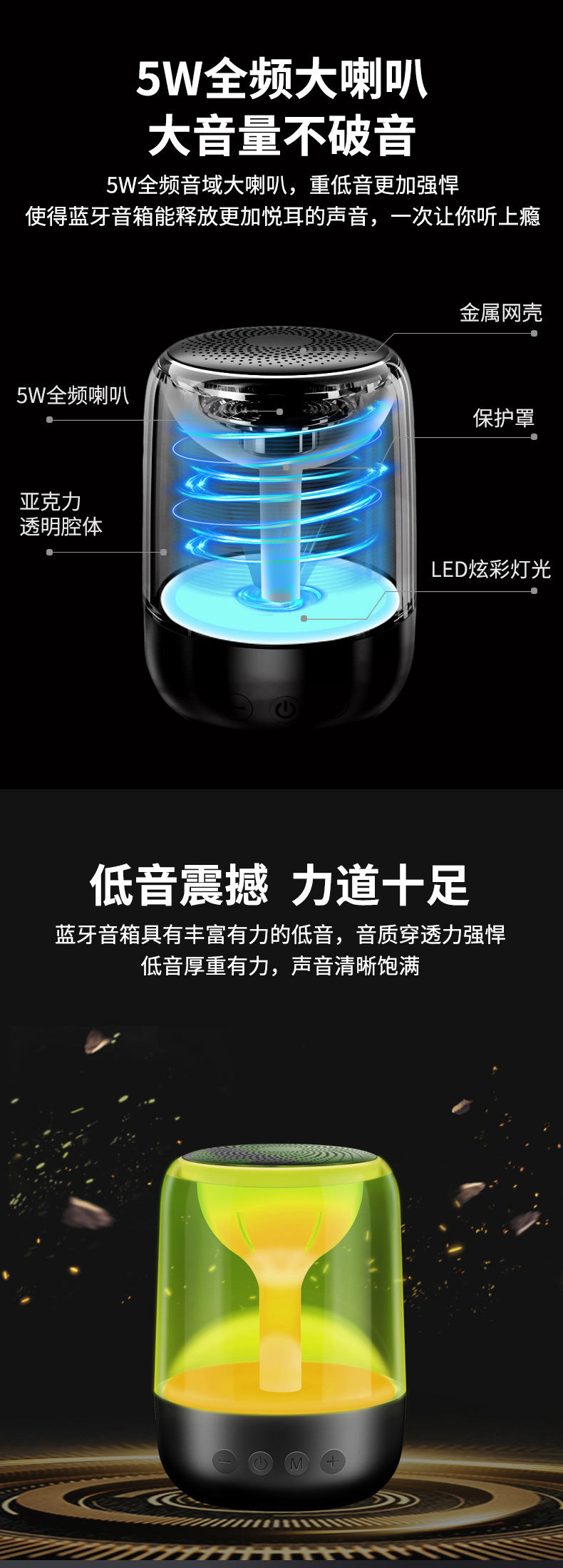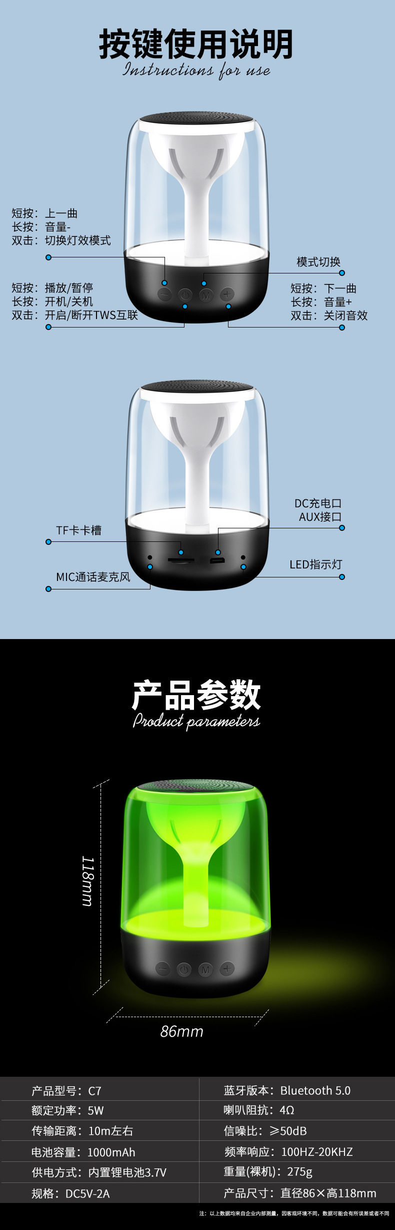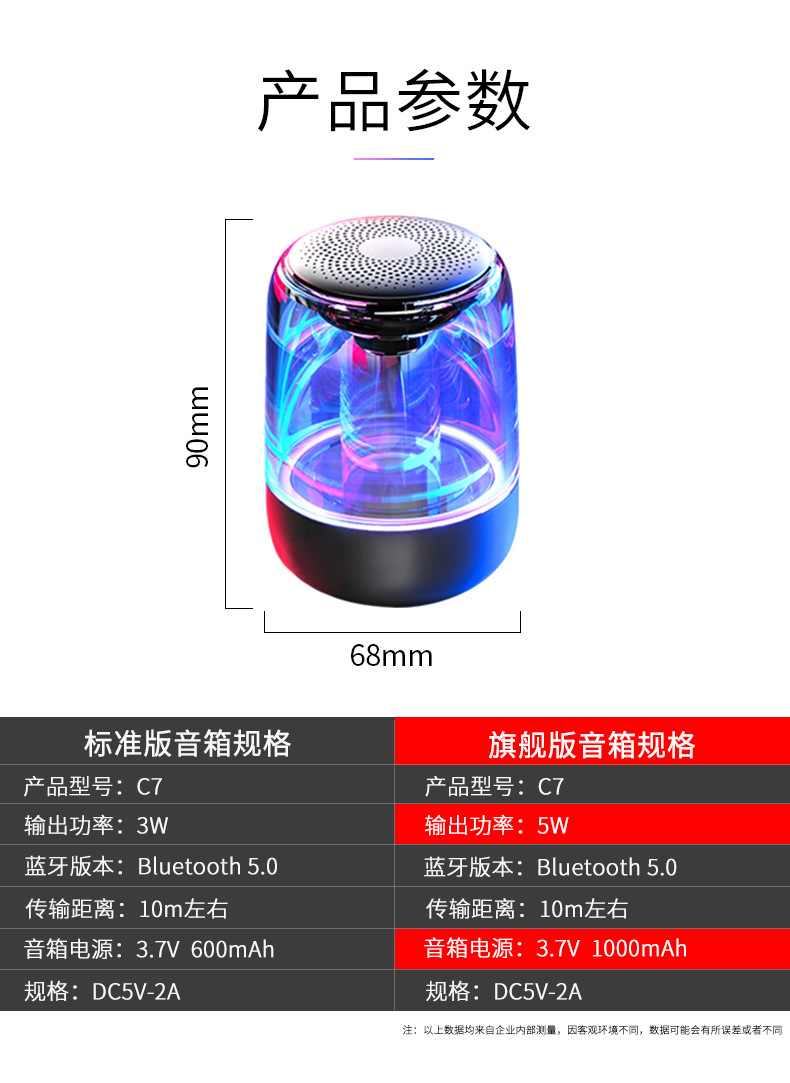 Yayunshi C7 무선 블루투스 스피커 서브 우퍼 휴대용 다채로운 조명 자동차 크리스탈 유리 국경 이베이스토어 가기