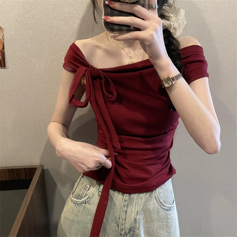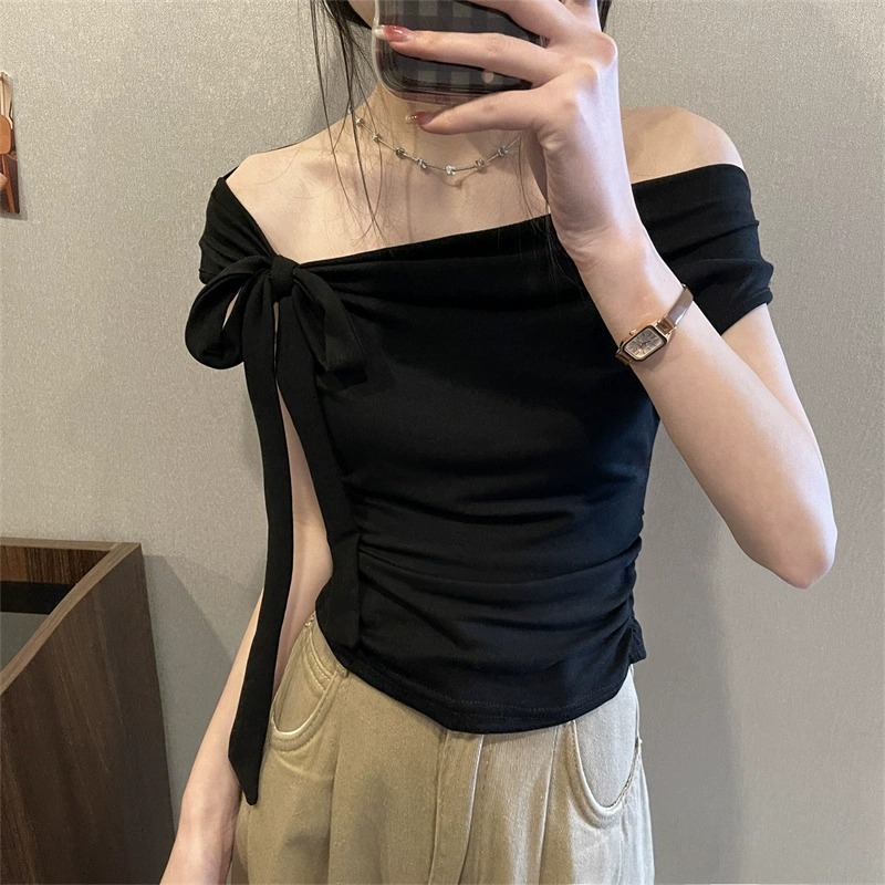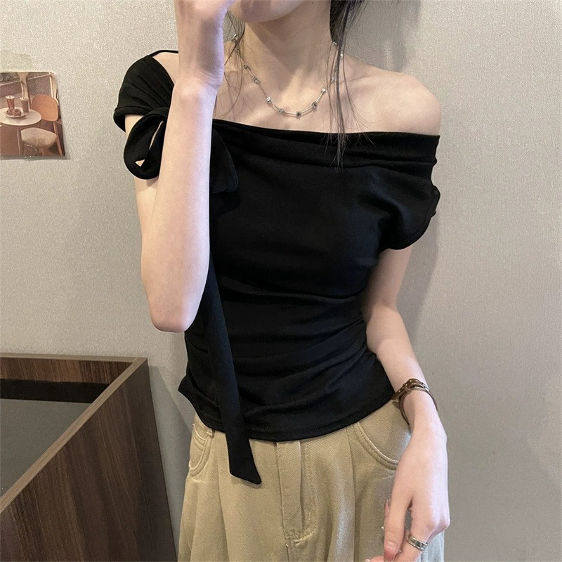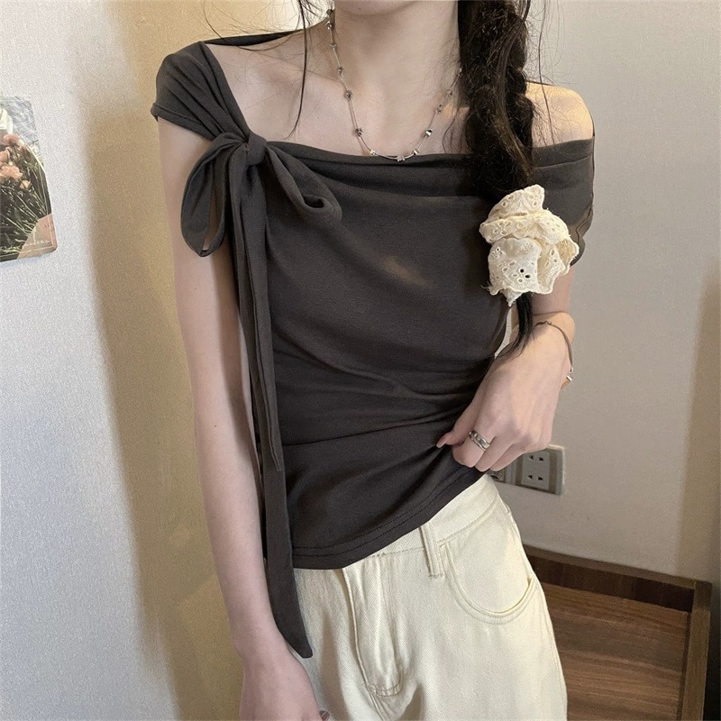 단어 어깨에 대한 순수한 욕망 ~ 디자인 감각 어깨 매달려 목 짧은 소매 티셔츠 여성의 여름 새로운 슬림 슬림 튜브 탑스토어 가기