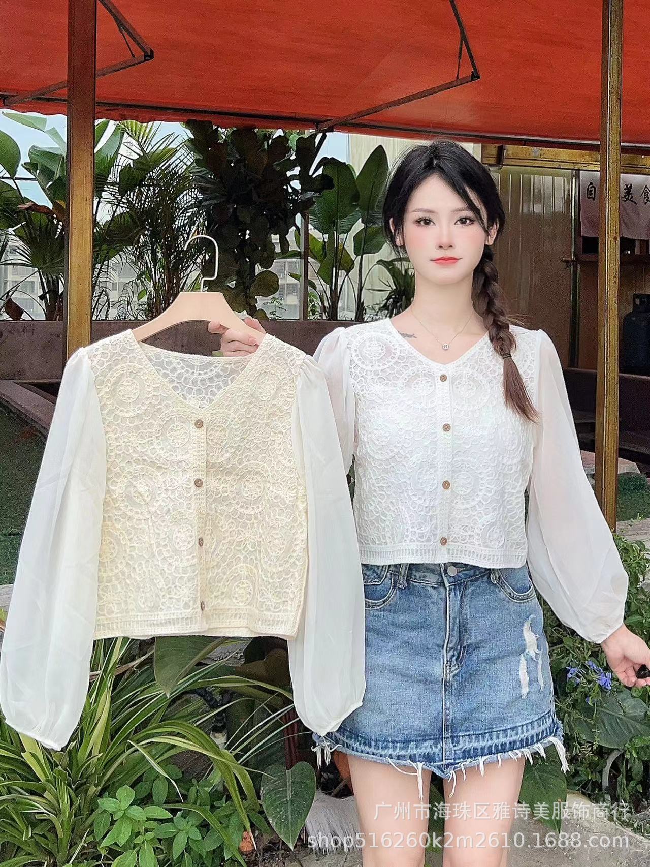 새로운 여성 젠틀 스타일 서양식 나이를 줄이는 긴팔 쉬폰 셔츠 여성용 여름 V 넥 할로우 아웃 퍼프 슬리브 니치 탑스토어 가기
