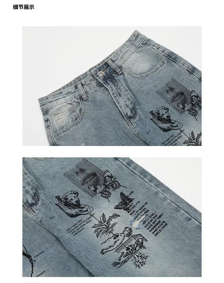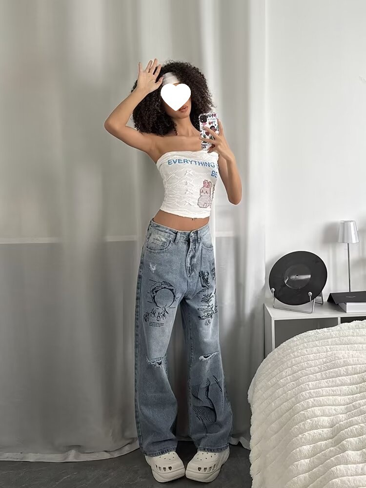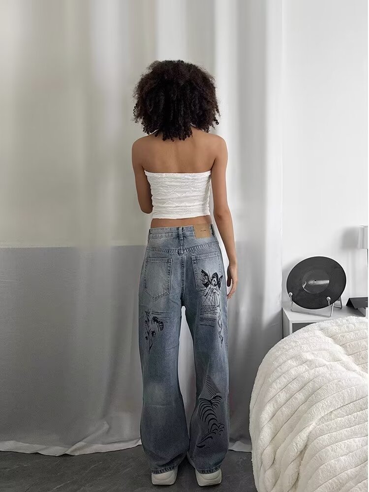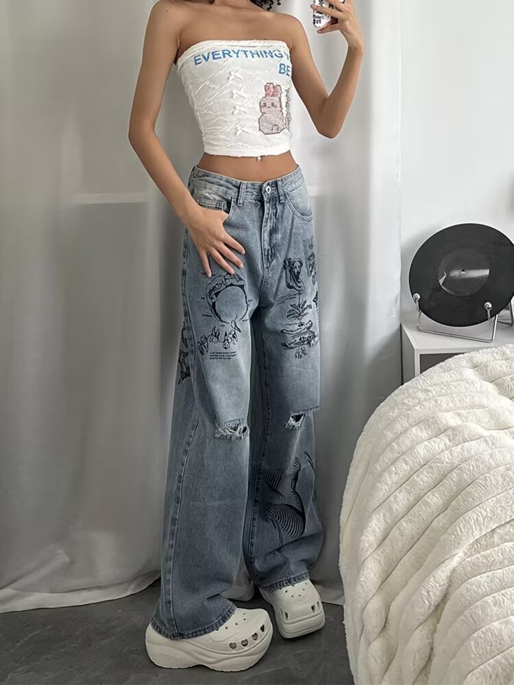 유럽 역 유럽 상품 여름 새로운 중공업 높은 허리 슬리밍 복고풍 낙서 넓은 다리 청바지 여성용 느슨한 스트레이트 다리 바지