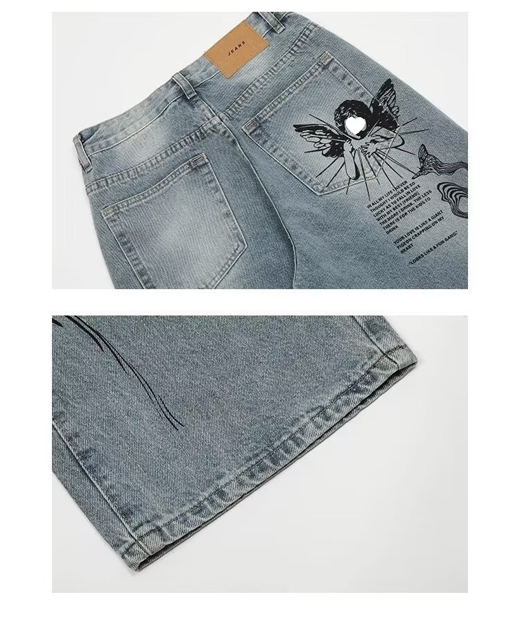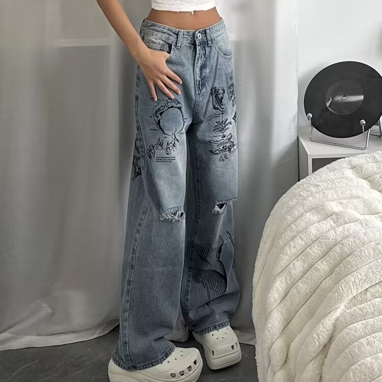 유럽 역 유럽 상품 여름 새로운 중공업 높은 허리 슬리밍 복고풍 낙서 넓은 다리 청바지 여성용 느슨한 스트레이트 다리 바지스토어 가기