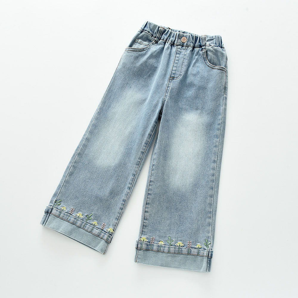 2024 가을 신상품 신축성 있는 허리밴드 여아 꽃자수 패셔너블 루즈핏 데님 팬츠 0705-02