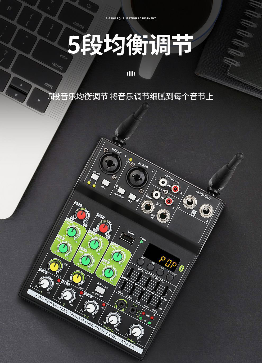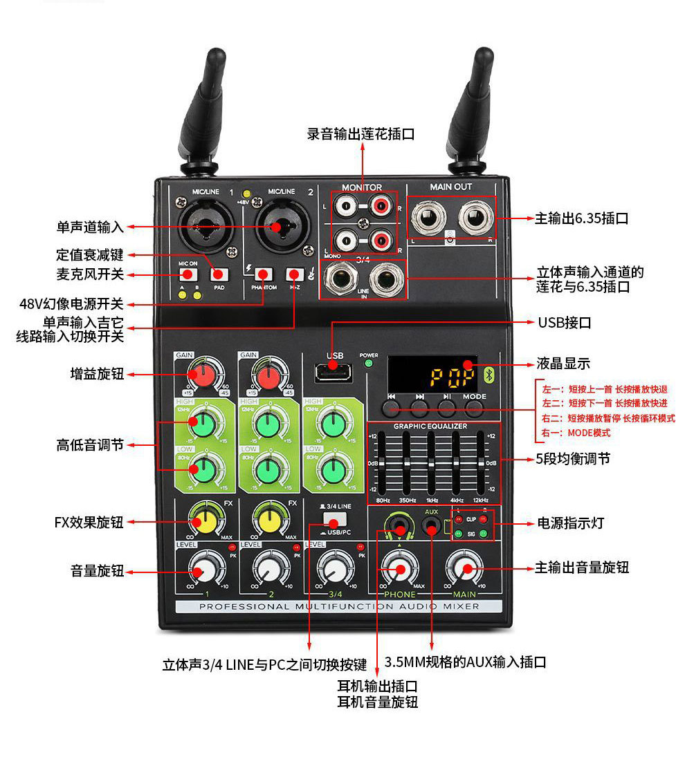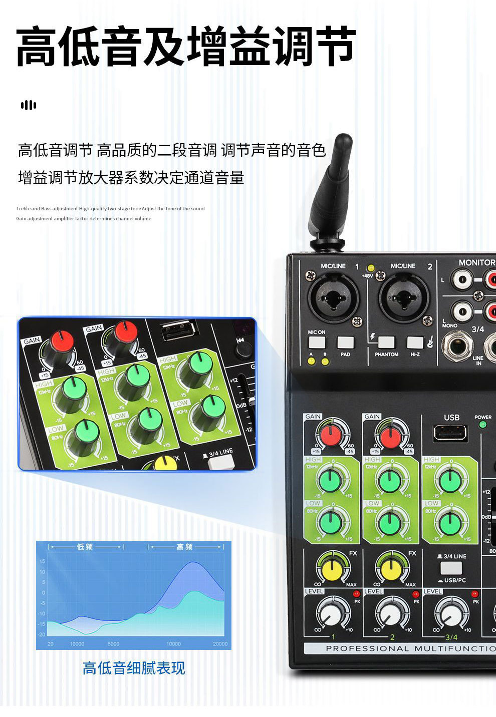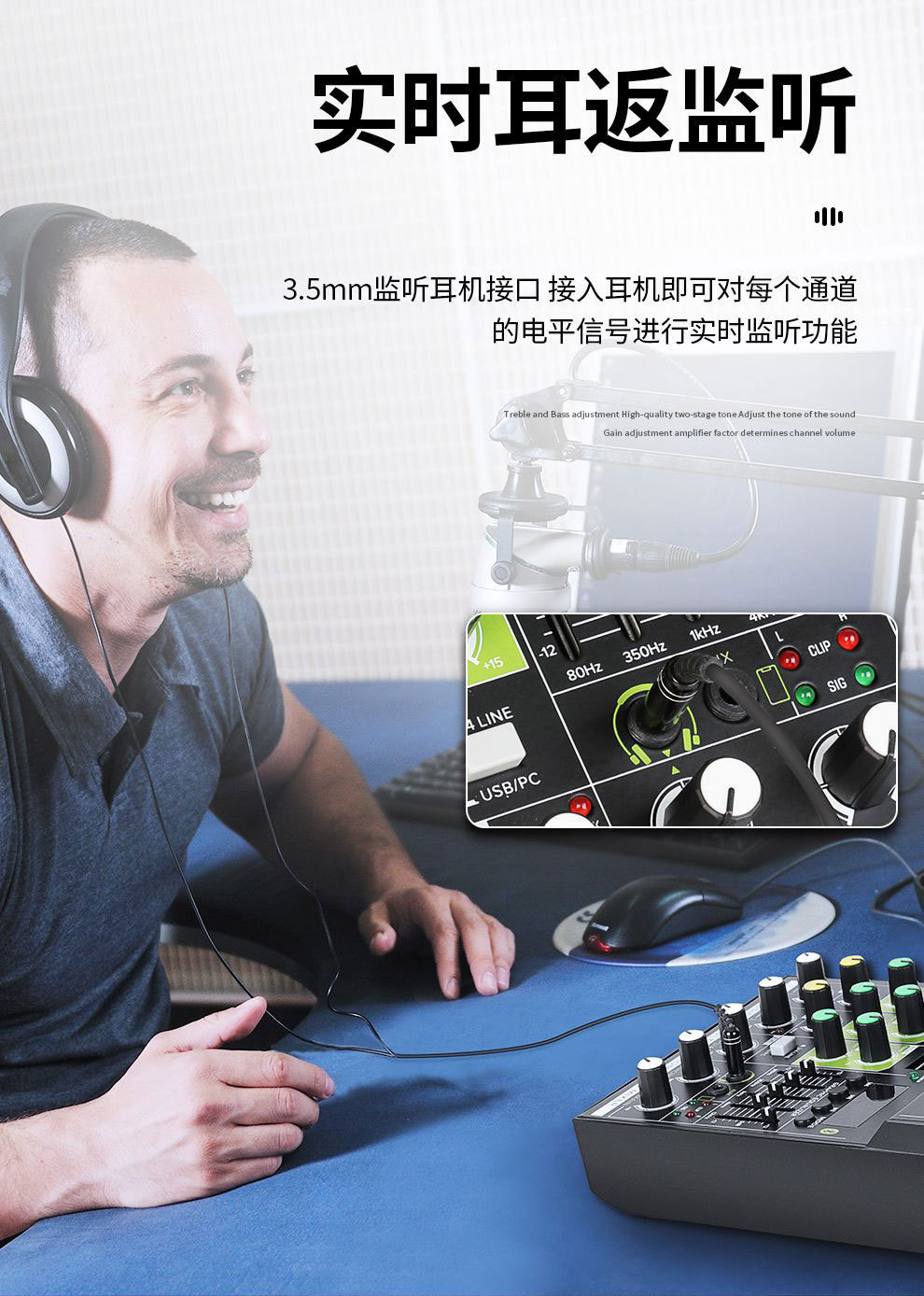 4路 带麦克风 带均衡 可连接耳机使用可连接电脑录音 适用于各种场合 可搭配声卡使用
