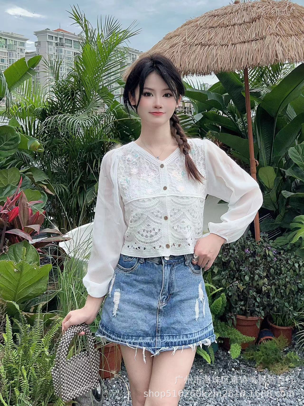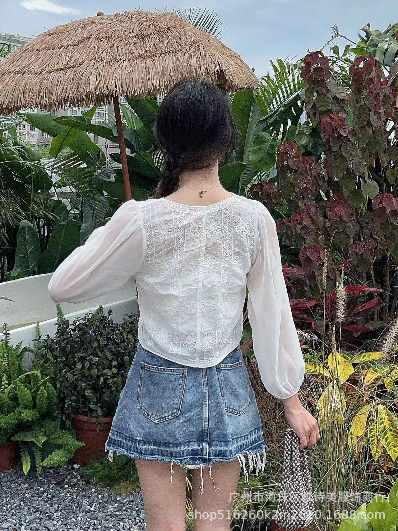 봄과 여름 한국 스타일 중공 크로 셰 뜨개질 스티칭 쉬폰 셔츠 여성의 우아한 패션 레이스 루즈 퍼프 슬리브 올 매치 탑 트렌디스토어 가기