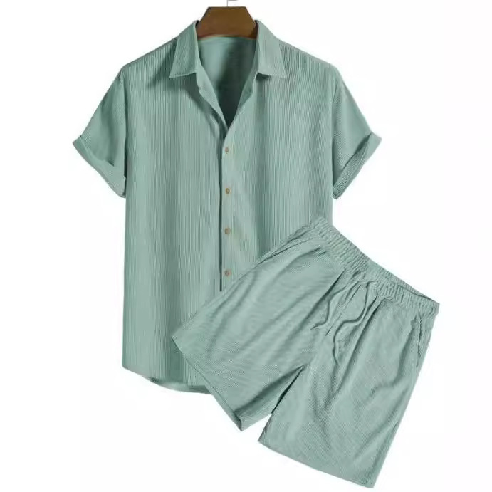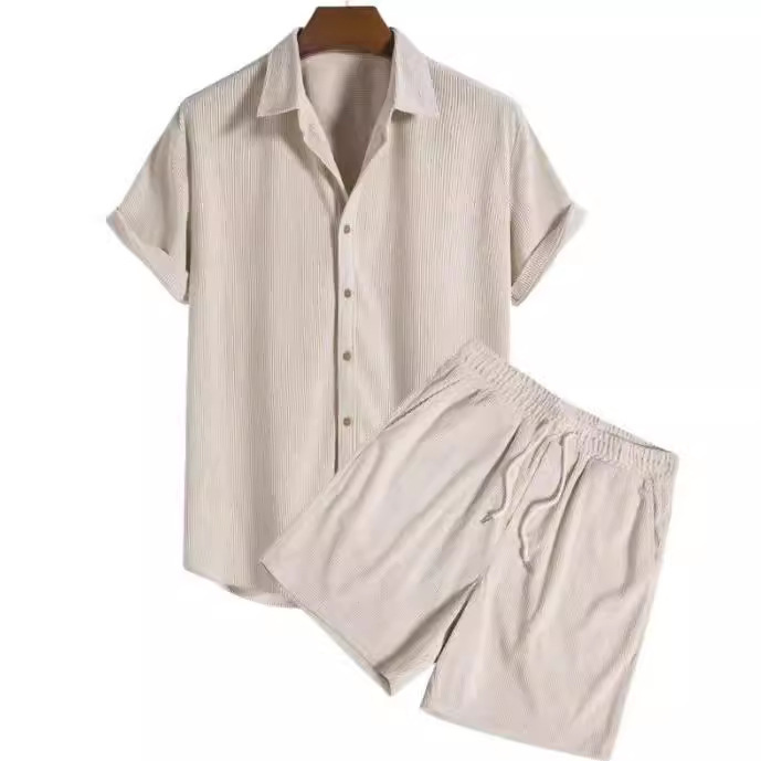 유럽과 미국의 AliExpress 대외 무역 독립 역 남성 캐주얼 느슨한 멀티 컬러 비치 착용 코듀로이 반팔 세트 투피스 세트