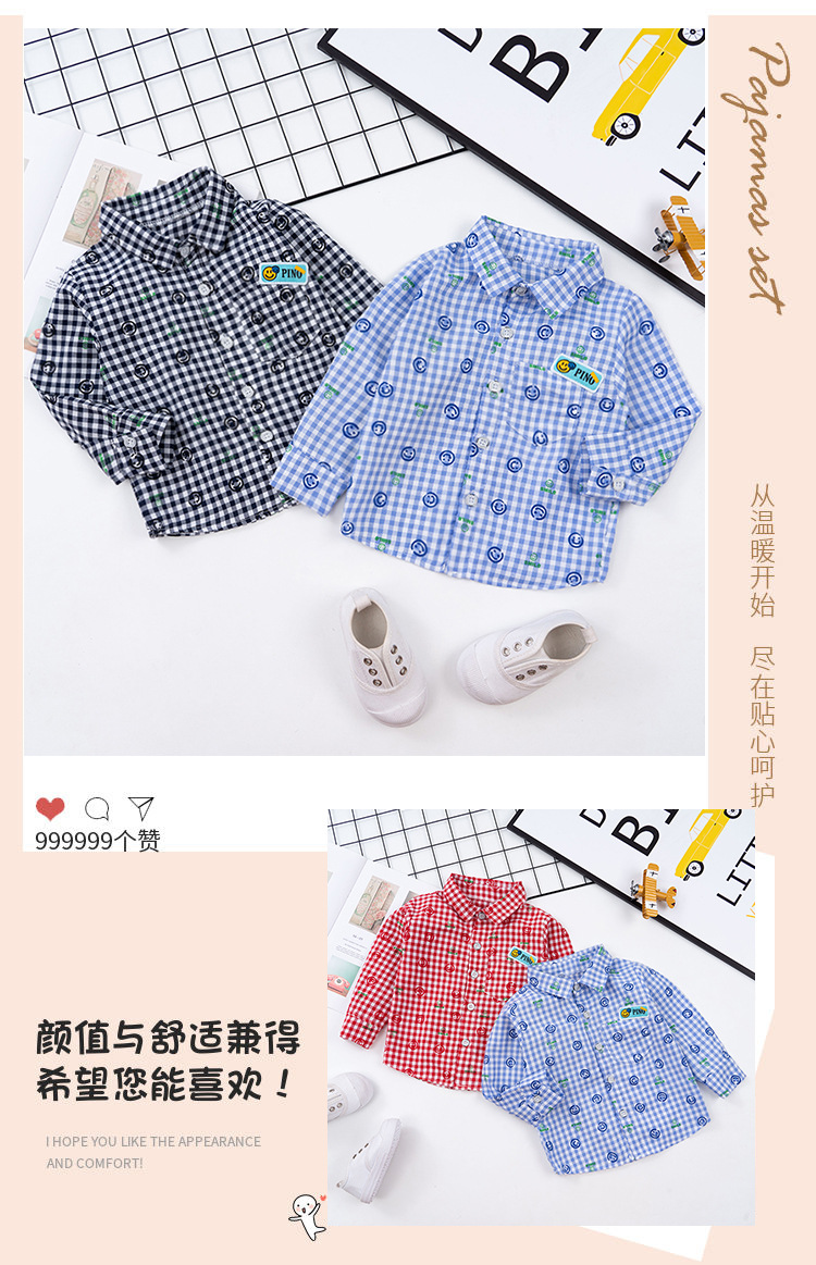 어린이 봄과 가을 옷 2024 새로운 소년 아기 봄 탑 세련된 격자 무늬 스마일리 긴 소매 셔츠스토어 가기