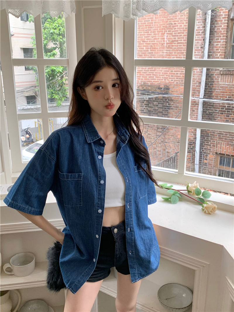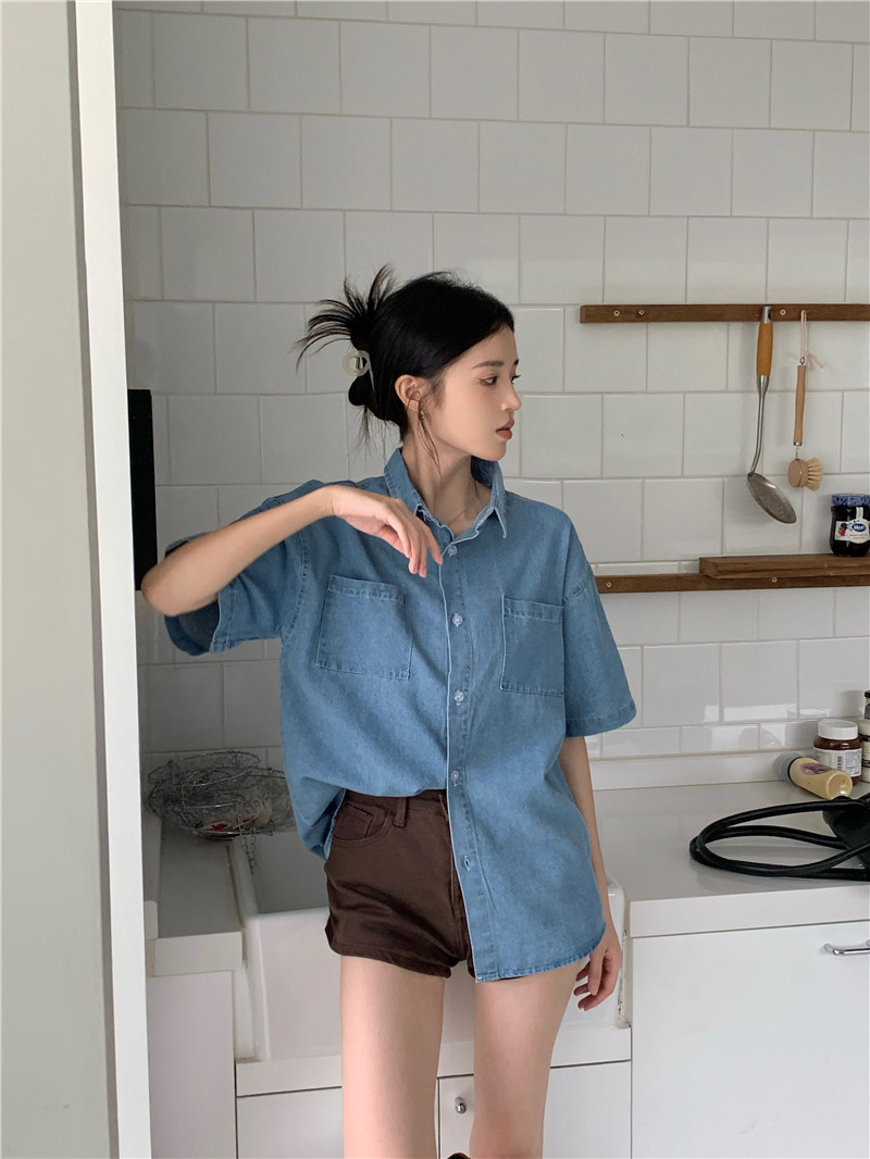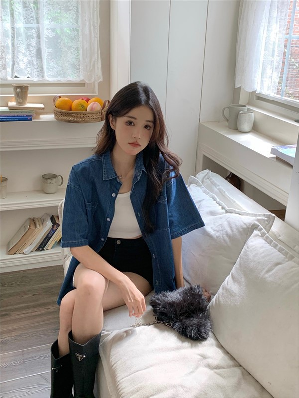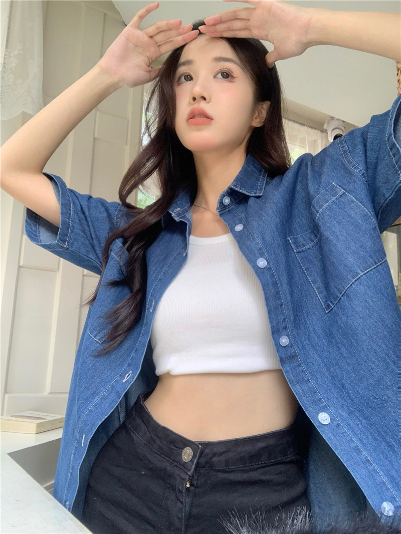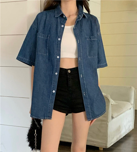 느슨한 짧은 소매 데님 셔츠 여성의 한국어 버전 2024 봄과 여름 레저 디자인 얇은 코트 재킷 공장 아울렛스토어 가기