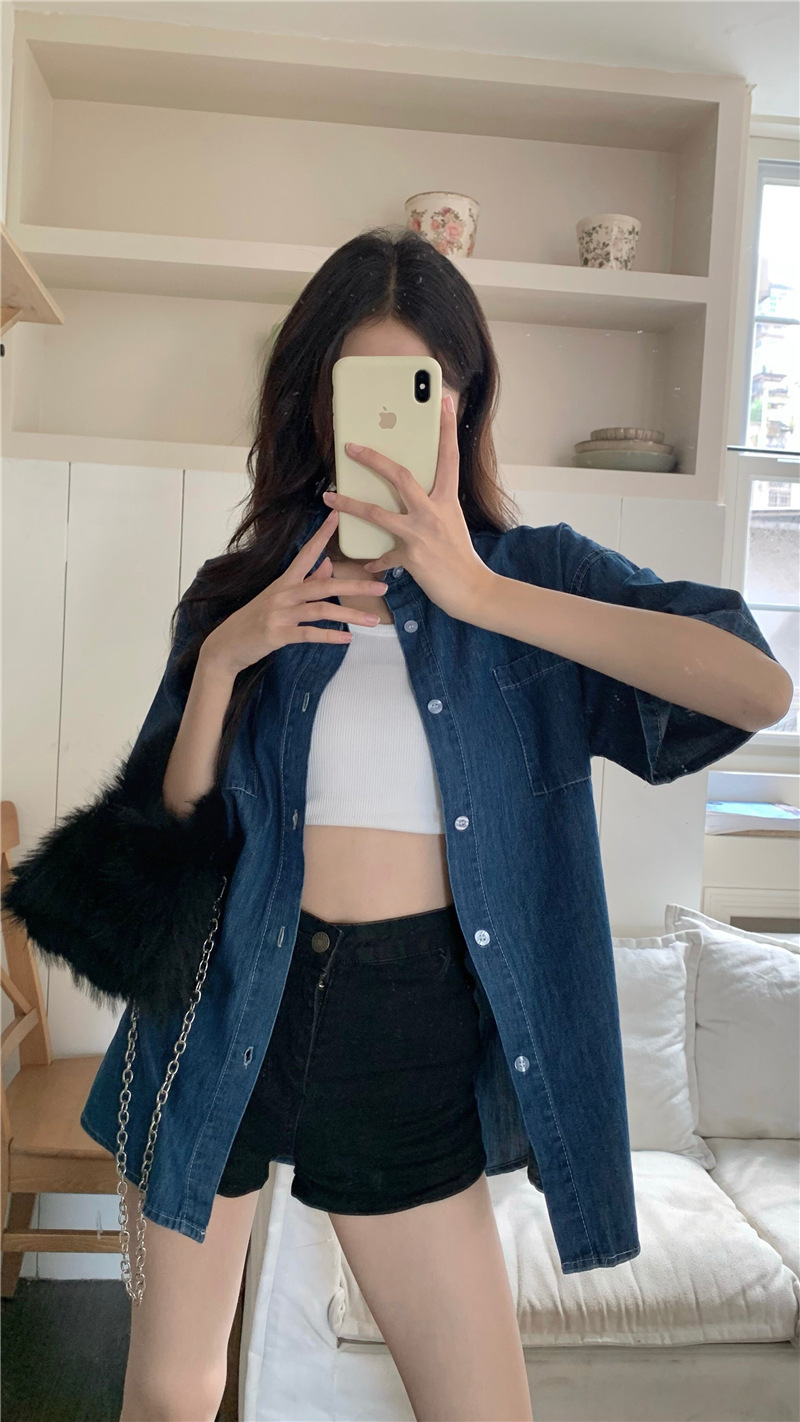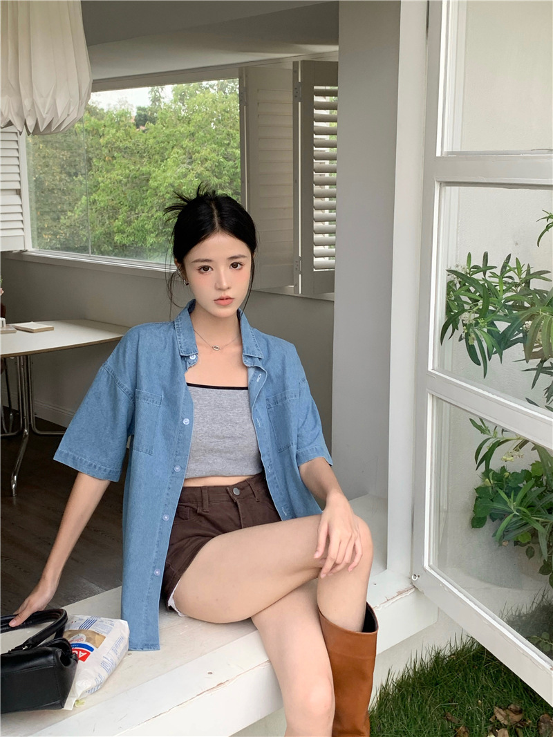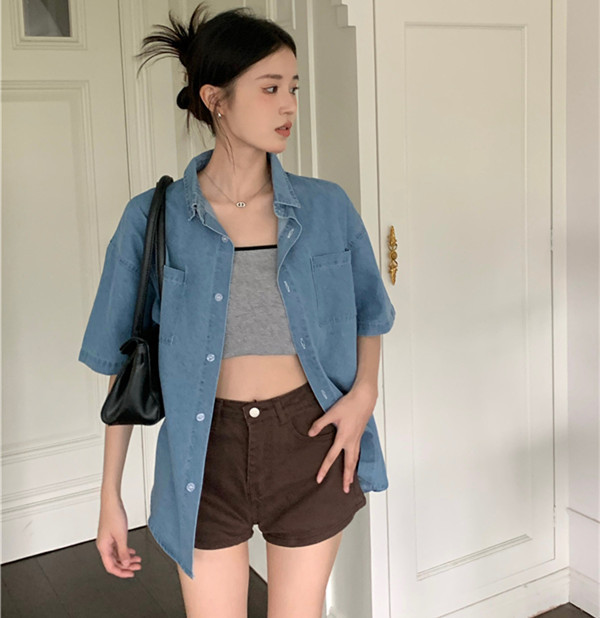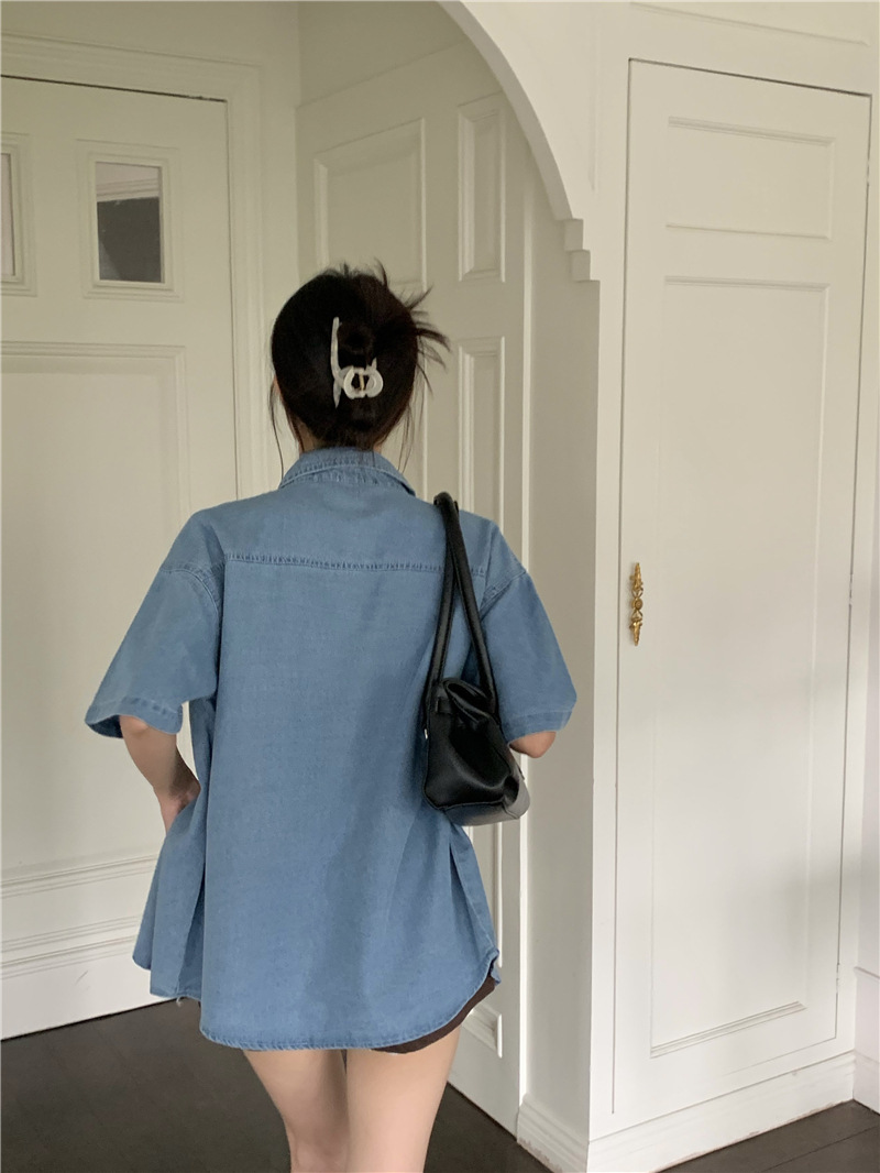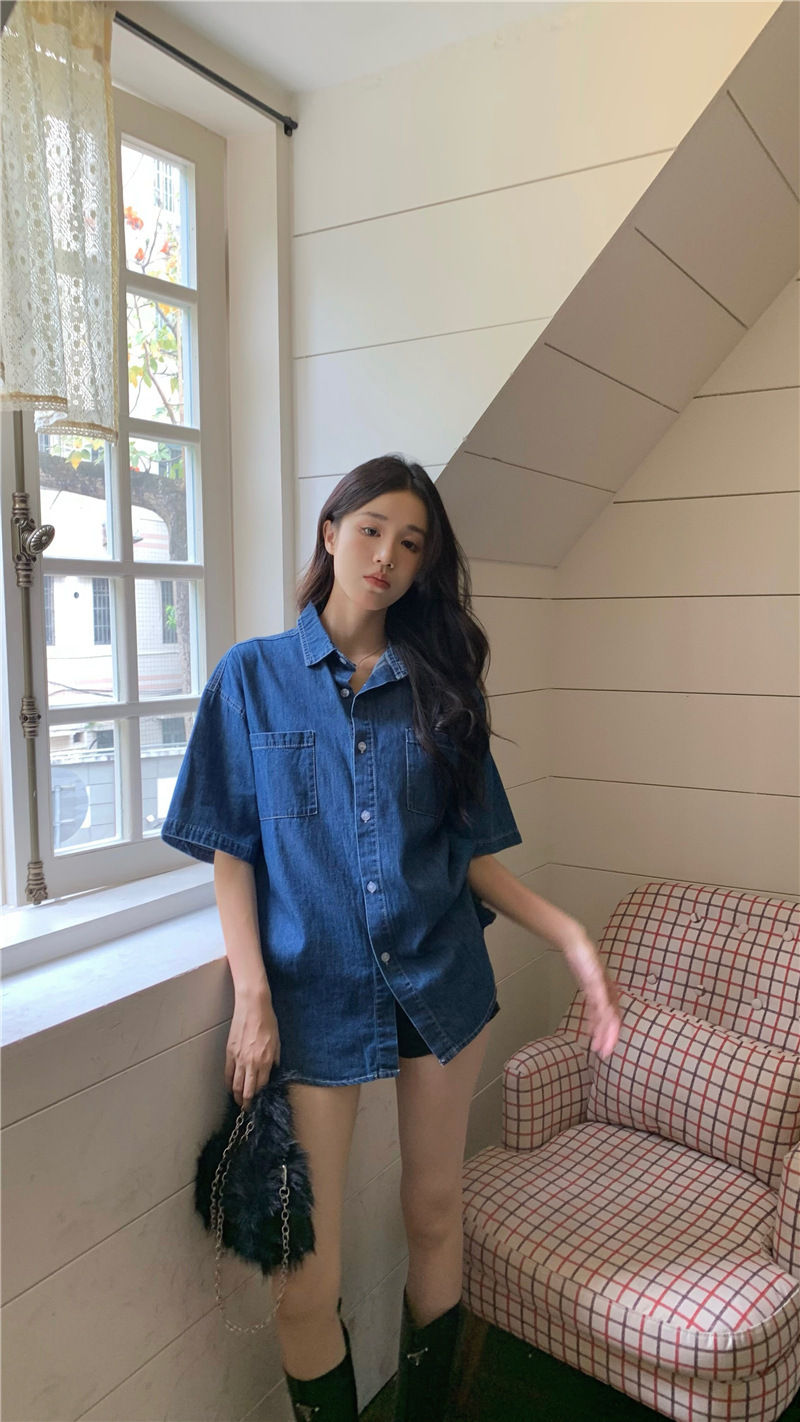 느슨한 짧은 소매 데님 셔츠 여성의 한국어 버전 2024 봄과 여름 레저 디자인 얇은 코트 재킷 공장 아울렛스토어 가기