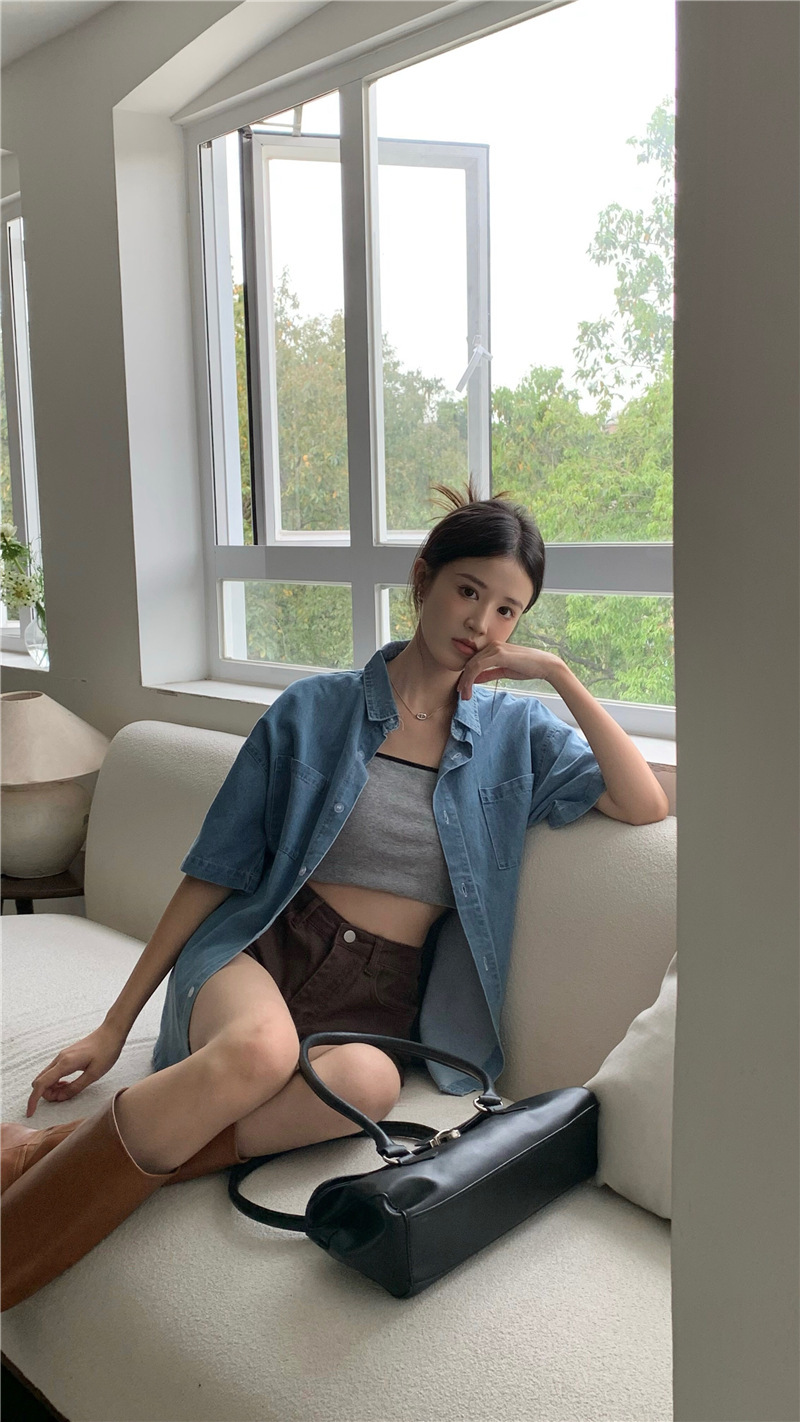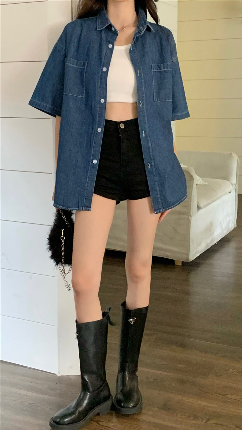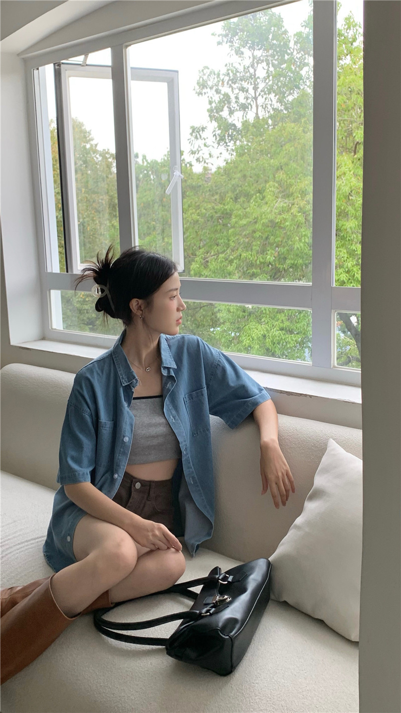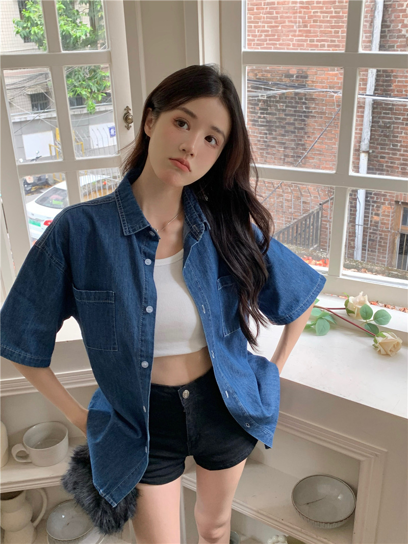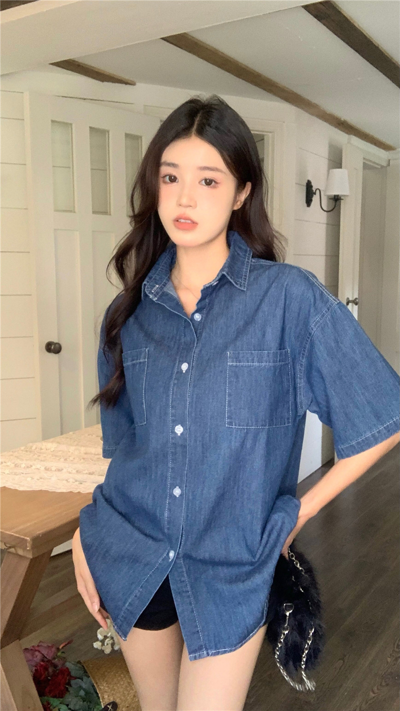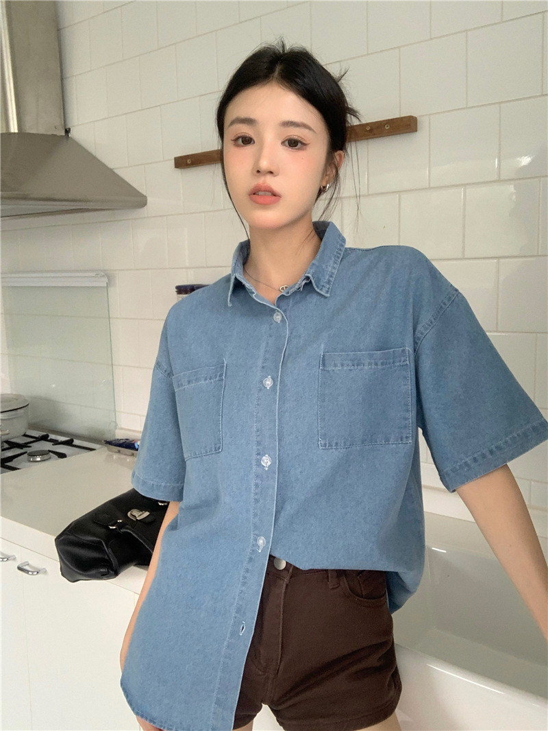느슨한 짧은 소매 데님 셔츠 여성의 한국어 버전 2024 봄과 여름 레저 디자인 얇은 코트 재킷 공장 아울렛