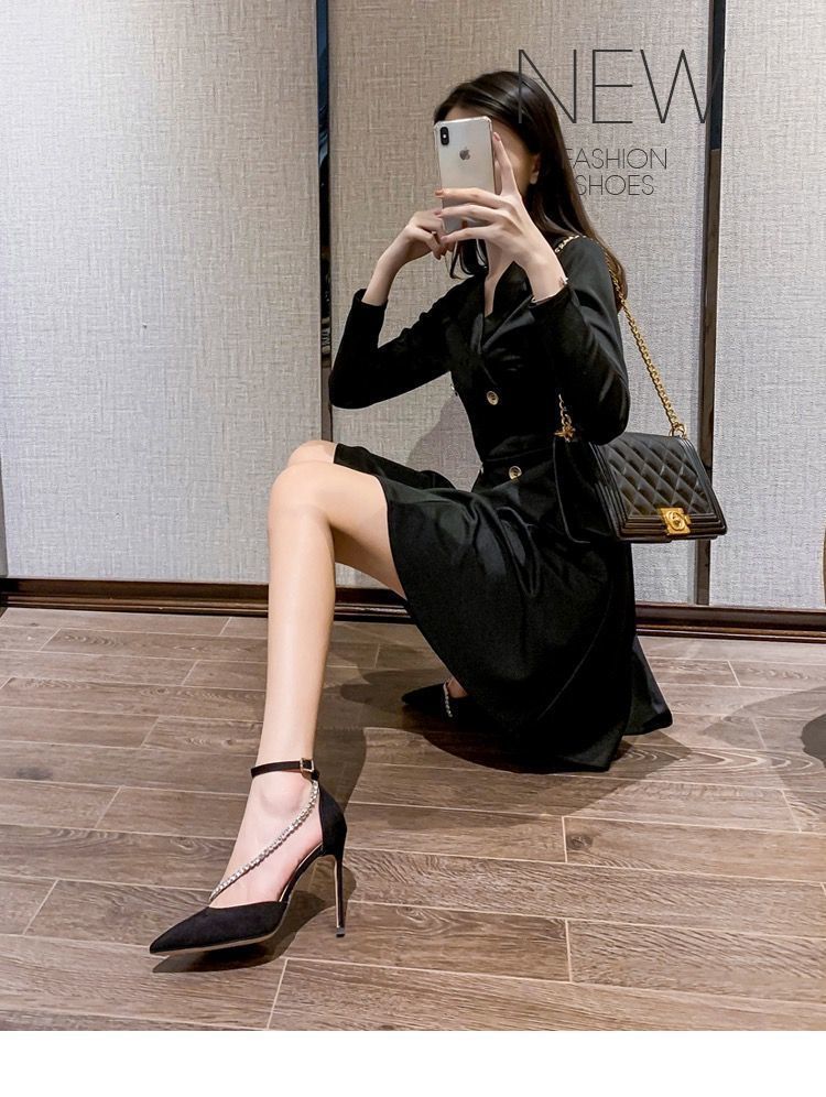 블랙 하이힐 여성 2024 새로운 스틸레토 할로우 포인티드 슈즈 섹시한 바오터우 원 버클 라인스톤 샌들스토어 가기