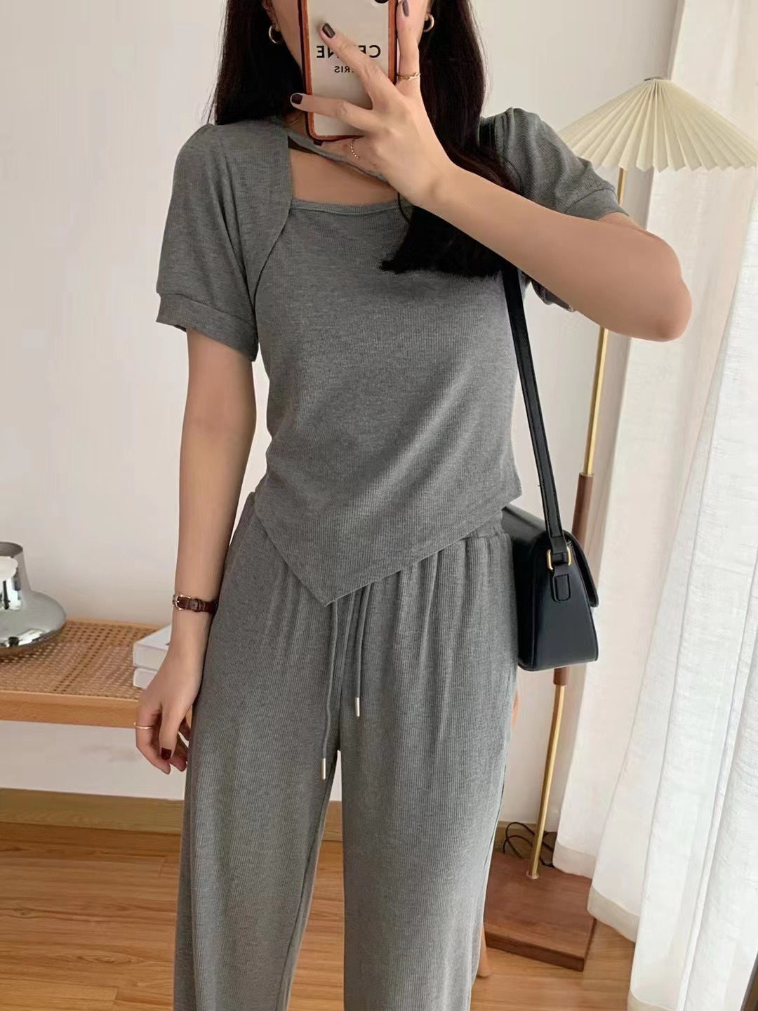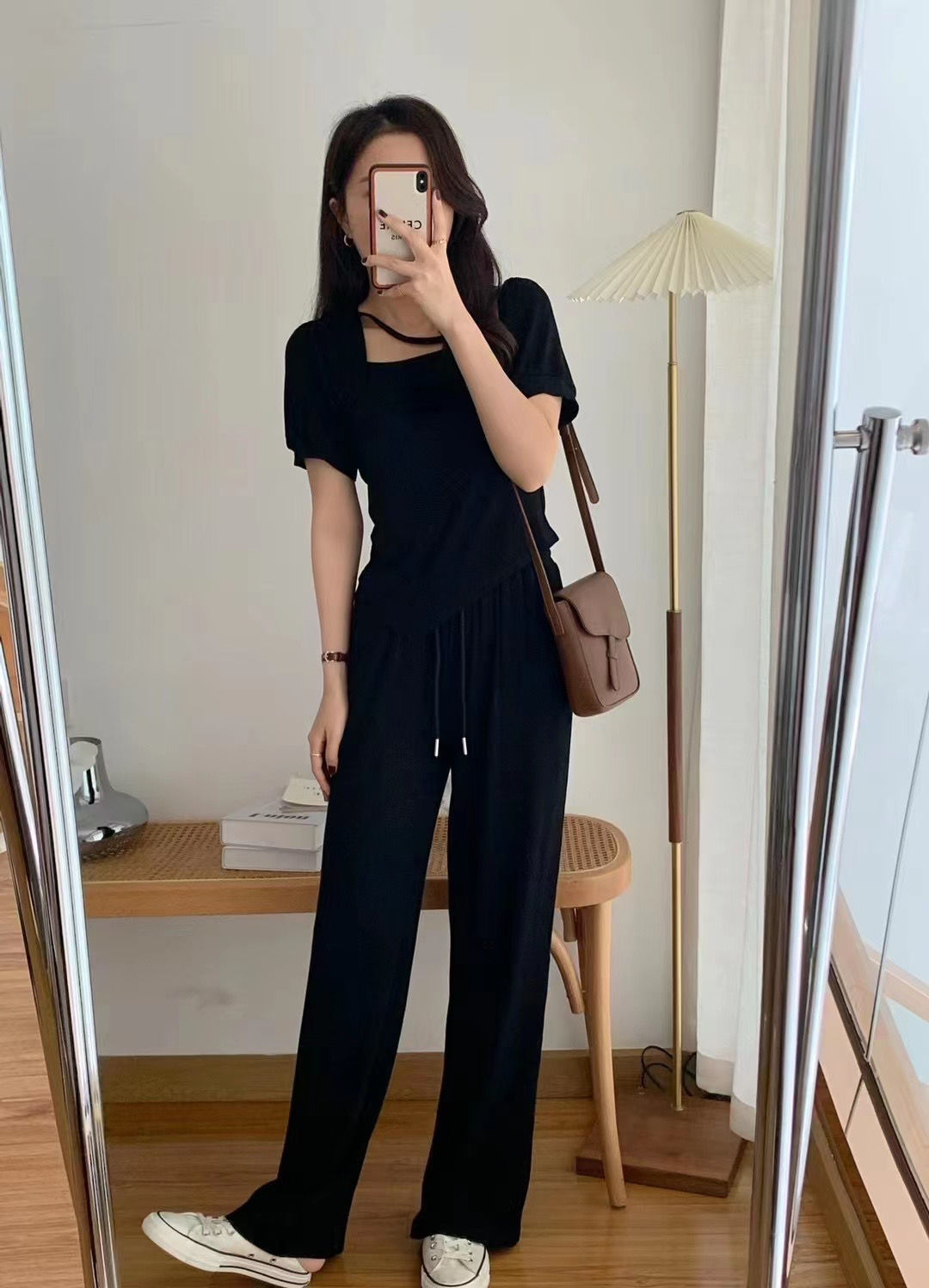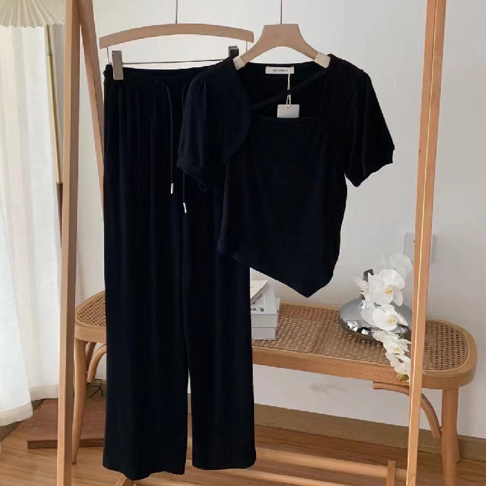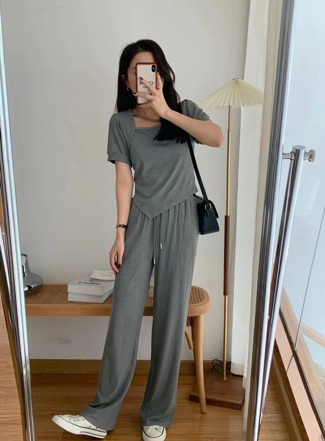 인터넷 연예인 뜨거운 여름 반팔 세트 여성 신식 탑 디자인 틈새 캐주얼 와이드 레그 바지 투피스 세트