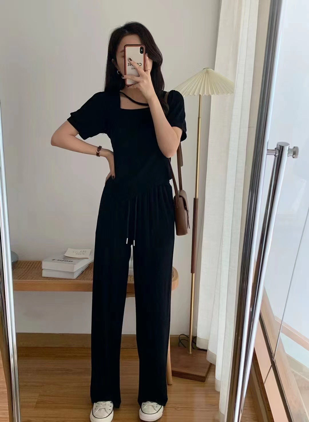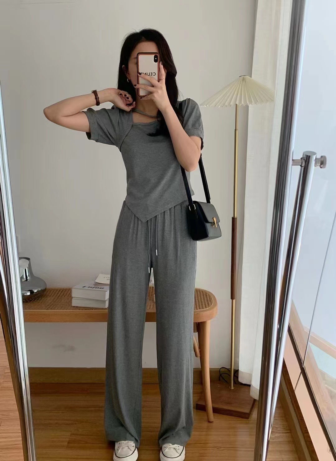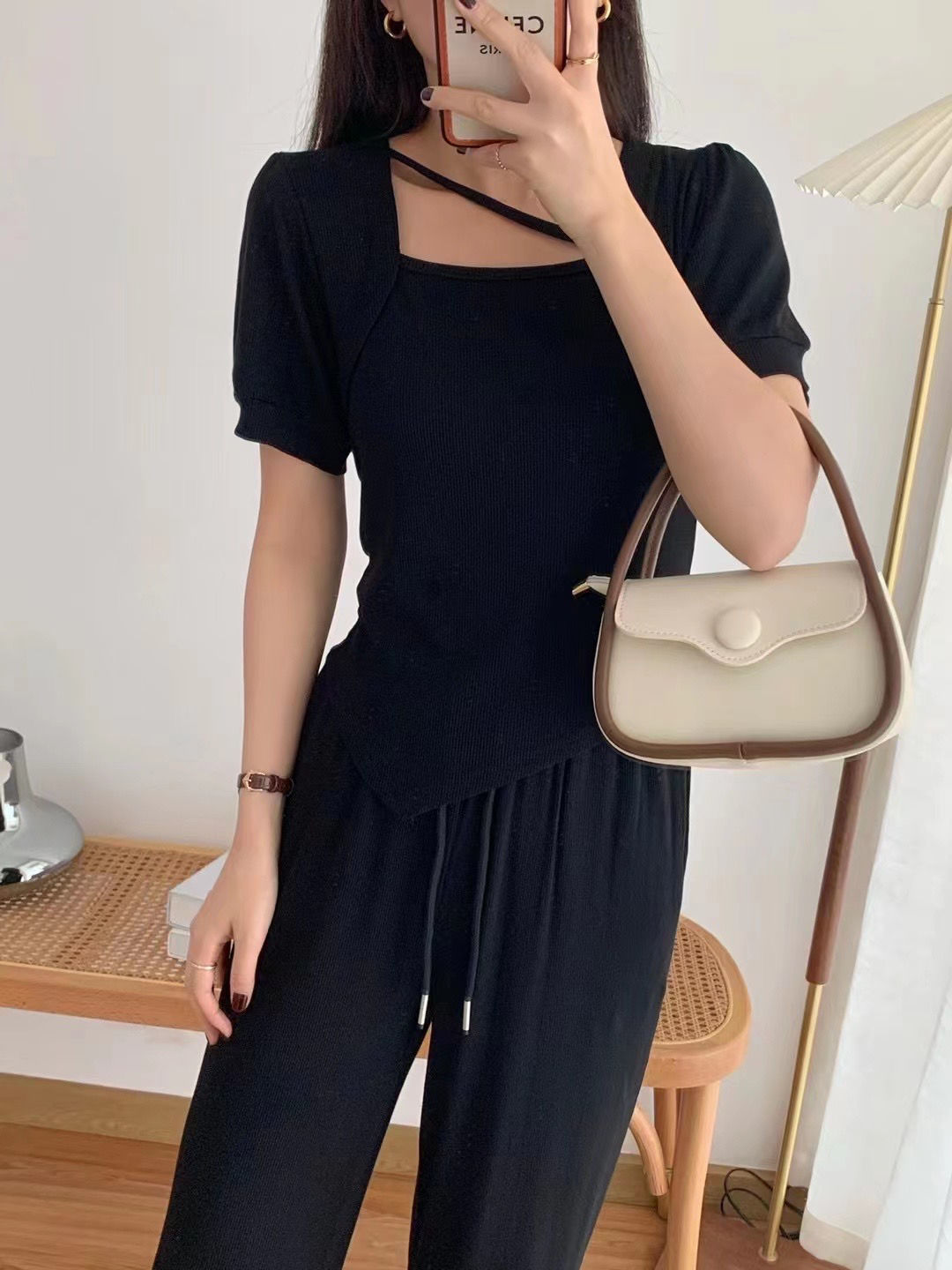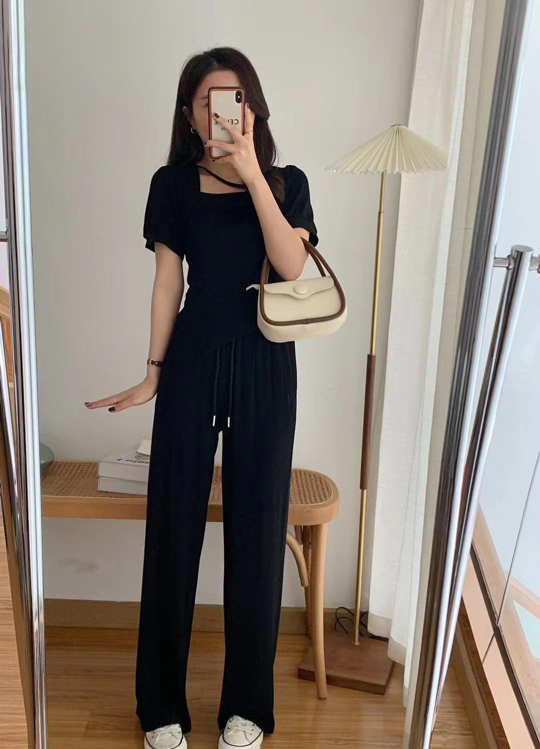 인터넷 연예인 뜨거운 여름 반팔 세트 여성 신식 탑 디자인 틈새 캐주얼 와이드 레그 바지 투피스 세트