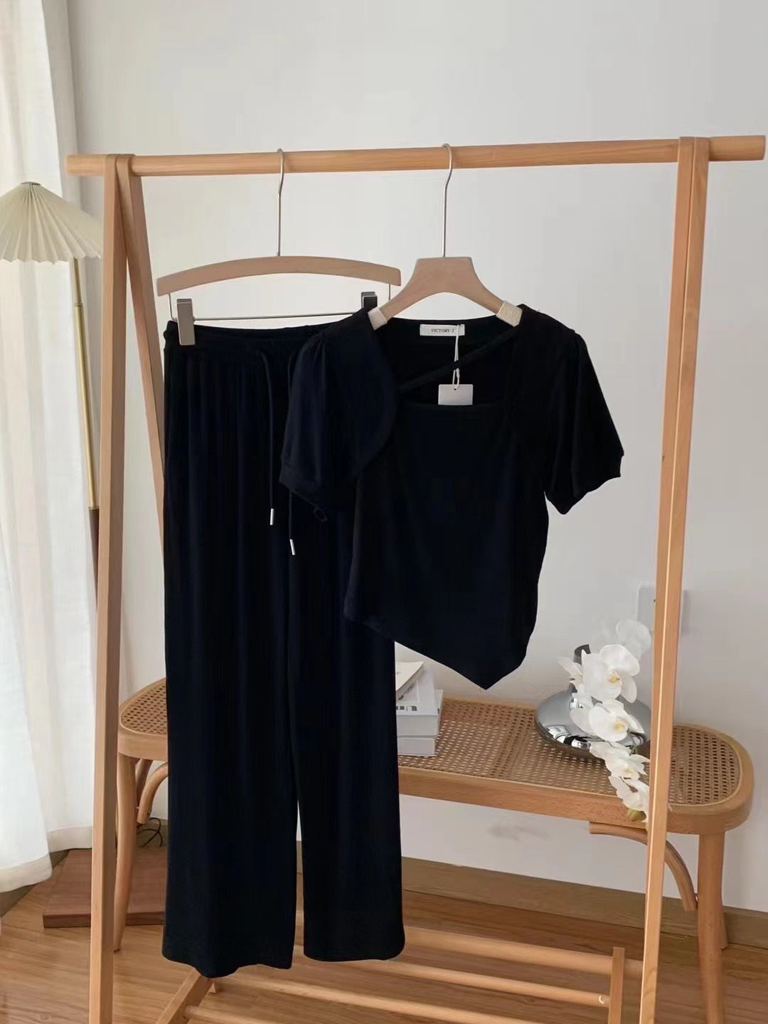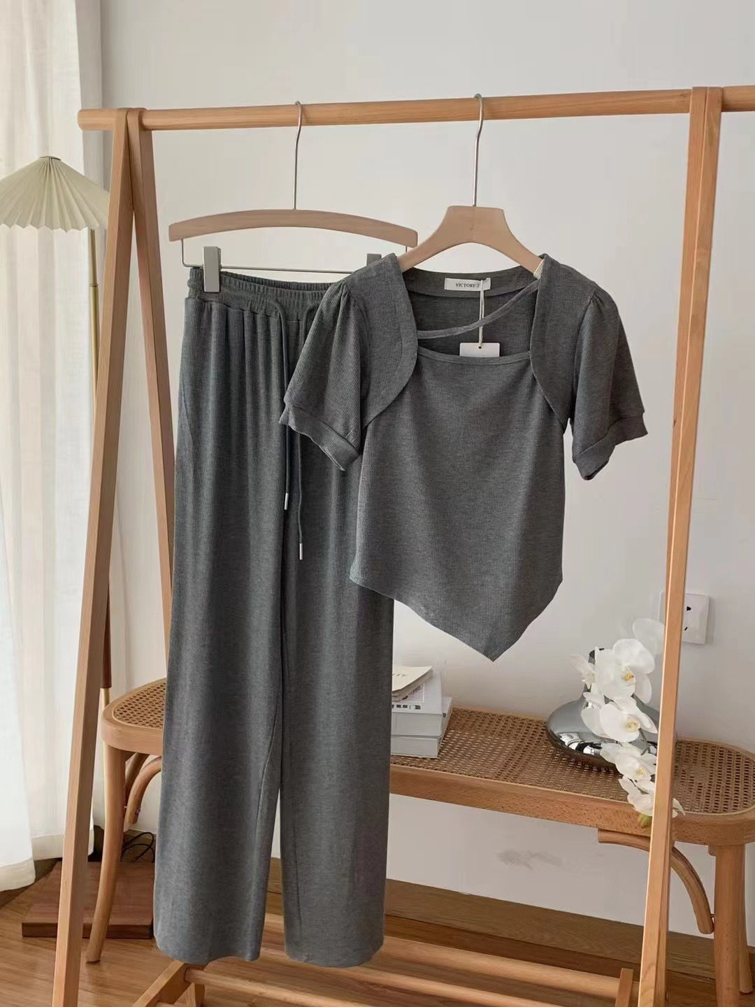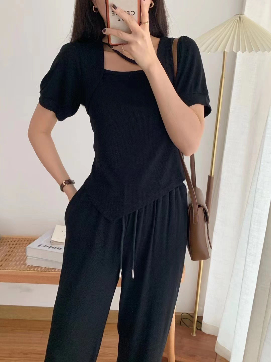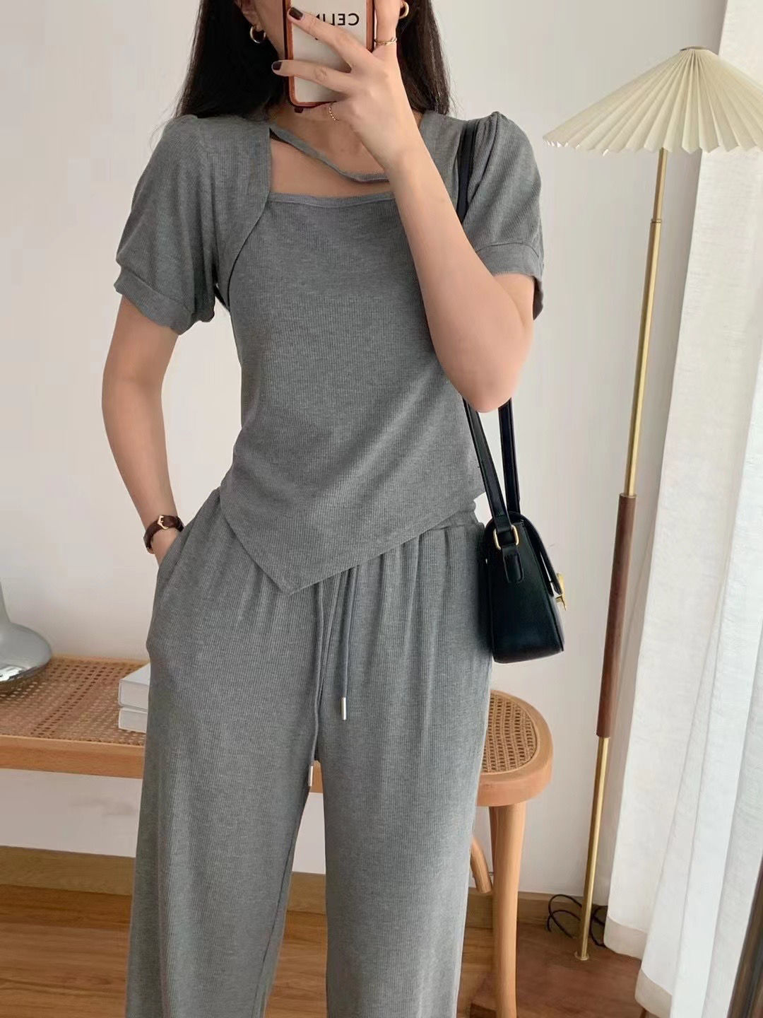 인터넷 연예인 뜨거운 여름 반팔 세트 여성 신식 탑 디자인 틈새 캐주얼 와이드 레그 바지 투피스 세트