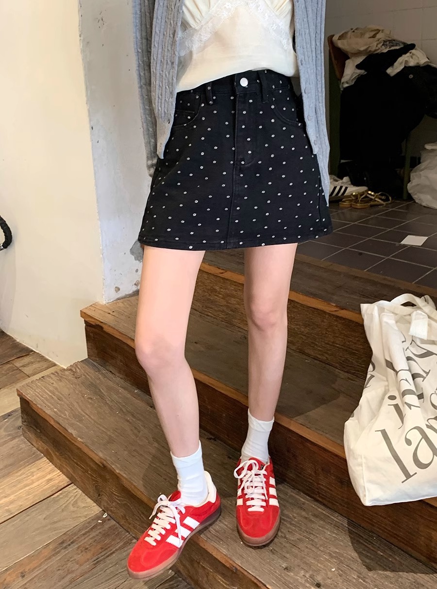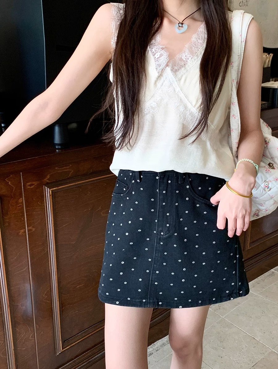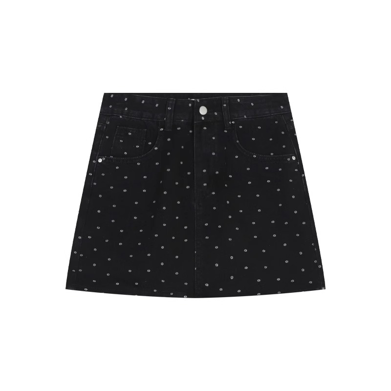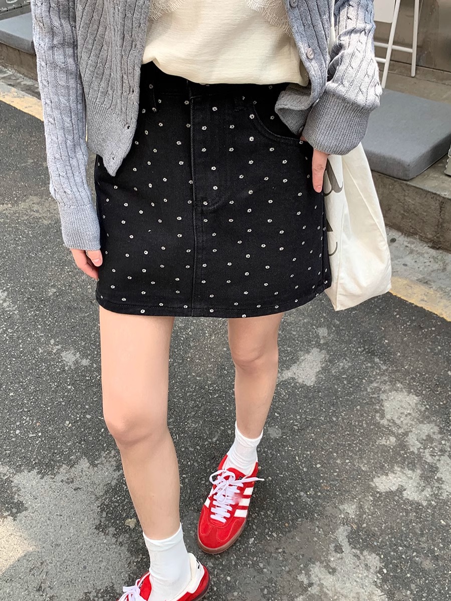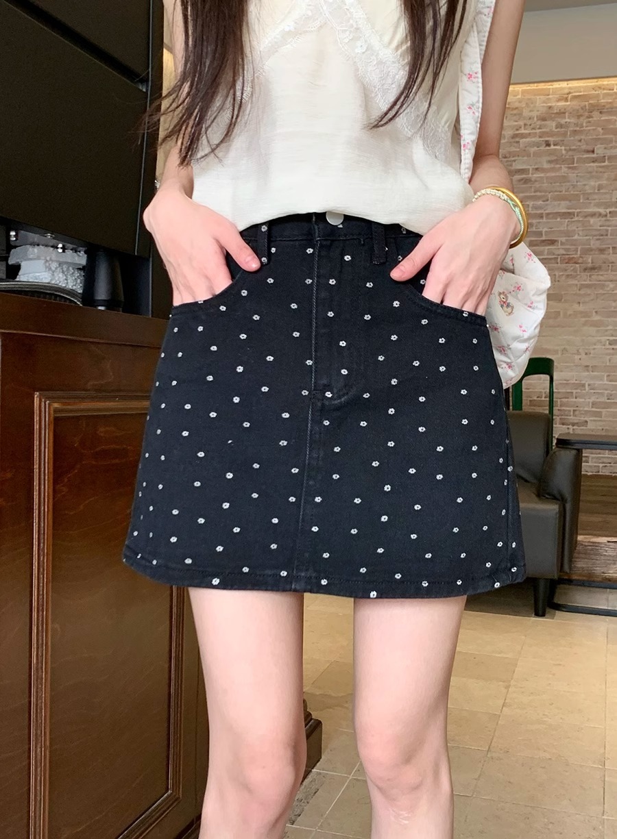 플러스 사이즈 한국 플로럴 블랙 데님 스커트 여자 여름 높은 허리 슬리밍 엉덩이 스커트 안티 러닝 A 라인 스커트스토어 가기