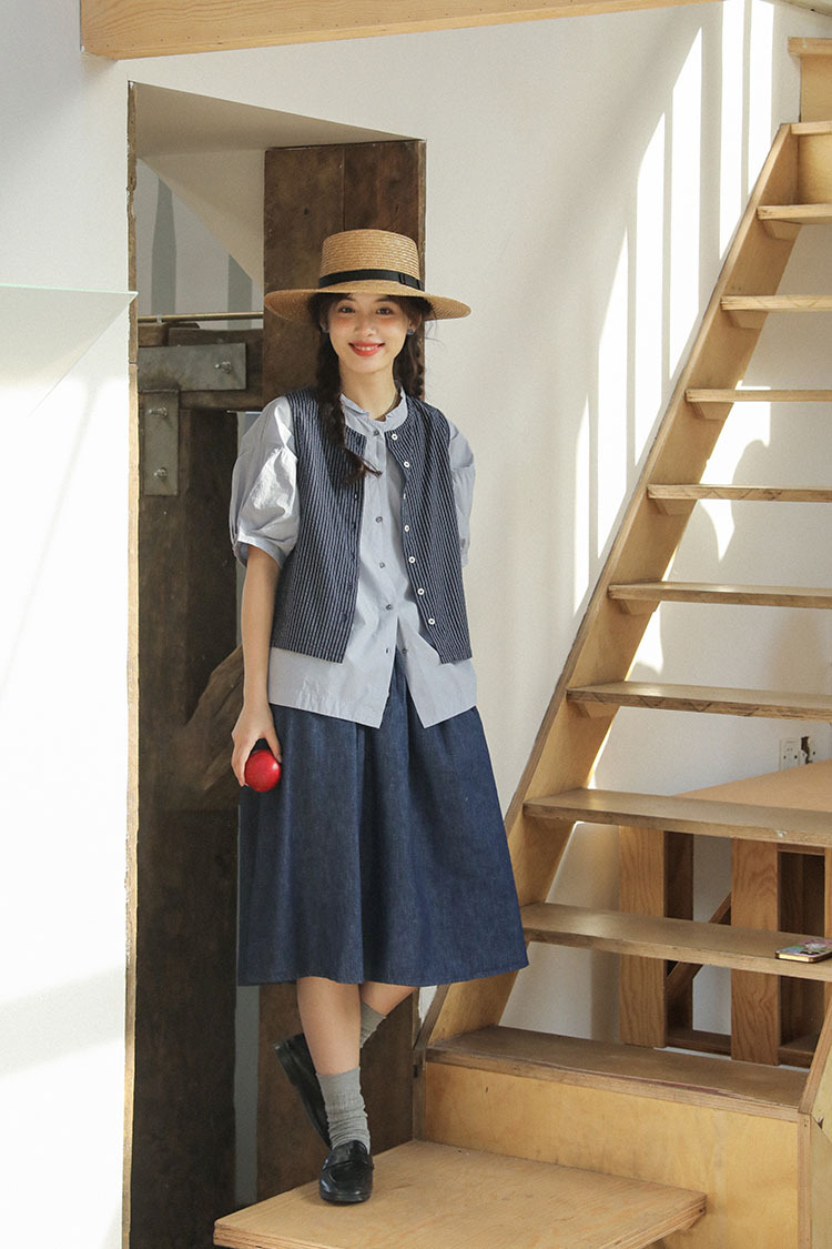 여성 치마 2024 여름 새로운 예술적 모리 얇은 허리 멀티 브레스트 디자인 센스 데님 A 라인 스커트