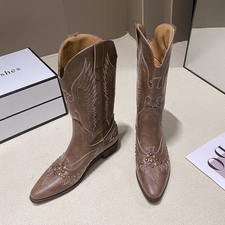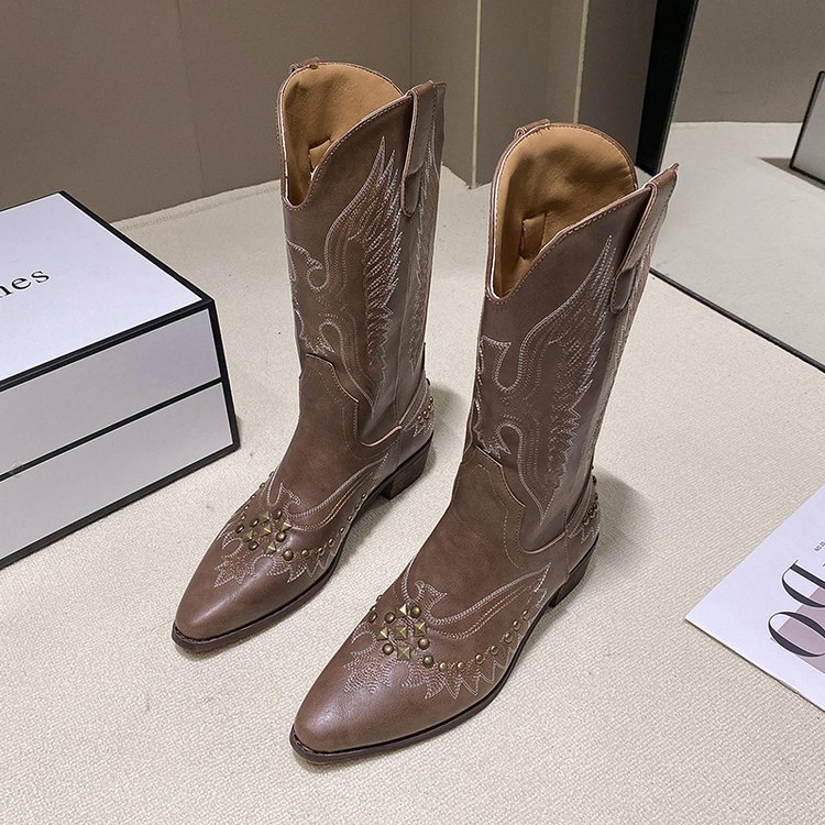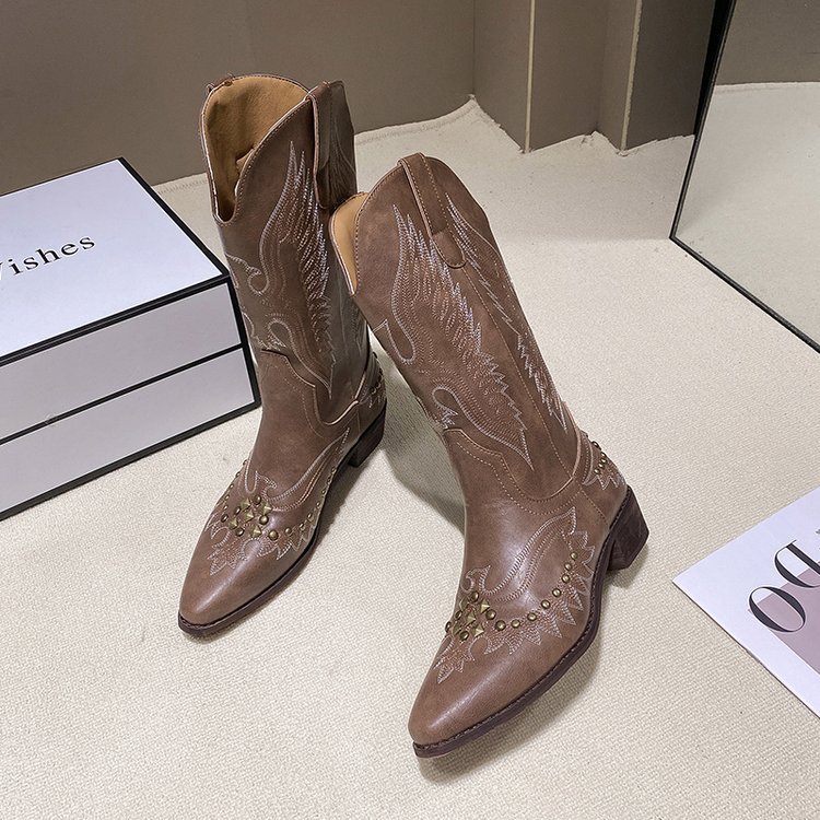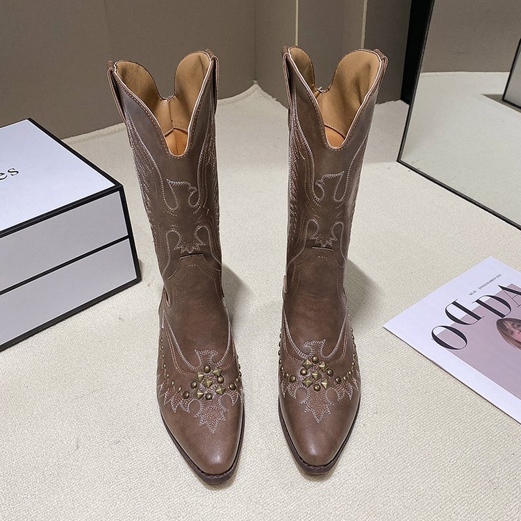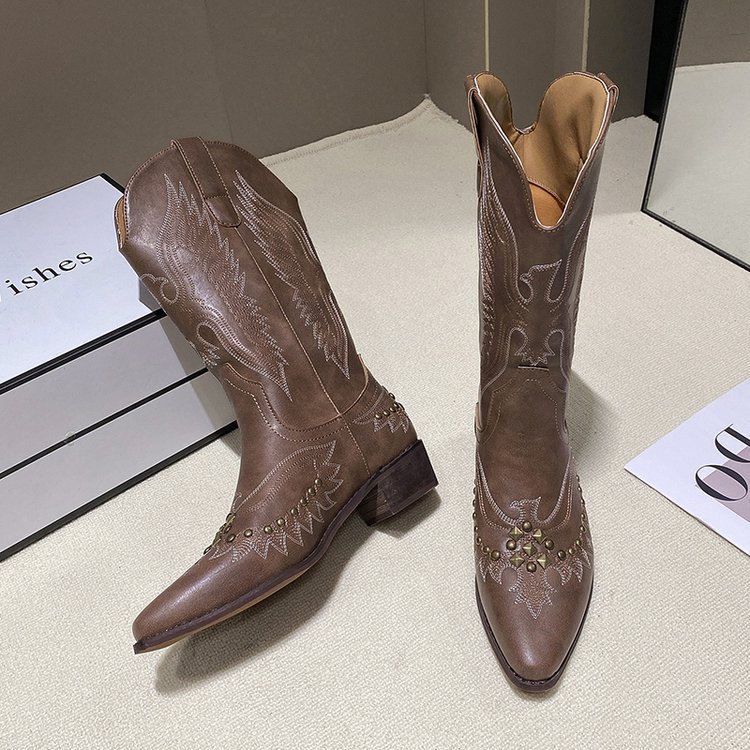 리벳 레트로 웨스턴 카우보이 부츠 여성 2024 새로운 두꺼운 힐 V-입 자수 기사 부츠 포인트 미들 부츠 여성