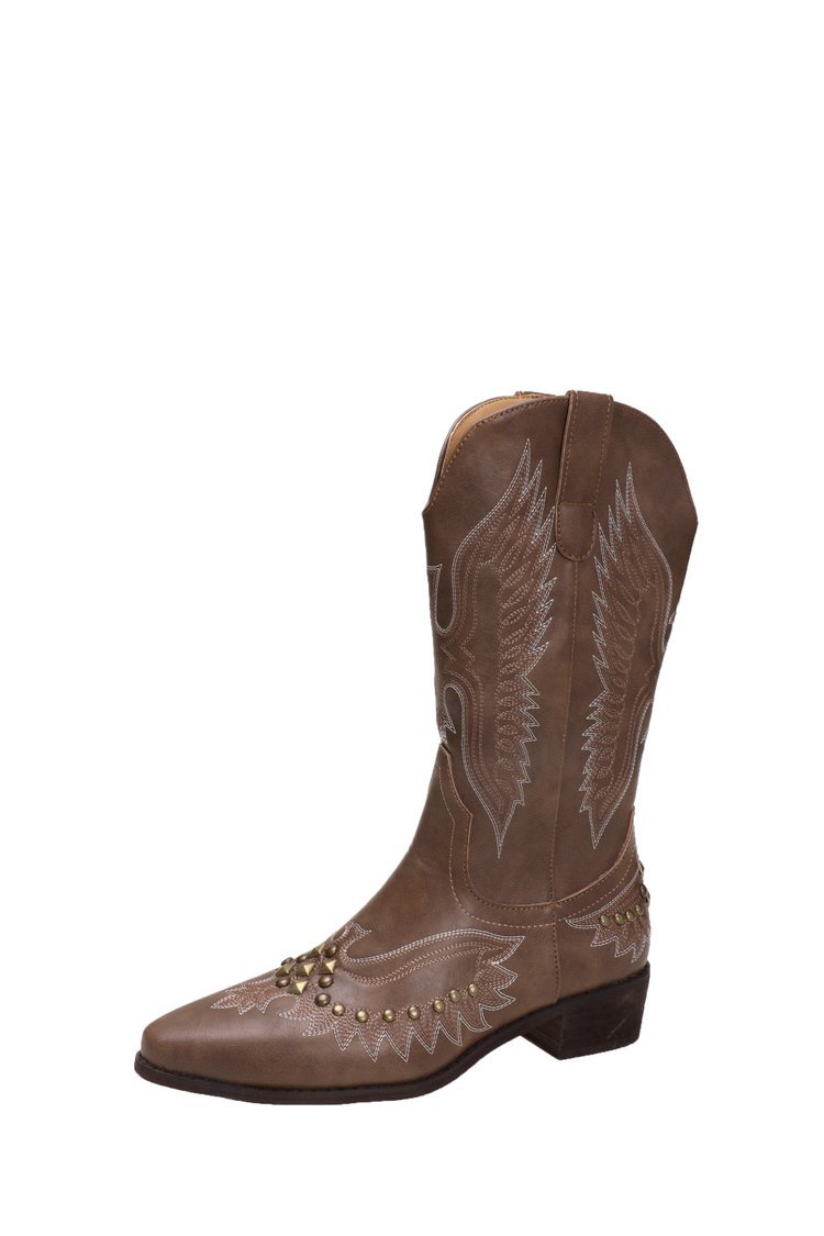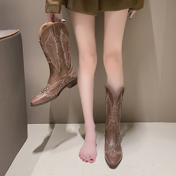 리벳 레트로 웨스턴 카우보이 부츠 여성 2024 새로운 두꺼운 힐 V-입 자수 기사 부츠 포인트 미들 부츠 여성스토어 가기