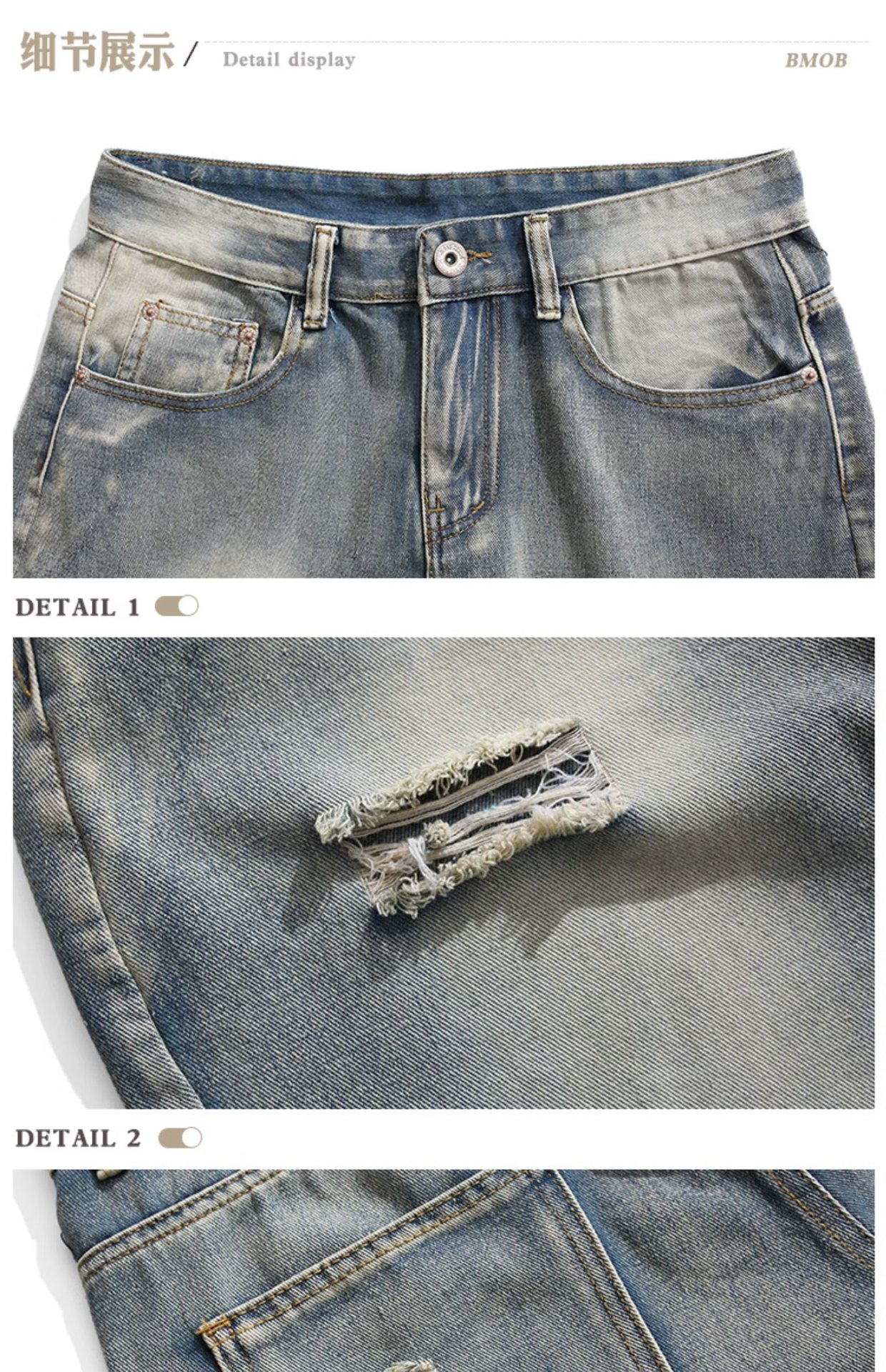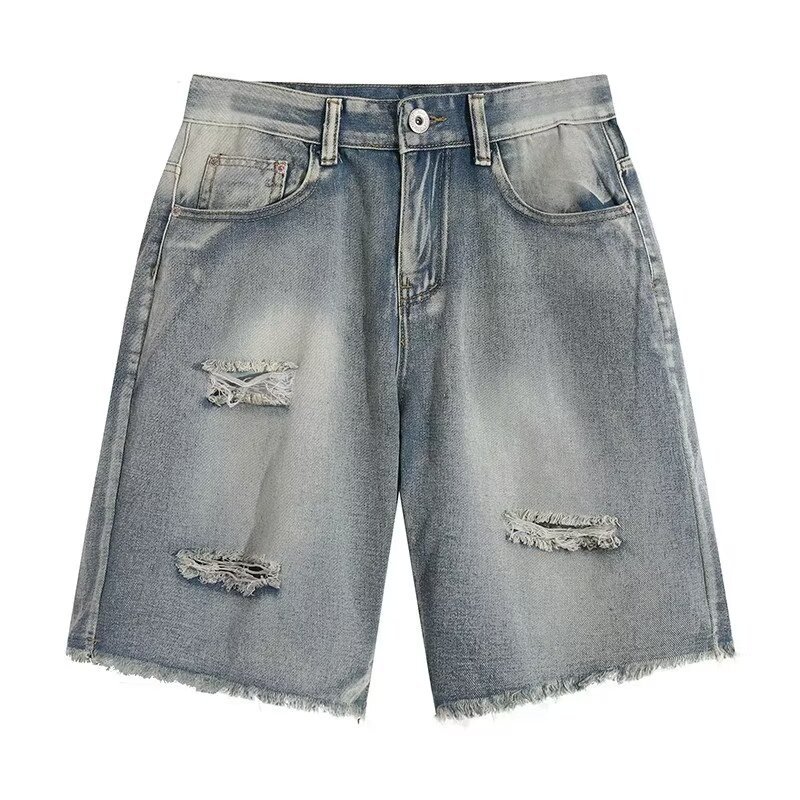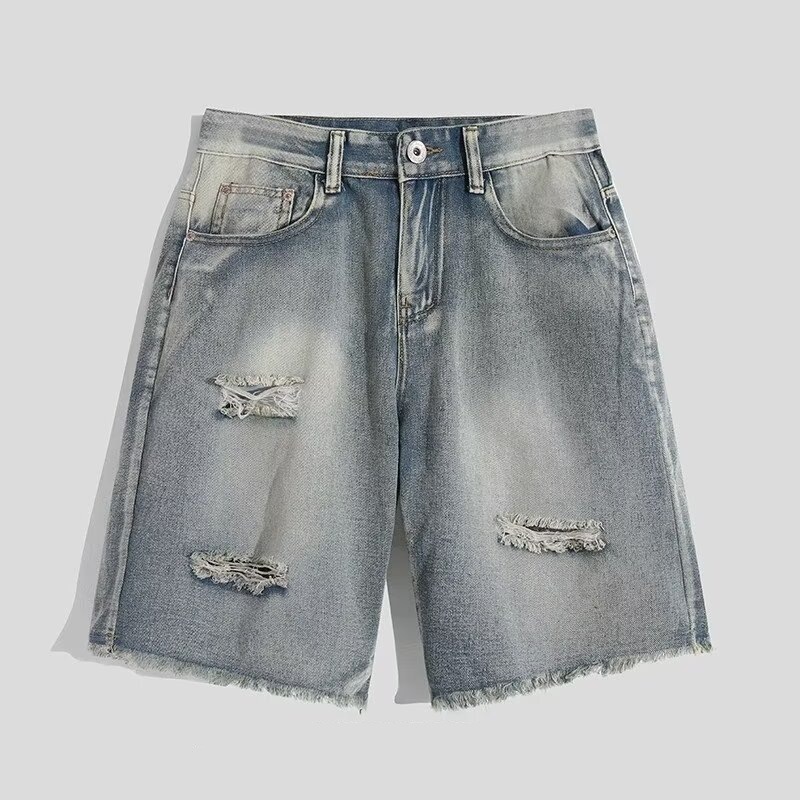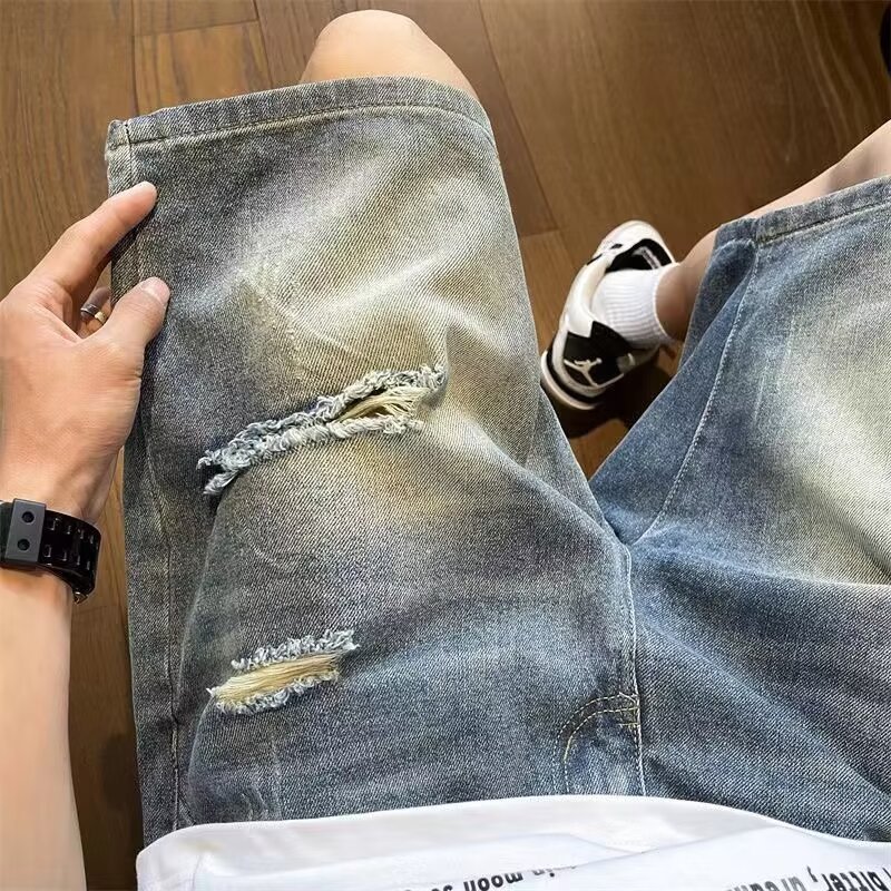 세탁 된 홀 데님 반바지 남자 여름 얇은 중간 길이 바지 아메리칸 스타일 스트리트 올 매치 루즈 스트레이트 스포츠 바지스토어 가기