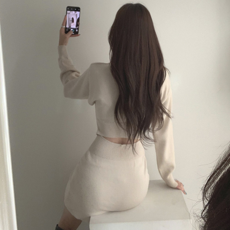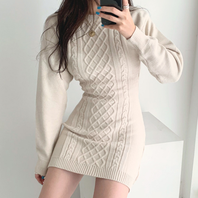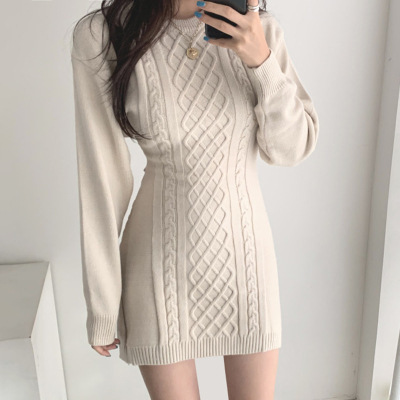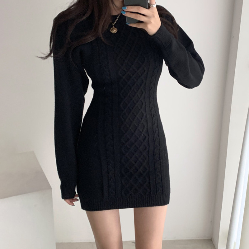 한국 가을과 겨울 우아한 둥근 목 다이아몬드 패턴 작은 스키니 머신 슬림 핏 슬리밍 엉덩이 니트 원피스 여성스토어 가기