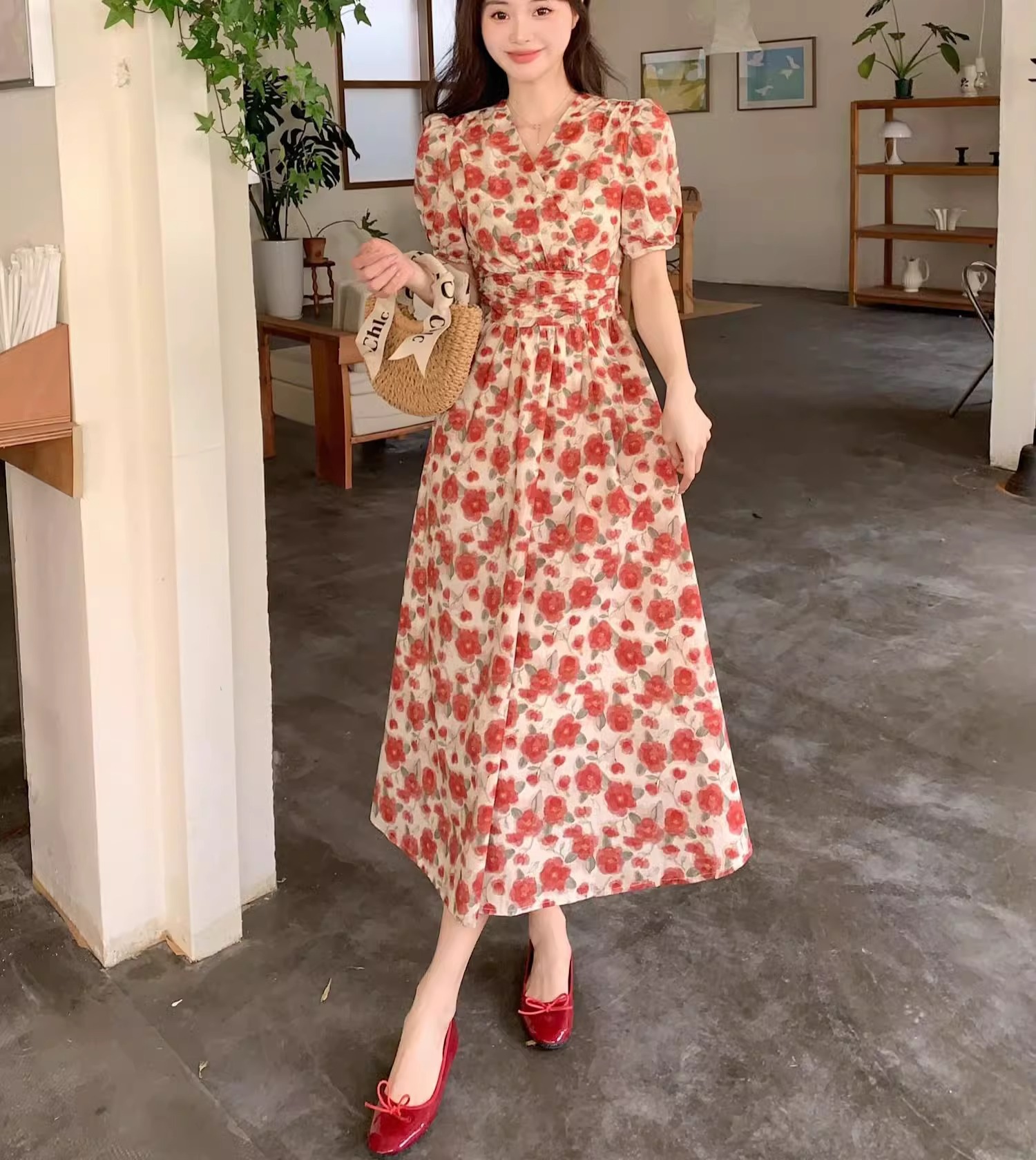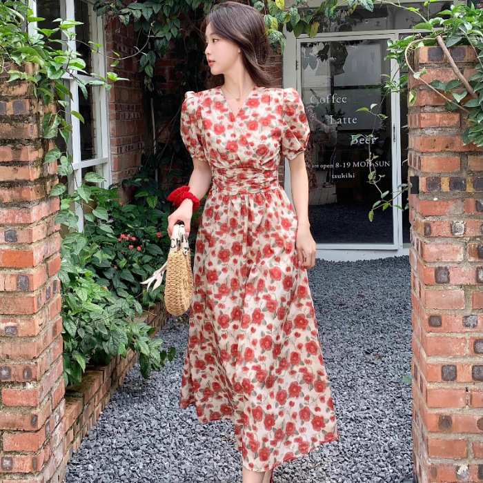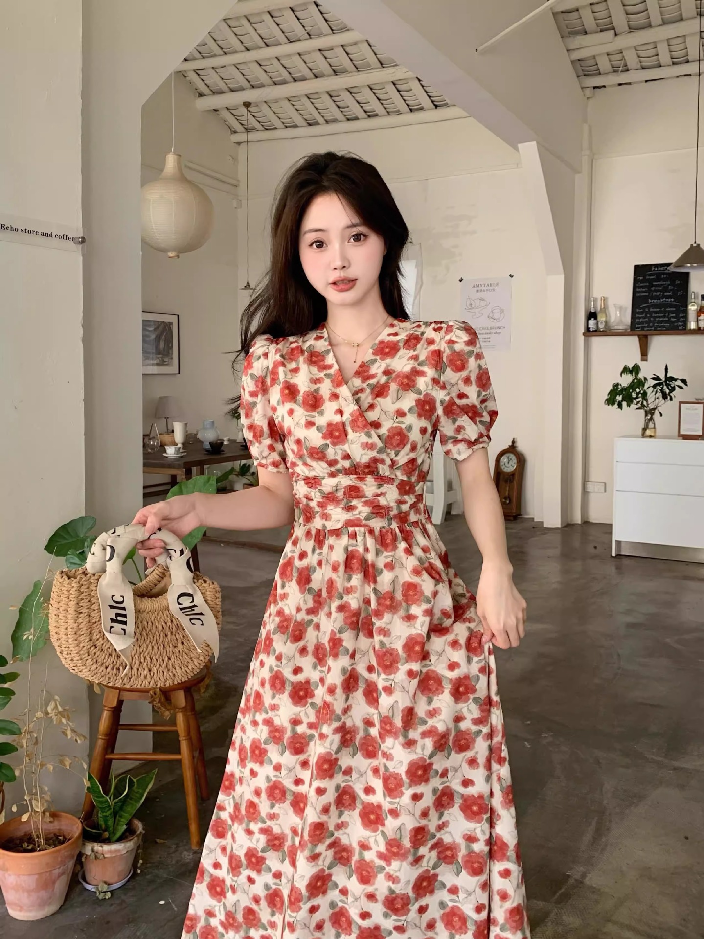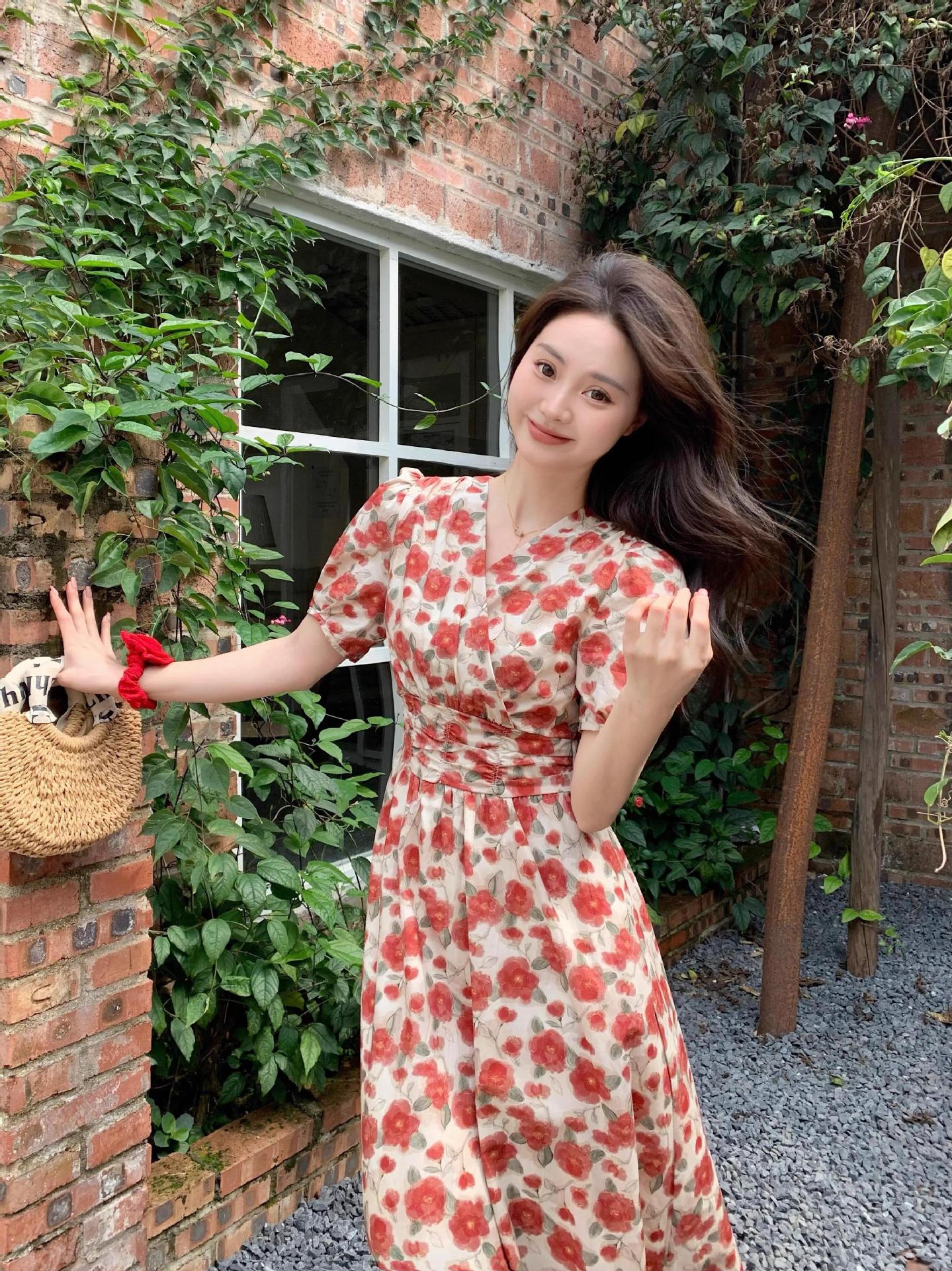 [독창적 인 솜씨] 플러스 사이즈 차 브레이크 프랑스 인쇄 원피스 여성 여름 통통녀 새로운 여신 스타일 하이 엔드 원피스스토어 가기