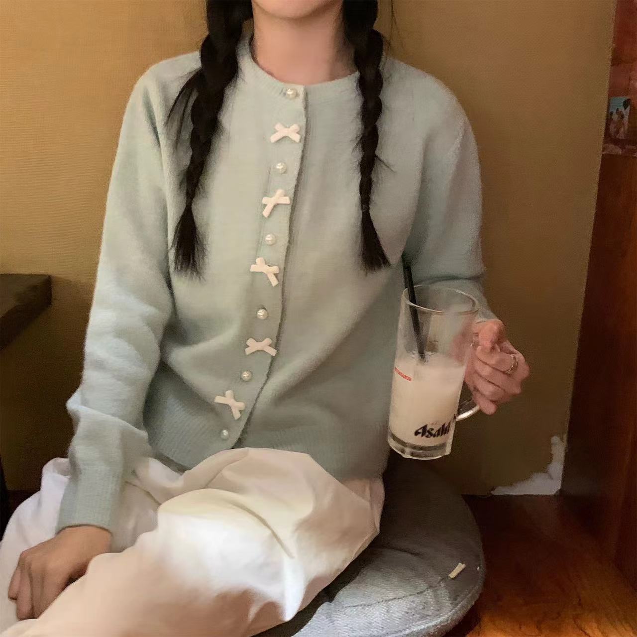 봄과 가을 활 펄 버튼 스웨터 여성 하이 엔드 한국 스타일 젠틀 라이트 옐로우 니트 재킷 라운드 넥스토어 가기
