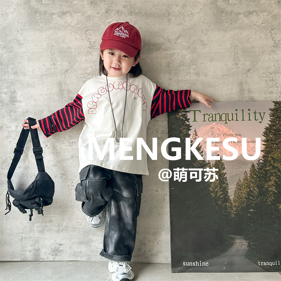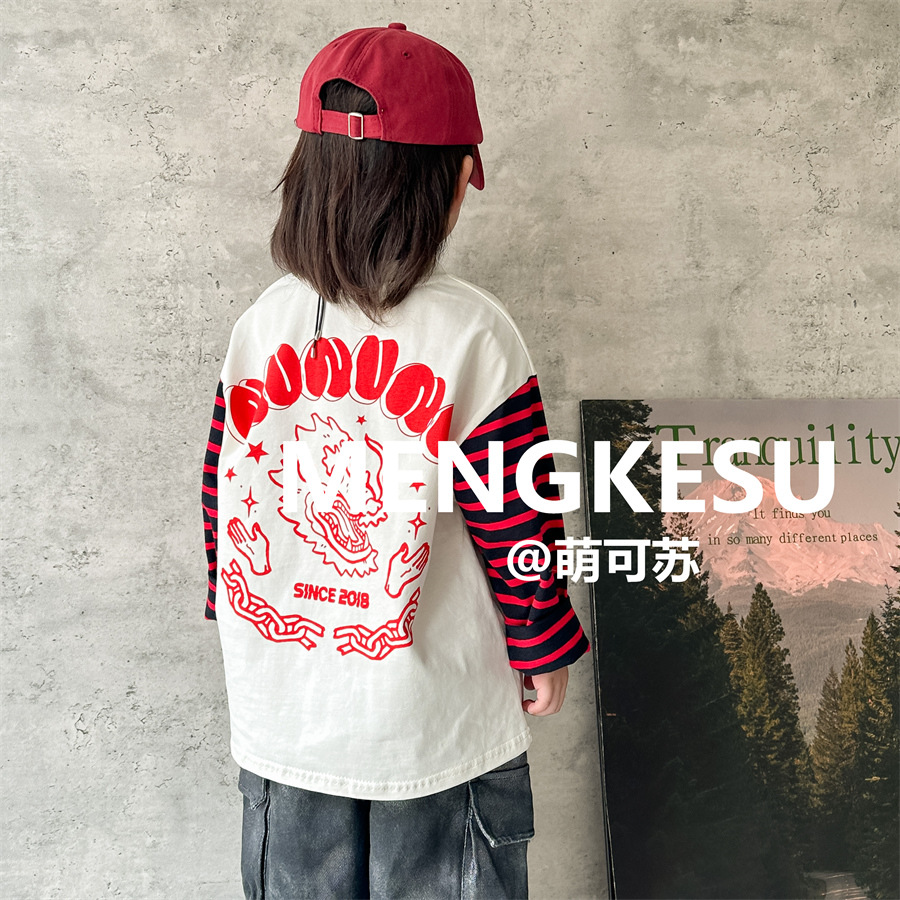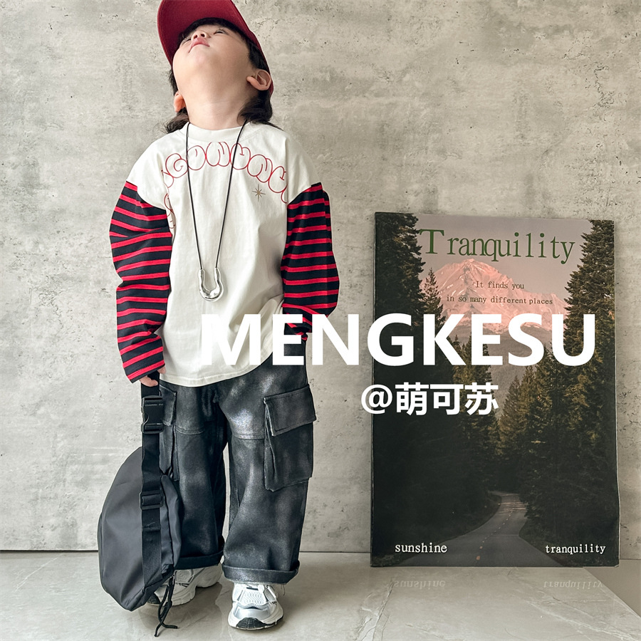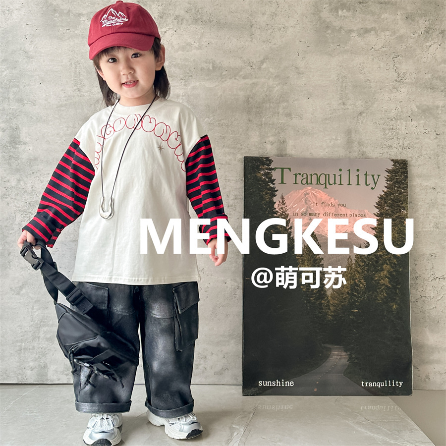 Moe Su 아동복 소년 티셔츠 2024 가을 착용 어린이 티셔츠 어린이 긴 소매 스트라이프 올 매치 탑 트렌디스토어 가기