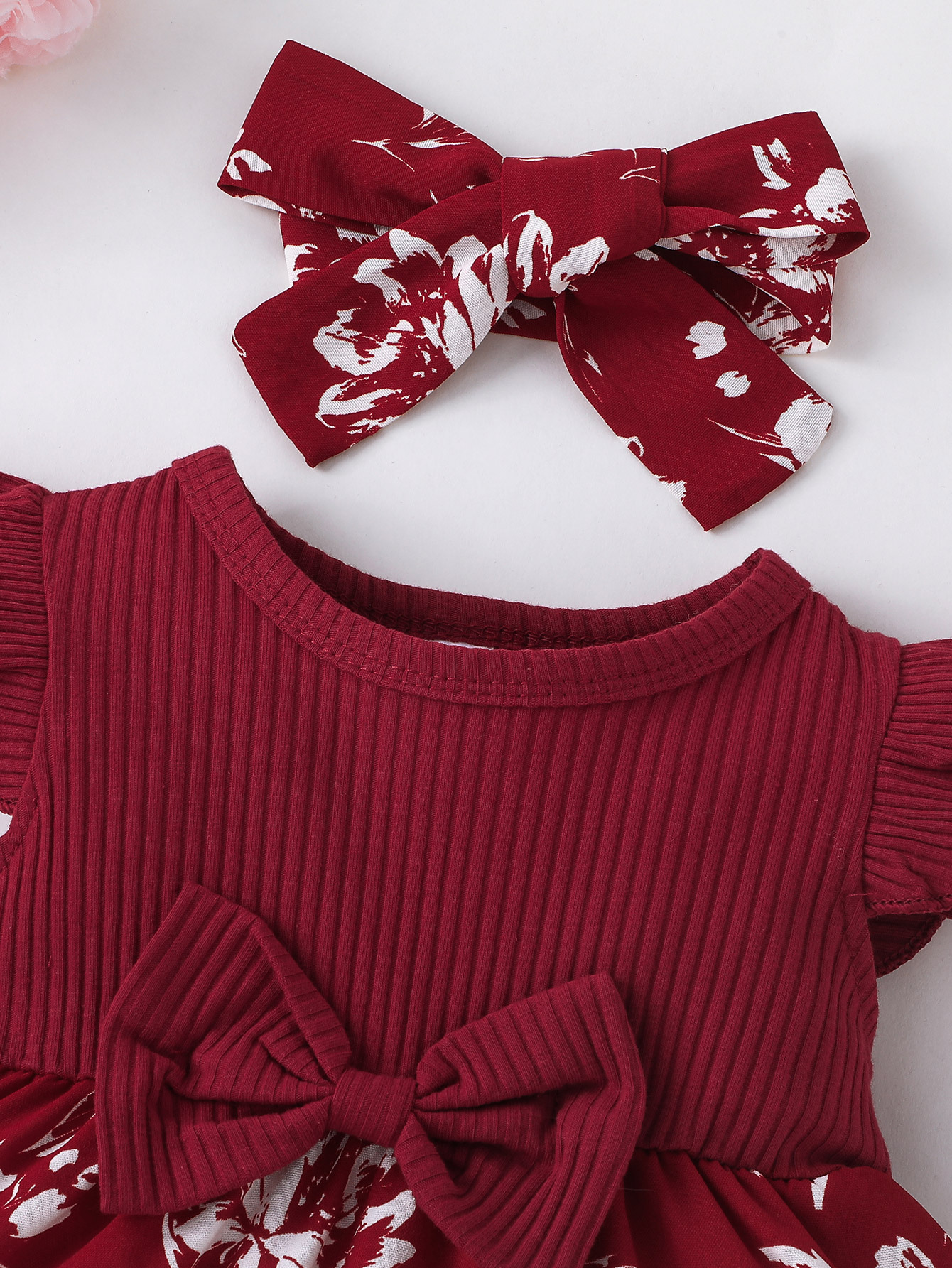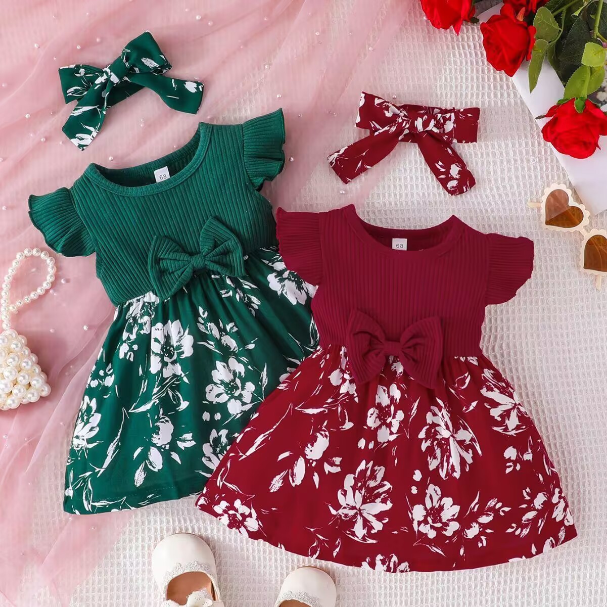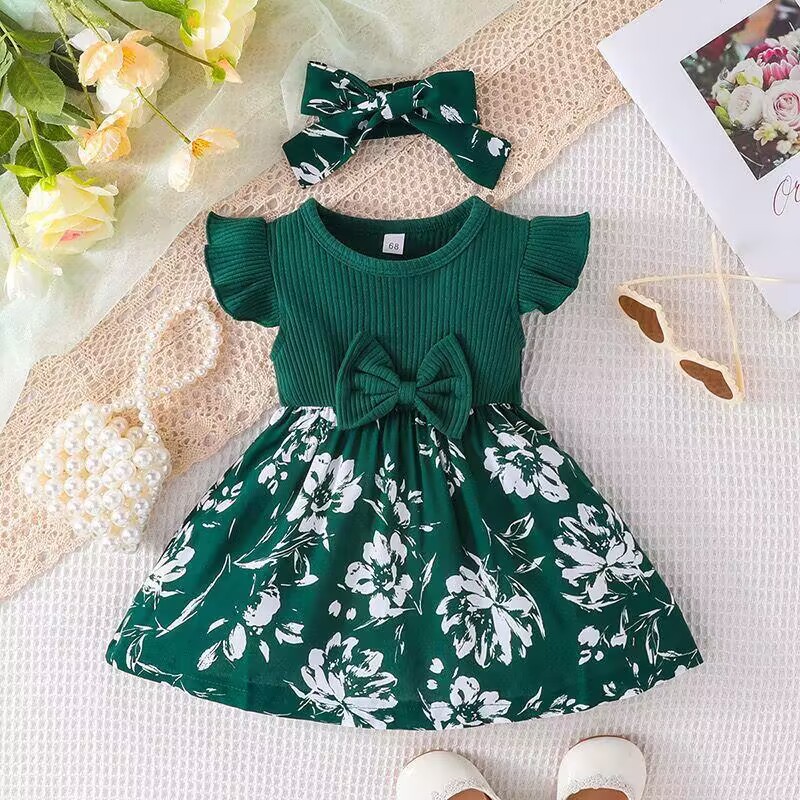 유럽과 미국의 여름 신생아 아기 소녀 달콤한 활 플라잉 슬리브 드레스 0-1 세 귀여운 투피스 세트