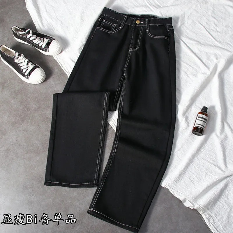 블랙 와이드 레그 청바지 여자 높은 허리 슬리밍 느슨한 캐주얼 올매치 9 포인트 스트레이트 올 매치… 학생들을위한 한국 스타일 유행