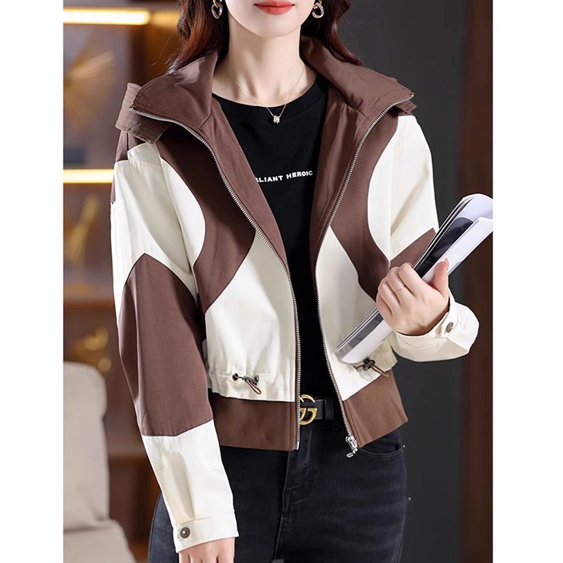 패션 콘트라스트 컬러 재킷 여성의 2024 년 봄과 가을 새로운 후드 칼라 쇼트 올 매치 디자인 센스 재킷