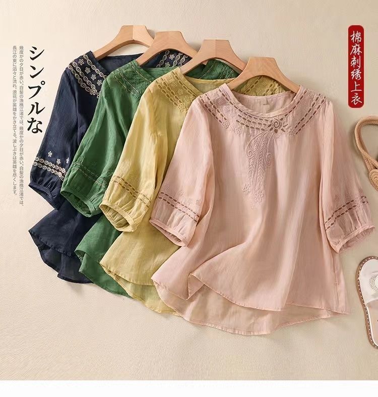 45.00 kg-150.00 kg 플러스 사이즈 여성 예술 빈티지 자수 셔츠 반소매 우아한 슬림핏 루즈 올 매치 풀오버 탑