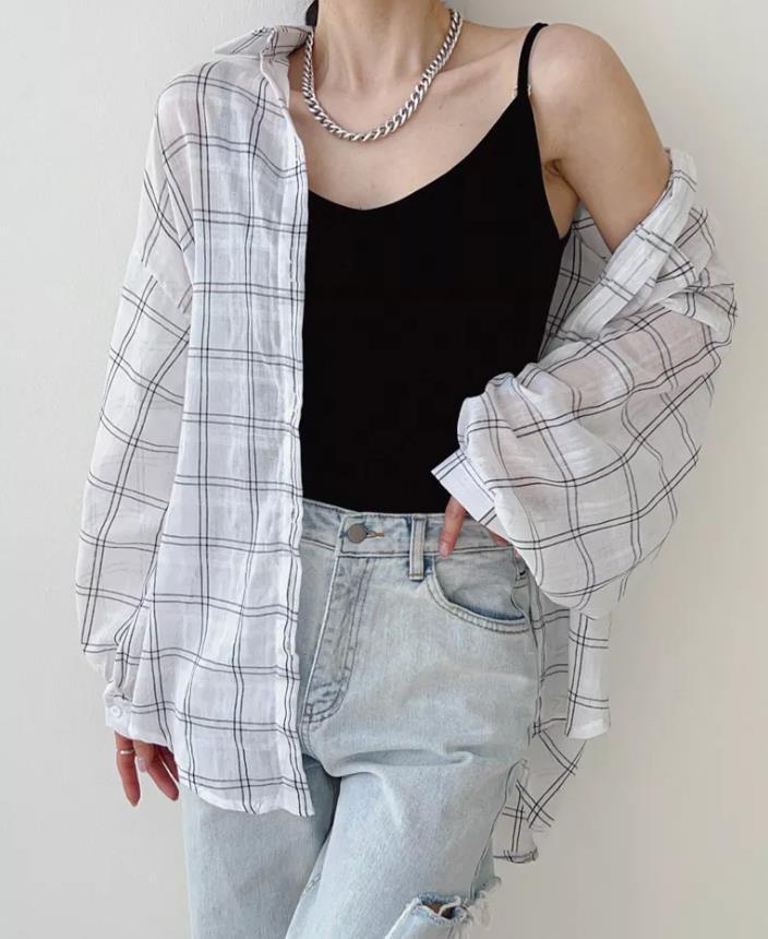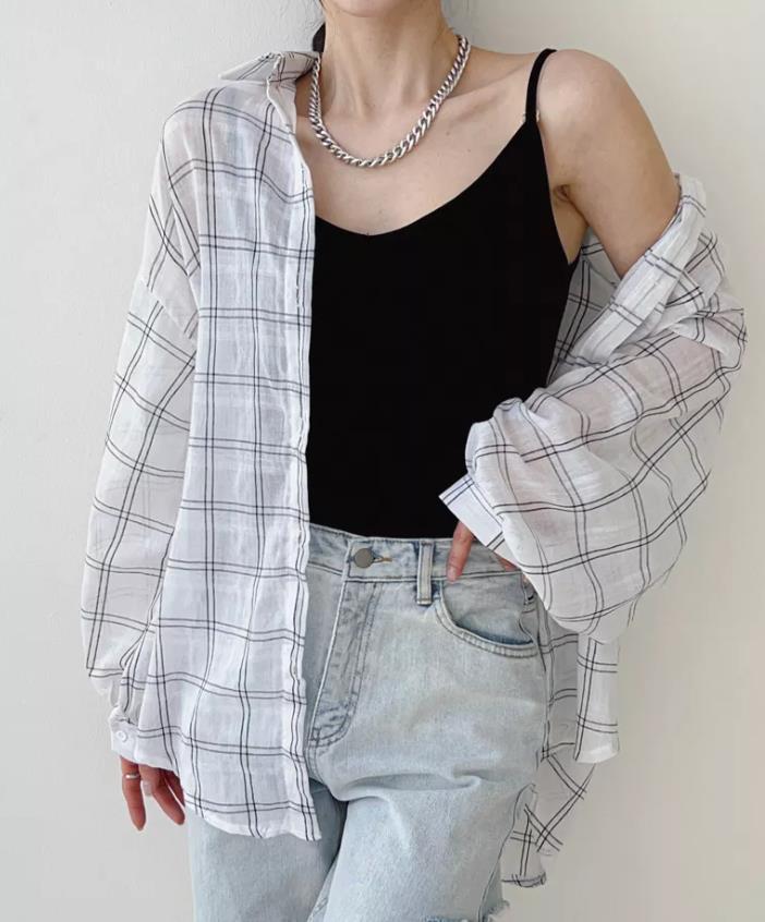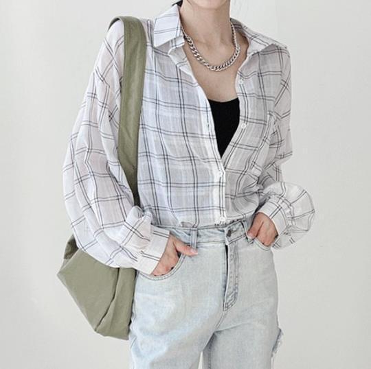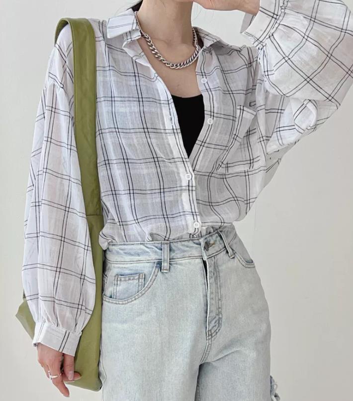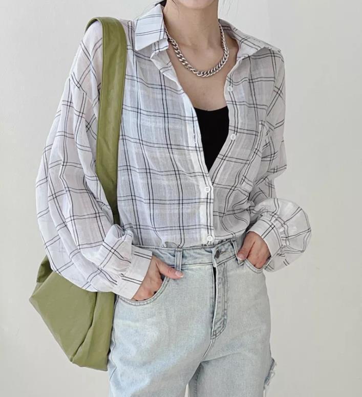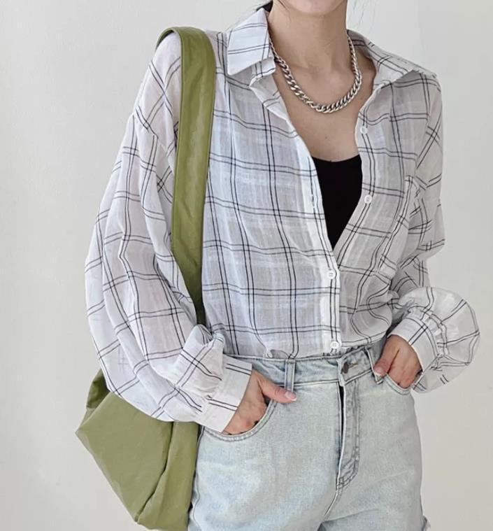 봄과 가을 한국식 격자 무늬 셔츠 느슨한 긴팔 패션 틈새 선스크린 여성 최고 셔츠스토어 가기