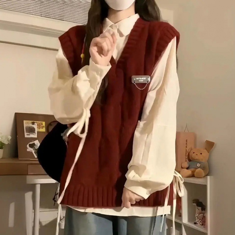 한국식 스위트 컬리지 스타일 브이넥 풀오버 트위스트 스웨터 조끼 + 살구 스트랩 셔츠 투피스 슈트