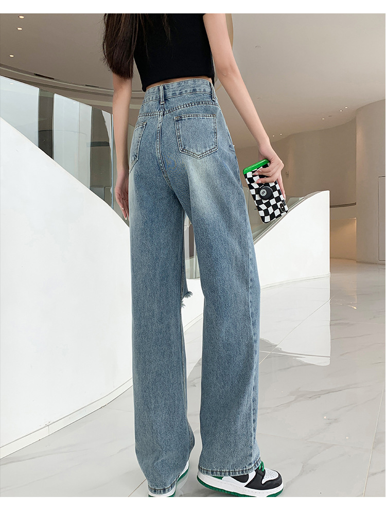 찢어진 스트레이트 청바지 여자 여름 2024 새로운 높은 허리 스파이스 소녀 튀긴 거리 느슨한 슬림 와이드 다리 바지