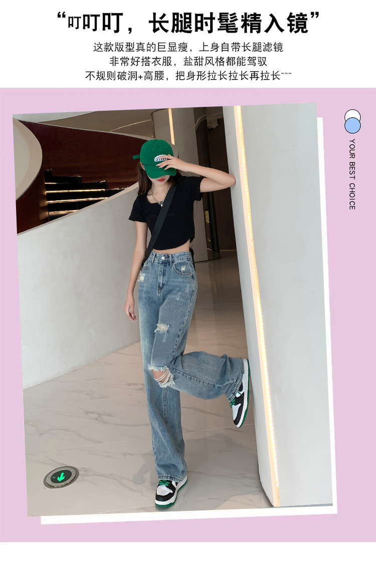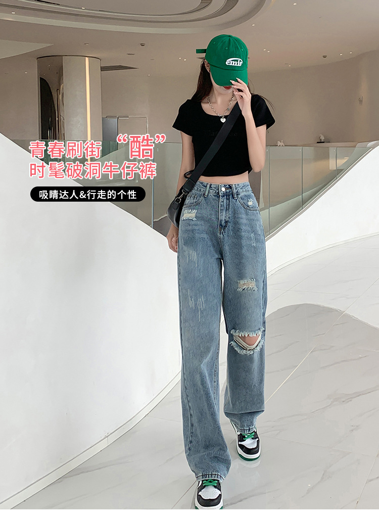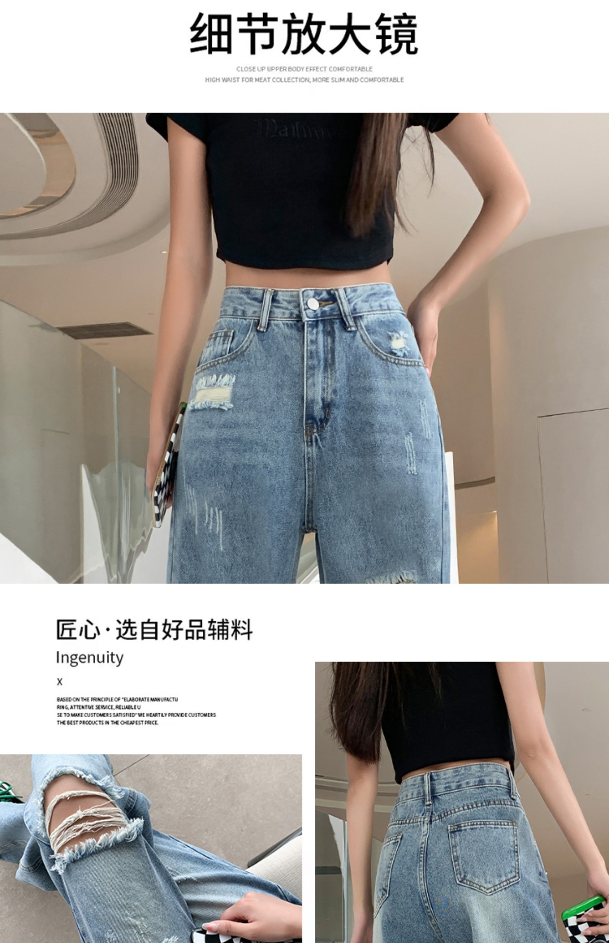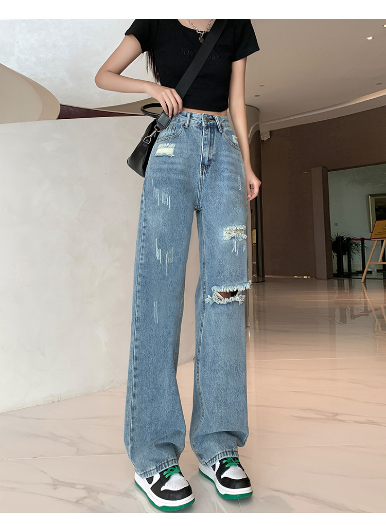 찢어진 스트레이트 청바지 여자 여름 2024 새로운 높은 허리 스파이스 소녀 튀긴 거리 느슨한 슬림 와이드 다리 바지스토어 가기