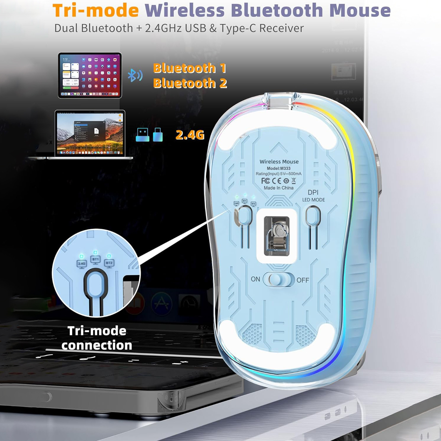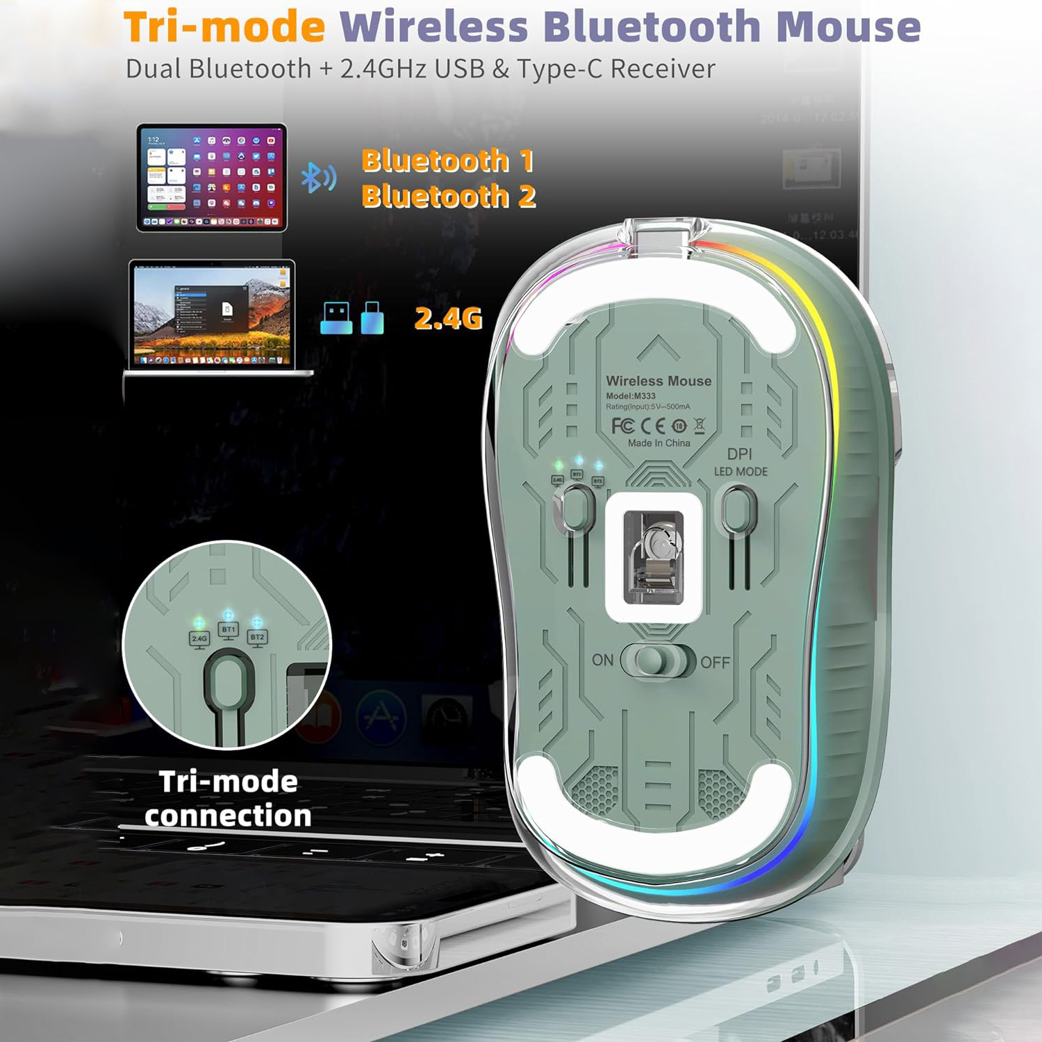 1 x M333 Wireless Mouse(2.4G+BT5.1+BT5.1)