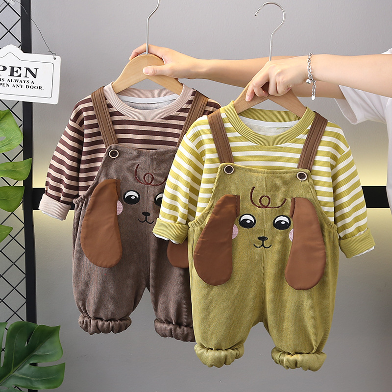 소년의 세련된 가을 세트 봄과 가을 새로운 세련된 잘 생긴 줄무늬 개 스트랩 긴 소매 투피스 세트스토어 가기