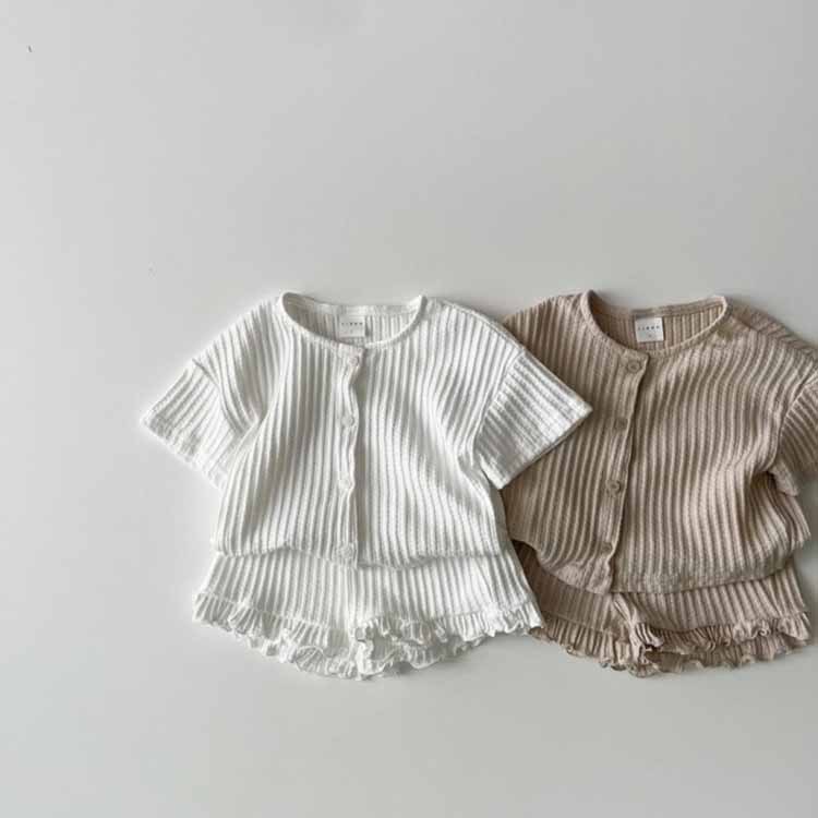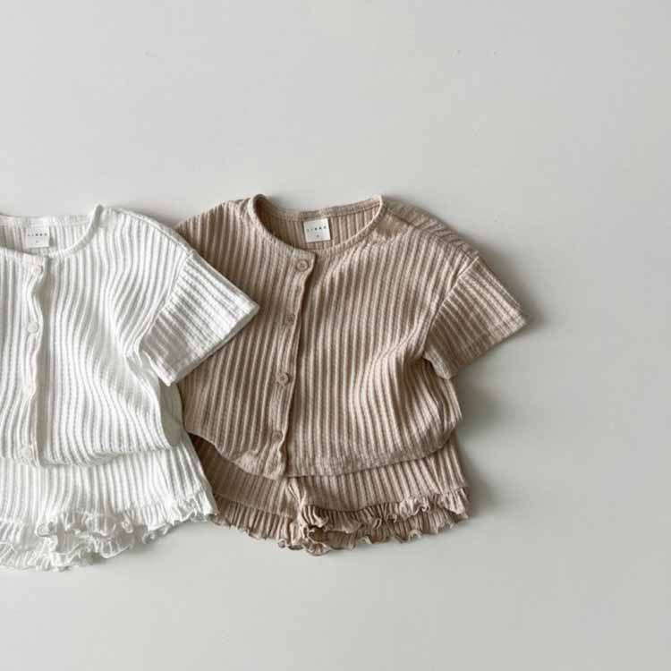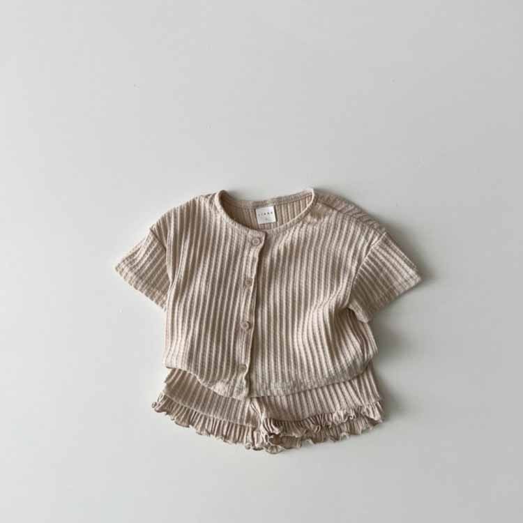 한국식 여름 남성과 여성 아기 줄무늬 투피스 서양식 반팔 카디건 재킷 반바지 어린이 투피스