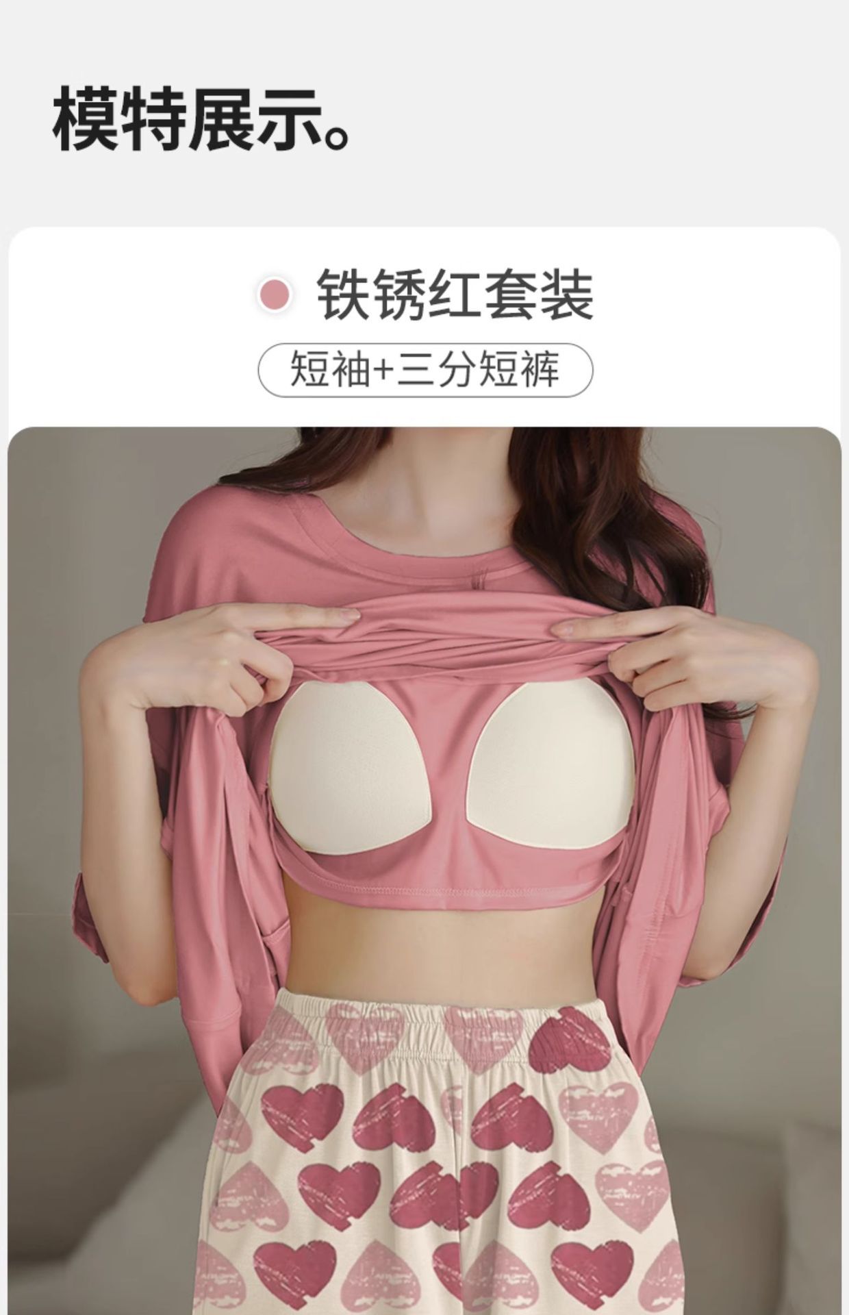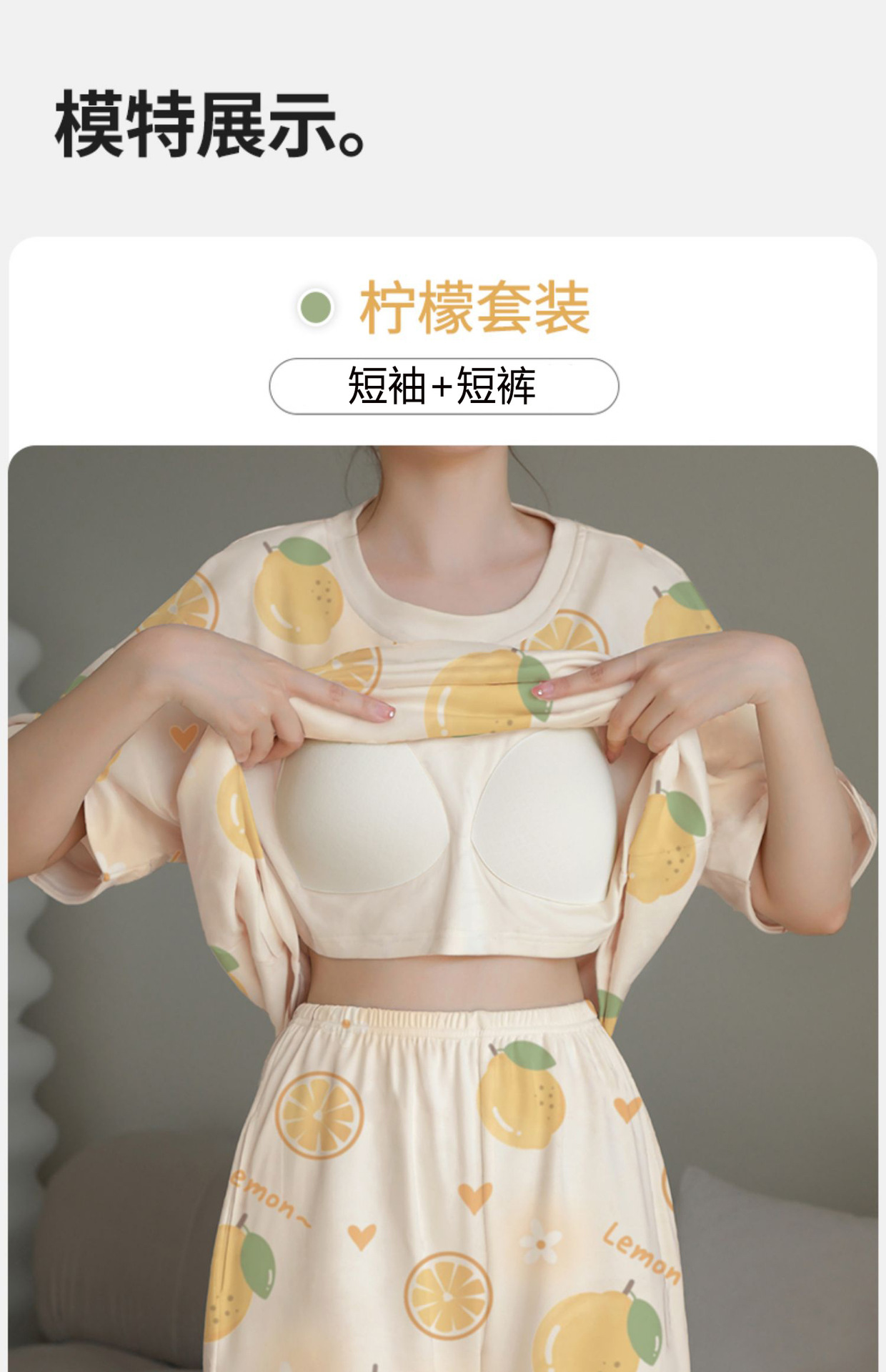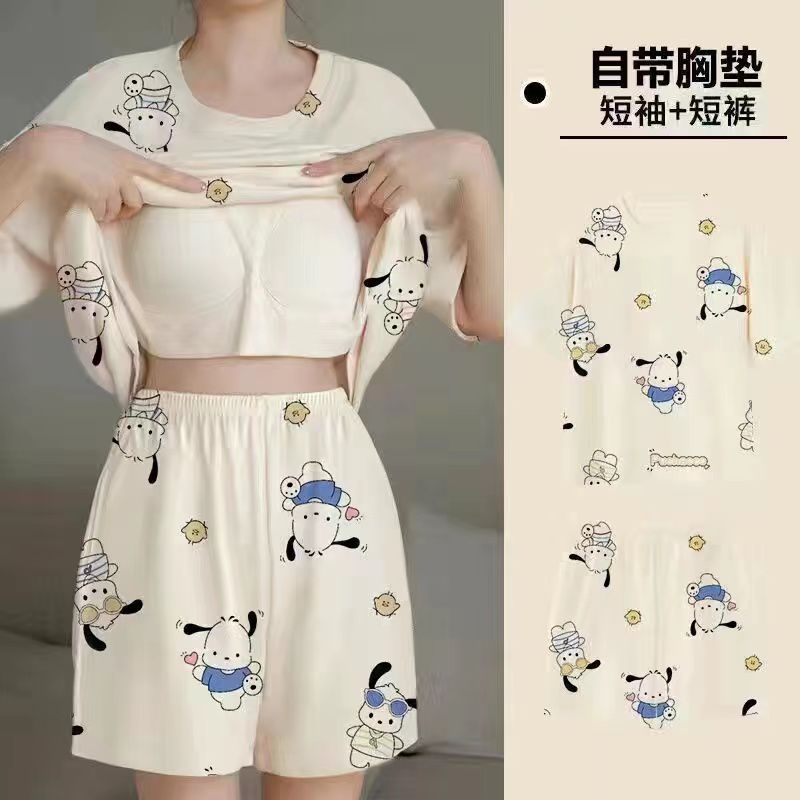 가슴 패드가 달린 원피스 잠옷 여성 여름 반팔 반바지 한국 스타일 만화 귀여운 달콤한 소녀의 캐주얼 홈 옷스토어 가기