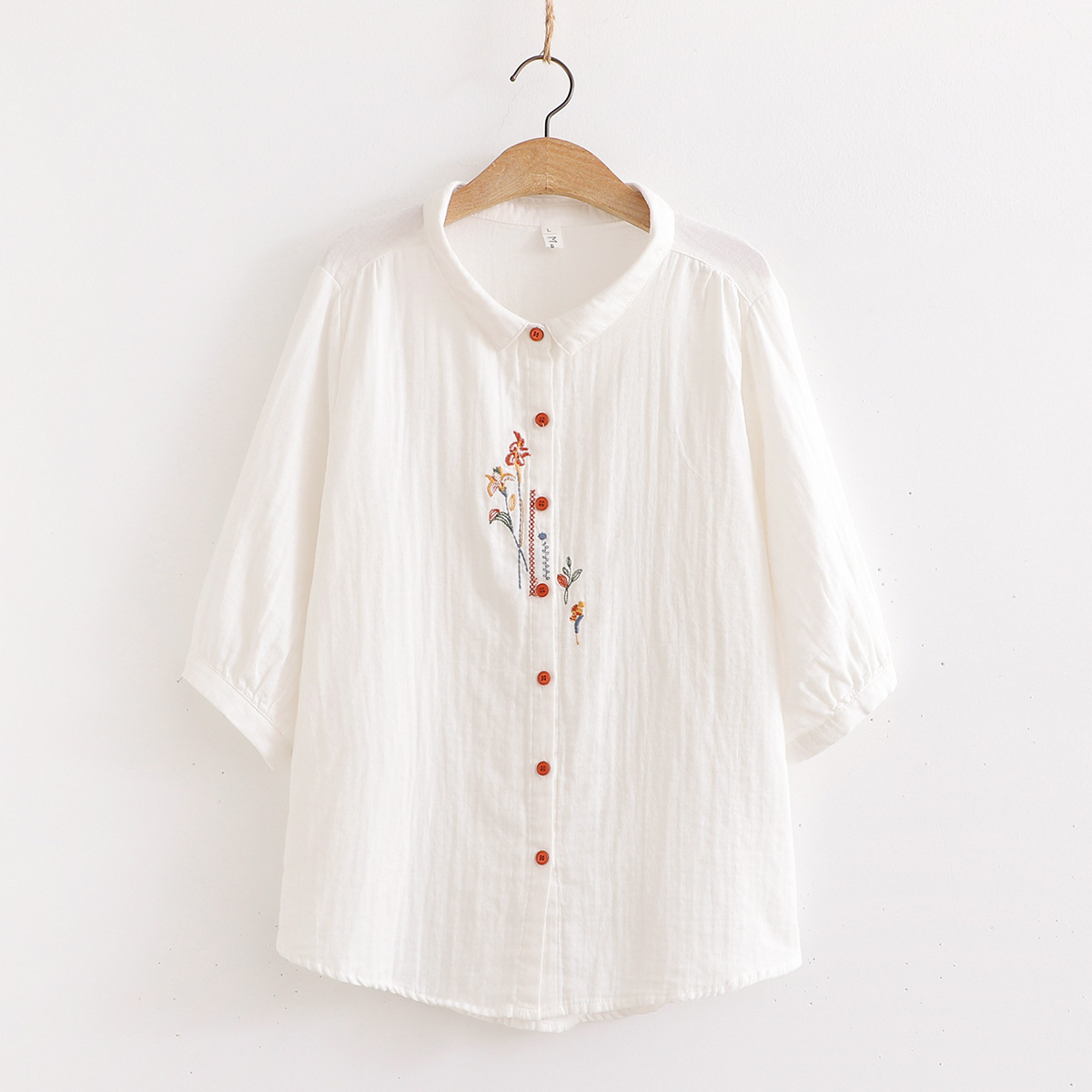 일본 모리 소녀 꽃 자수 통기성 면사 7 소매 셔츠 느슨한 슬림 탑 도매스토어 가기