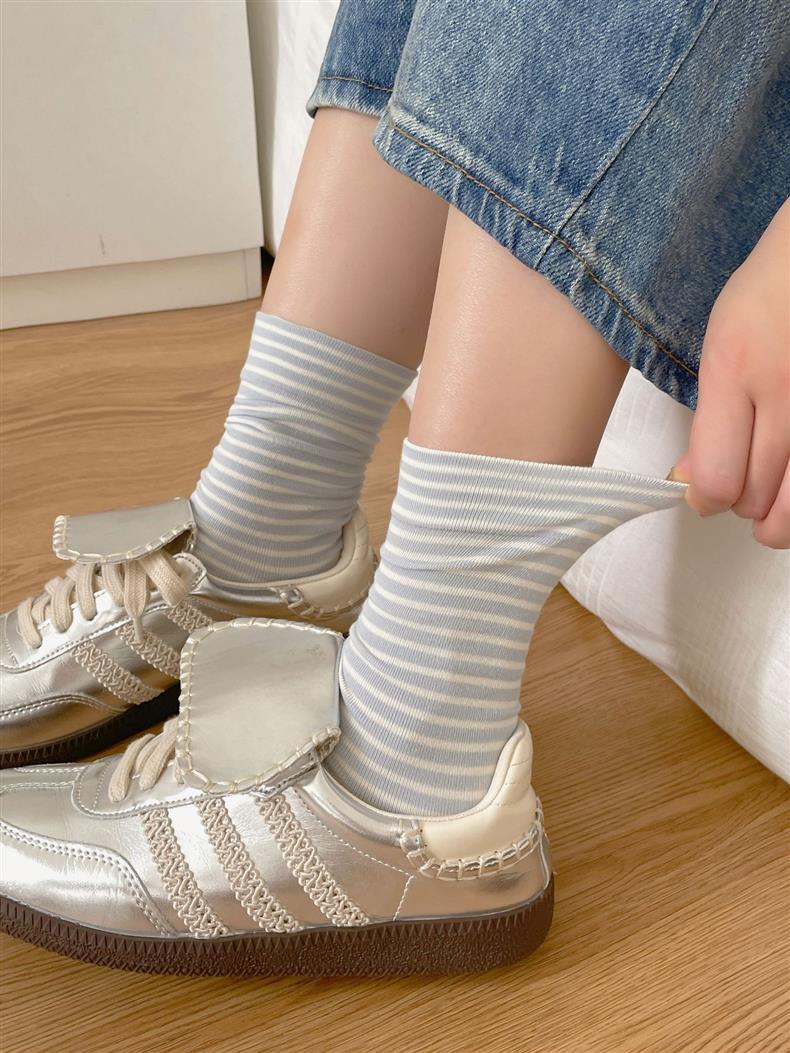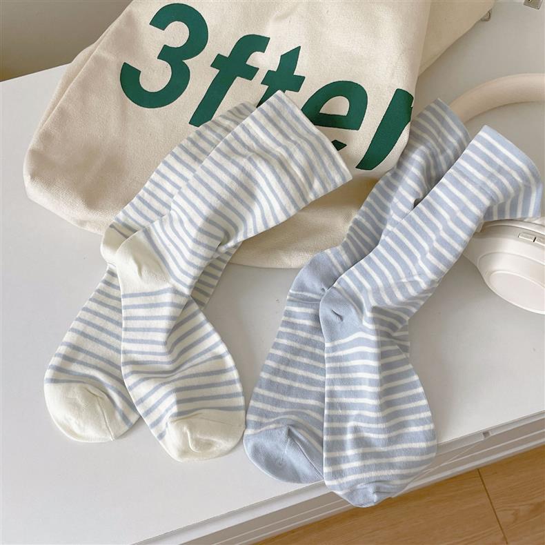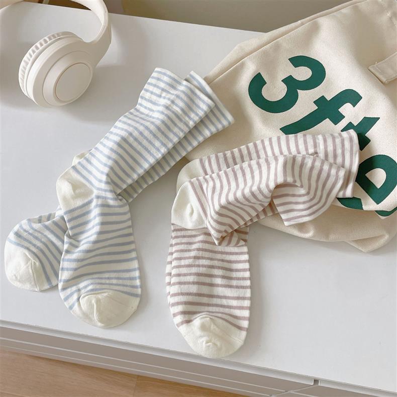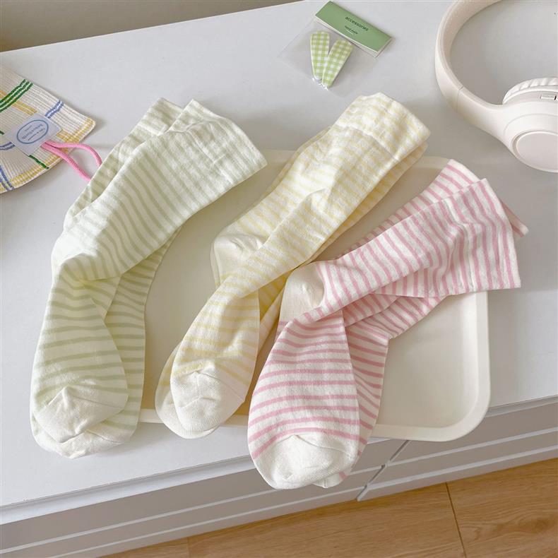 크림 스트라이프 양말 어린이 중간 길이 양말 봄 및 여름 얇은 간단한 정보 유행 한국 스타일 학생 일본식 여름 스타킹스토어 가기