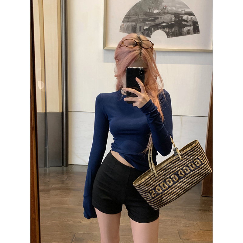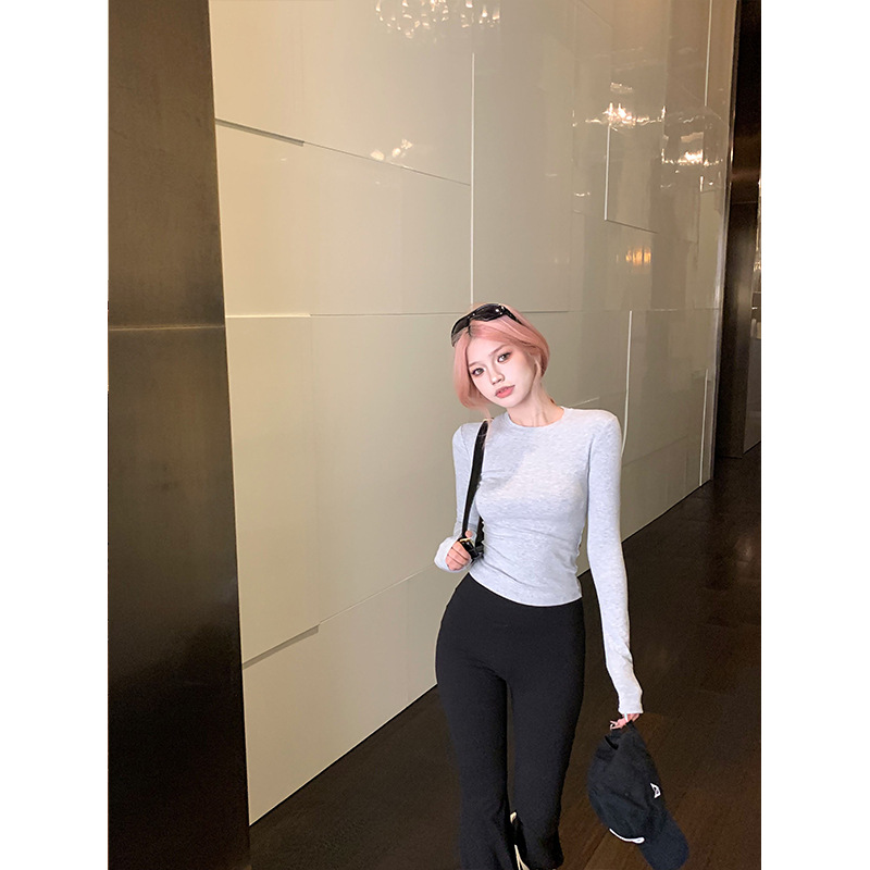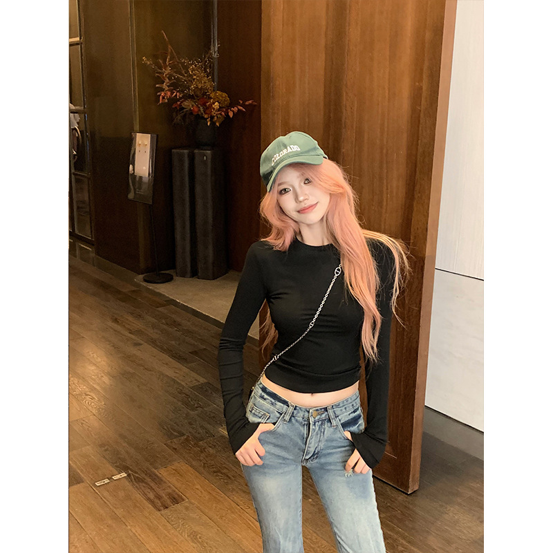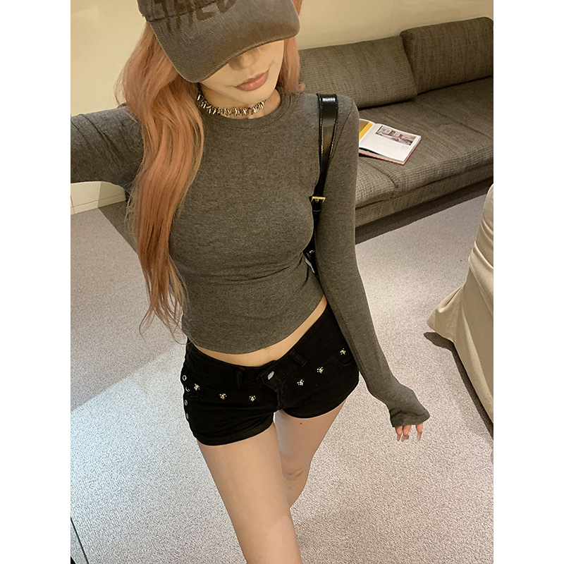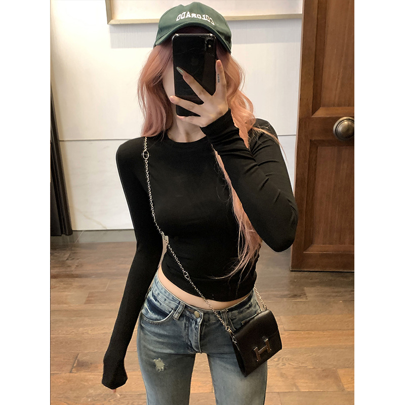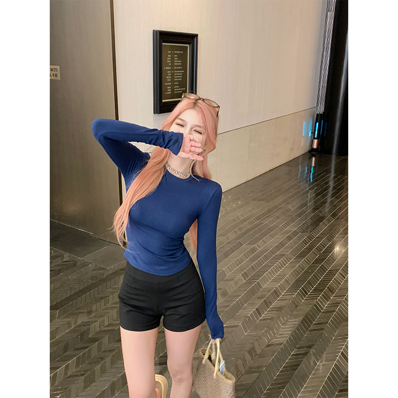 국경을 넘나드는 동남아시아 핫걸 핀치 웨이스트 숄더 숏 티셔츠 긴팔 여성 라운드넥 슬림핏 탑 62220
