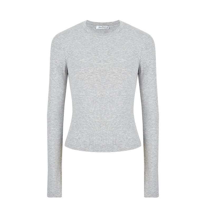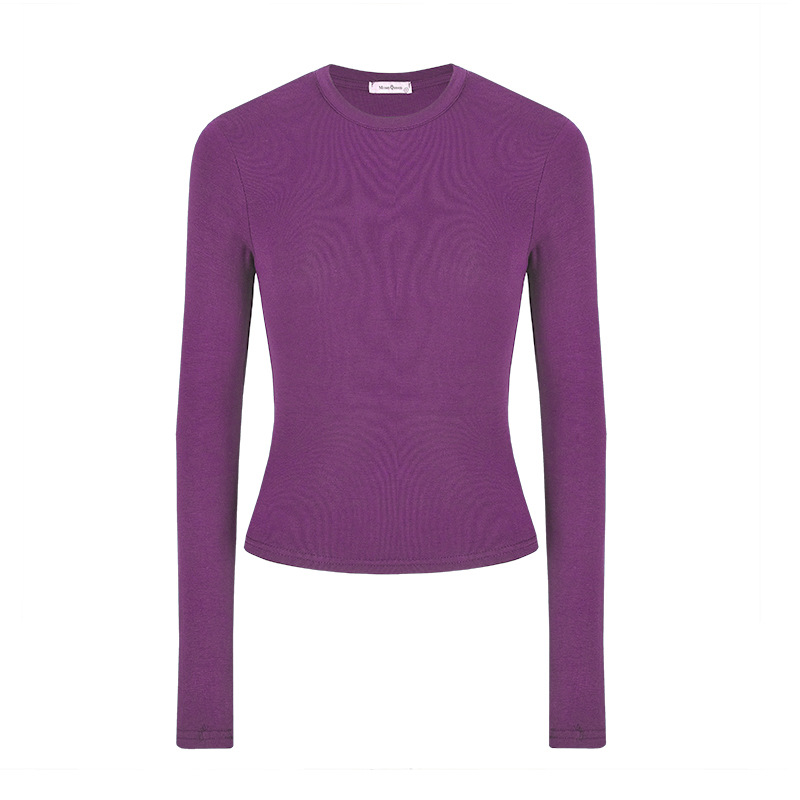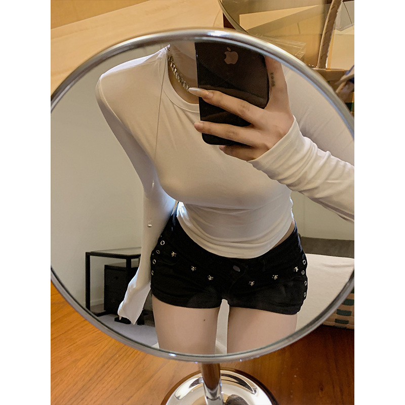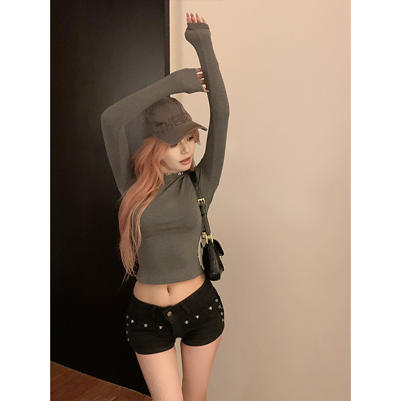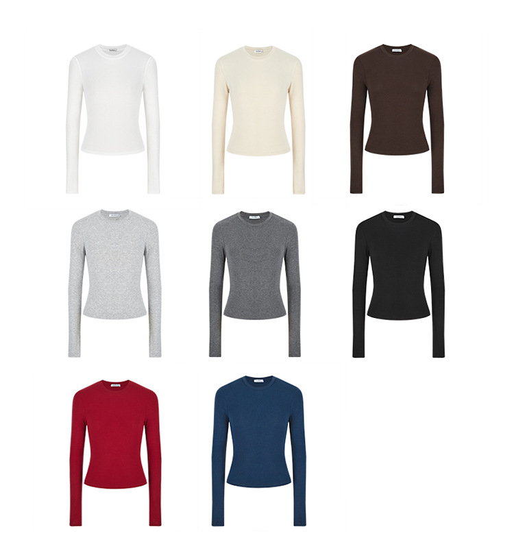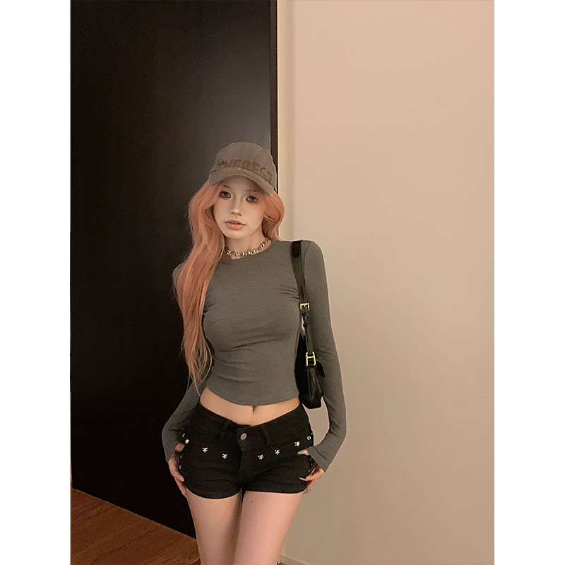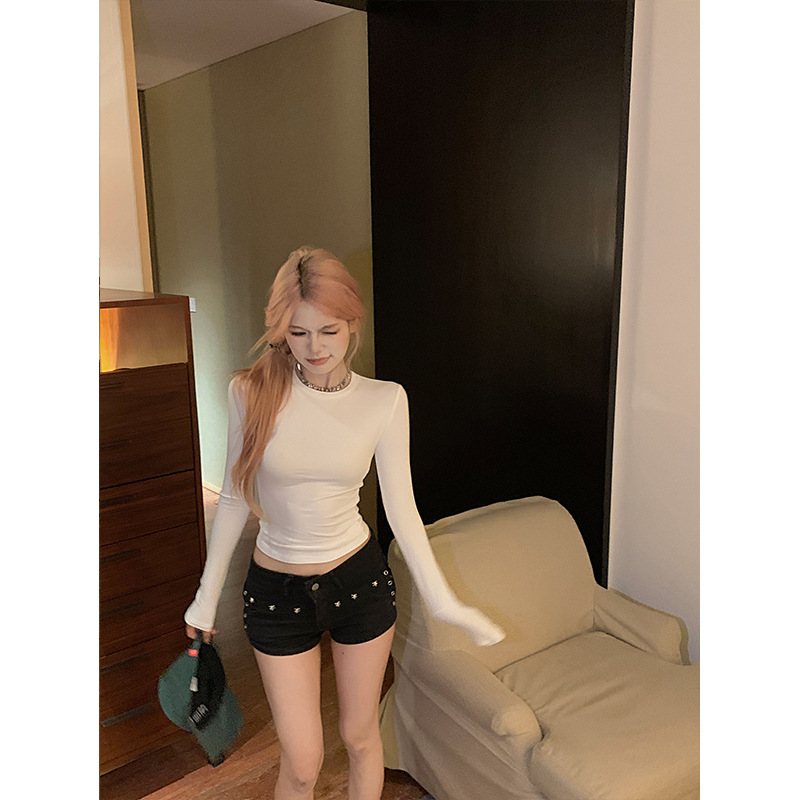 국경을 넘나드는 동남아시아 핫걸 핀치 웨이스트 숄더 숏 티셔츠 긴팔 여성 라운드넥 슬림핏 탑 62220